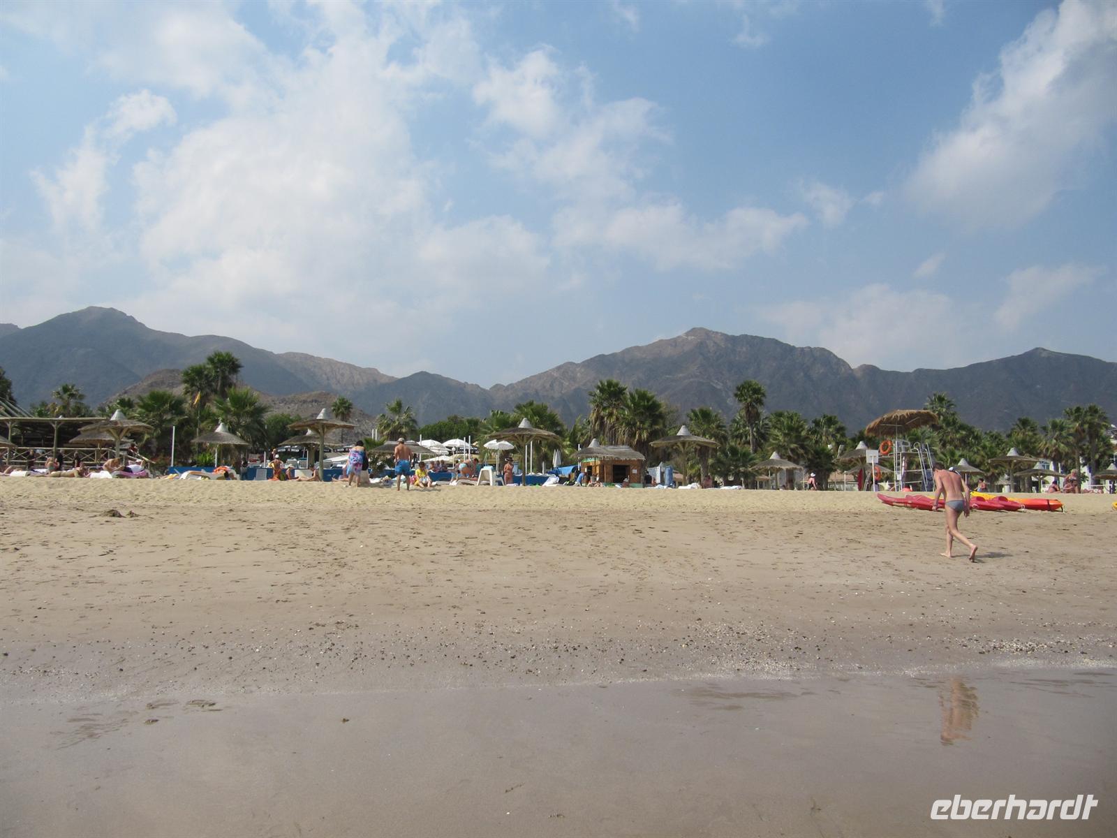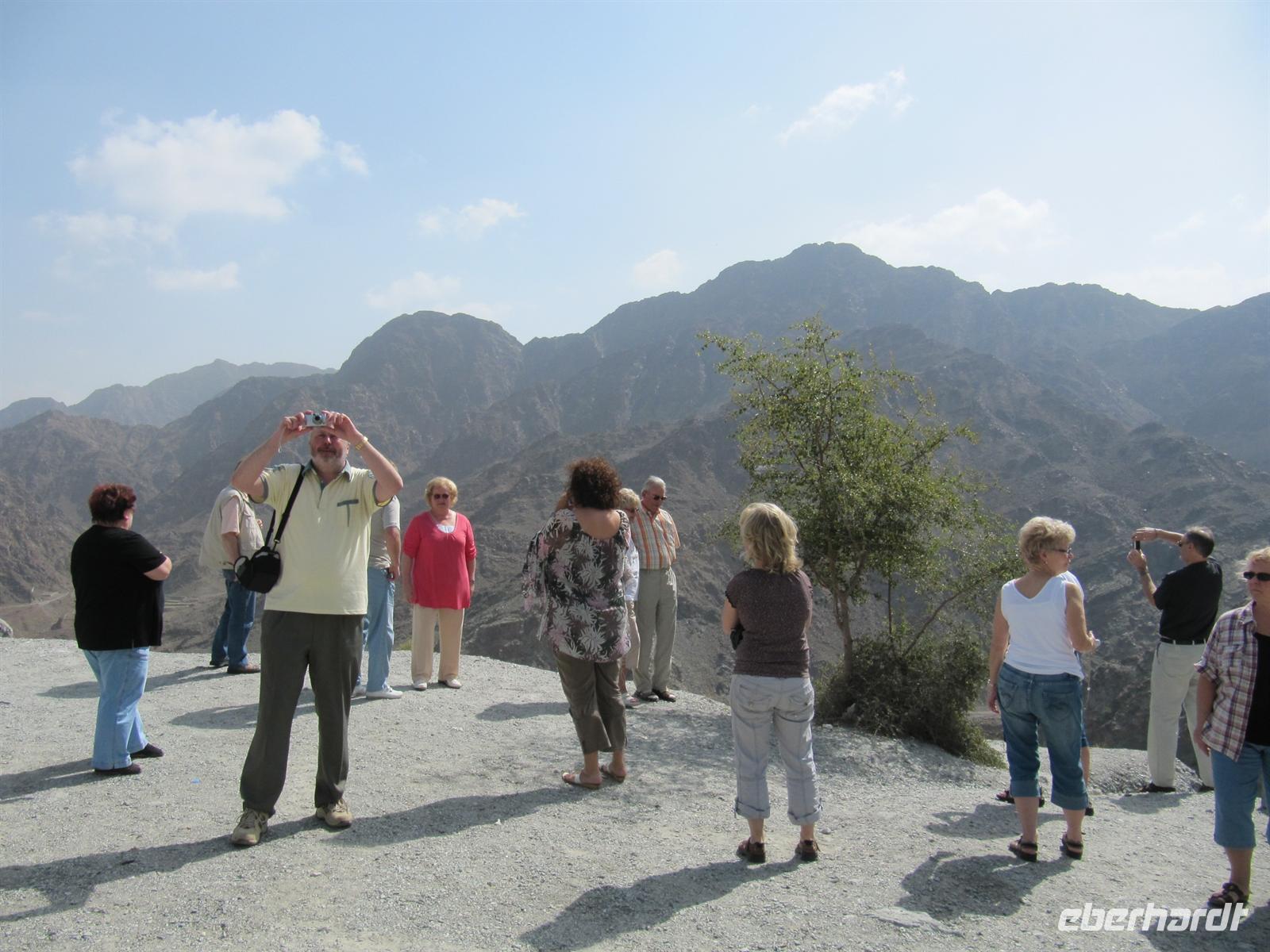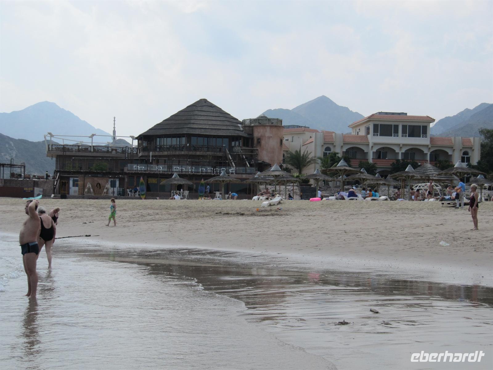 Flussbetten und fuhren durch das Emirat Fujeirah. Gegen Mittag erreichten wir den Golf von Oman. Im Sandy Beach Hotel direkt am Strand erwartete uns ein schmackhaftes Mittagsbuffet. Gestärkt genossen wir das herrlich warme Wasser des Meeres. Einige schwammen im Meer, andere genossen Sonne oder unternahmen einen Spaziergang am Wasser. Viel zu schnell verging die Zeit und wir mussten wieder in den Bus steigen. Über eine andere Route ging es durch das Hadjagebirge und Fujeirah nach Sharjah. Hier erwartete uns erstmal ein Stau, denn heute war Freitag, der islamische Sonntag und viele Familien waren unterwegs. Etwas Gutes hatte die Verzögerung doch, wir erlebten einen traumhaften Sonnenuntergang. Recht langsam erreichten wir unser Hotel in Dubai, wo wir schon zum Abendessen erwartet wurden. Dieser Ausflug hat uns wieder eine ganz andere Seite der Emirate gezeigt.