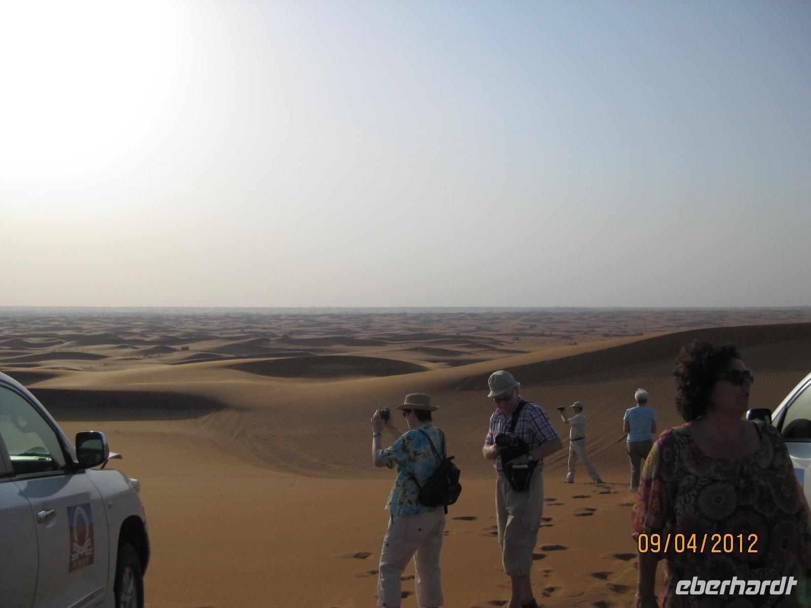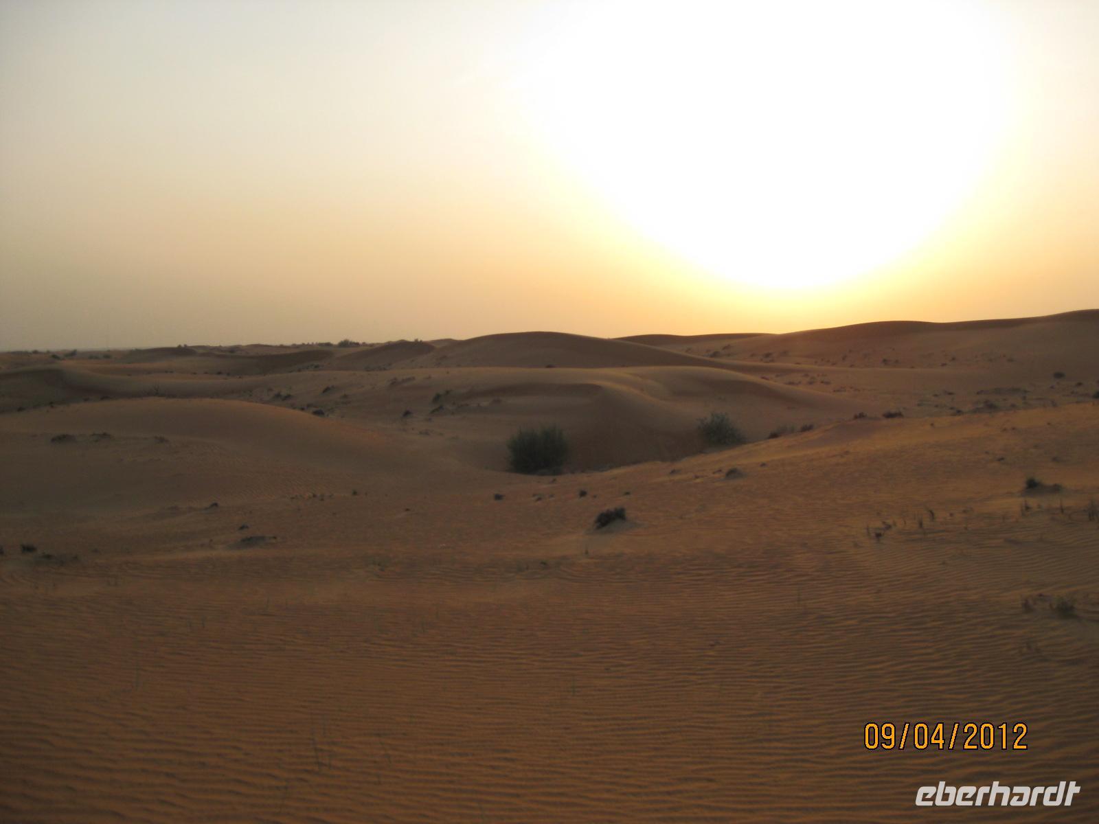Gegen Mittag wieder im Hotel angekommen warteten wir gespannt bis zum Nachmittag, wo uns eine aufregende Wüstensafari erwartete. Vor dem Hotel fuhren am frühen Nachmittag weiße Jeeps vor und in Gruppen von 6 Personen verteilten wir uns auf die Autos. Nun konnte es losgehen und wir konnten es kaum noch erwarten. Nach kurzer Fahrtstrecke erreichten wir die Wüste außerhalb der Stadt. Weit und breit rot eingefärbte Sanddünen, welche sich ins Unendliche erstreckten. Unser Abenteuer begann. Hoch und runter ging es für uns durch diese atemberaubende Landschaft. Unsere sicherheitsbedachten Fahrer gaben alles, um uns ein Spektakel zu bieten, was wir nicht so schnell vergessen werden. Ein besonderes Highlight war das gemeinsame Genießen des Sonnenuntergangs in der Wüste. Nach dem aufregenden Fahrerlebnis kehrten wir im Wüstencamp ein. Im Wüstencamp genossen wir ein landestypisches Barbecue und erlebten kleinere Showeinlagen, wie etwa eine Buachtänzerin.