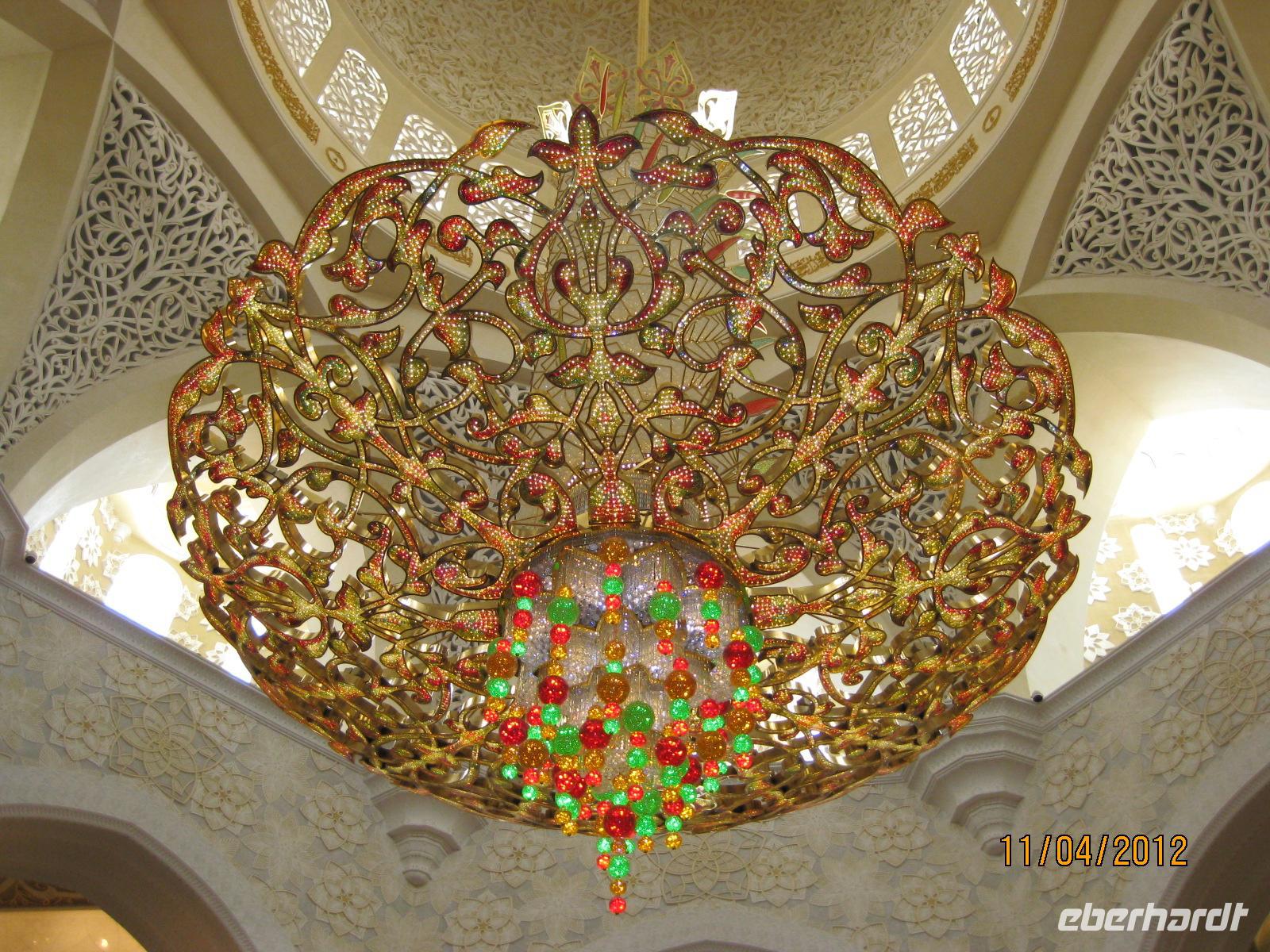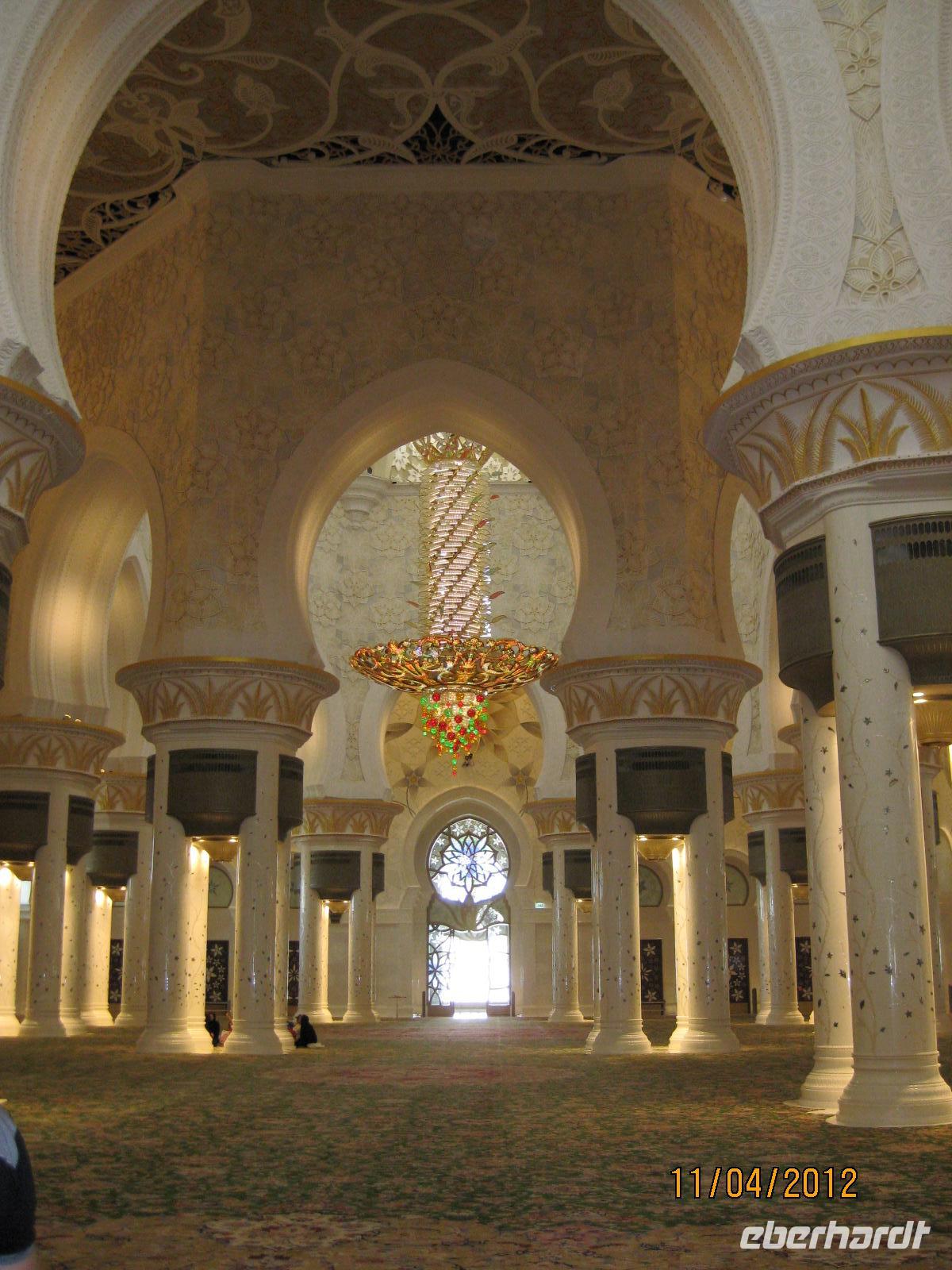 Von der Sonne geweckt machten wir uns heute am frühen Morgen auf den Weg nach Abu Dhabi. Nach etwa zwei Stunden Fahrt erreichten wir die drittgrößte Moschee der Welt, die Sheikh-Zayed-Moschee. Die gewaltige weiße Moschee erstrahlte mit Ihren Goldenen Kuppeln in der Sonne. Der Zutriit in die Moschee ist nur getrennt geschlechtrig möglich. Zudem gehörte es dazu, dass wir Frauen uns komplett verschleierten. Umhüllt und wieder vereint wandelten wir über weichen Teppich durch die Moschee und ließen uns von der Schönheit der Moschee in den Bann ziehen.