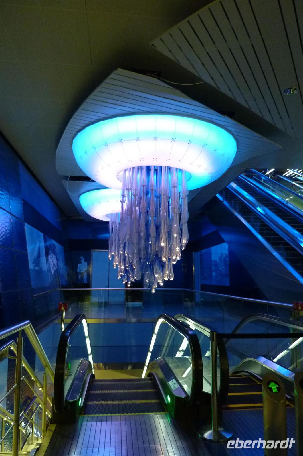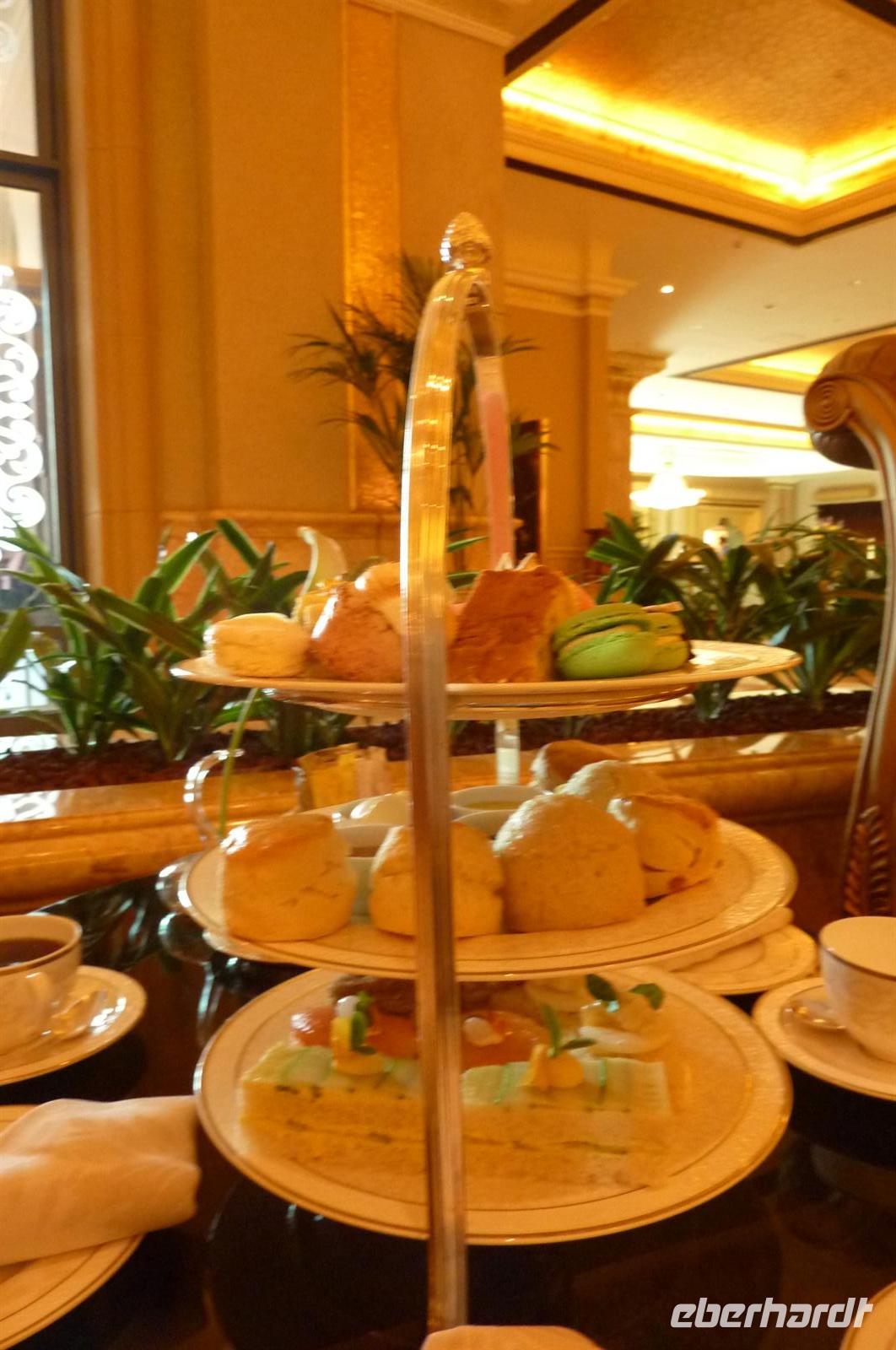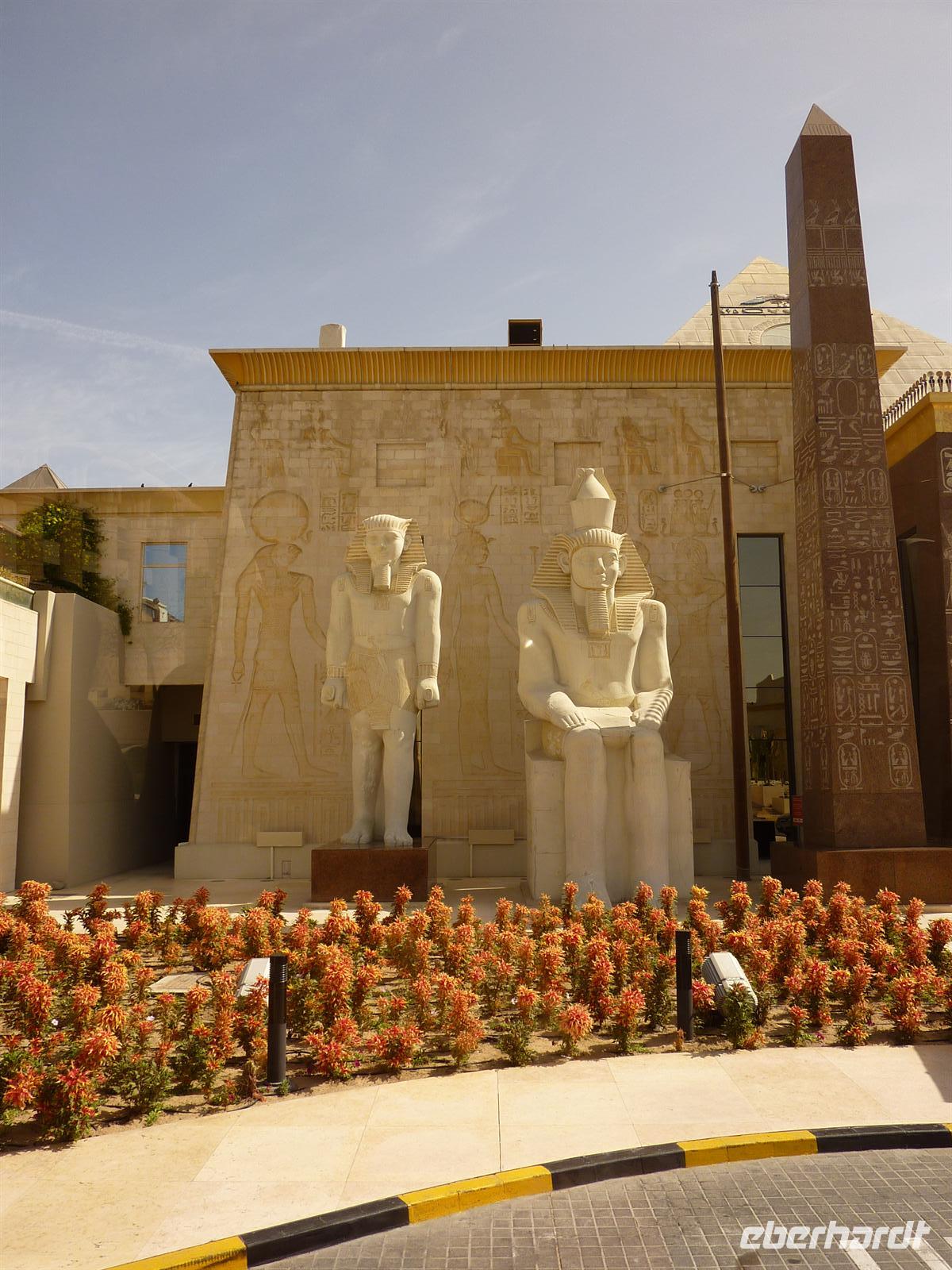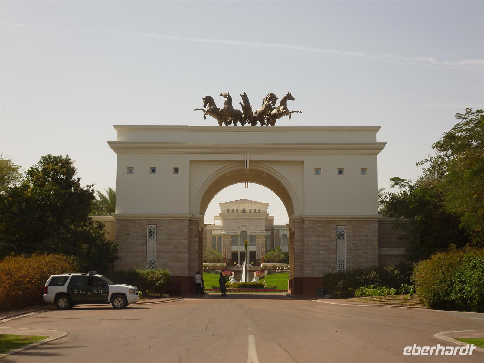 Heute konnten wir alle etwas länger schlafen und uns von dem erlebnisreichen, gestrigen Tag etwas erholen. Ein Teil meiner Gruppe hatte heute ein Mittagessen in DEM Luxushotel schlechthin gebucht, im legendären Burj al Arab. Alle machten sich besonders schick und voller Vorfreude ging es auch schon los. Nach einer halben Stunde Fahrtzeit standen wir dann endlich davor. Einfach riesig und sehr beeindruckend, wenn man sich dieses Hotel aus der Nähe anschauen kann. Ohne Probleme passierte unser Bus das Gate und wir fuhren bis vor die Tür. Wir gingen rein und allein die Lobby war schon ein Augenschmaus. Die Farbenpracht der Teppiche gegen die der Decke, alles strahlte um die Wette. Dann fuhren wir mit der Rolltreppe in den ersten Stock, wo sich unser Restaurant befand. Da noch ein paar Minuten Zeit war, nutzten wir schon mal die Gelegenheit und schauten uns um. Und kamen aus dem Staunen nicht mehr heraus. Überall Gold und man spiegelte sich dreifach in den Wänden. Mit dem Glas-Fahrstuhl ging es einmal nach ganz oben und wir konnten sogar die Palmeninsel mit dem Hotel Atlantis erkennen. Aber nun ging es erstmal zum Buffet. Das Restaurant öffnete seine Pforten und wir wurden würdig empfangen. Und es gab wirklich alles, was das Herz begehrte. Austern, Shrimps, Salate aller Art, Muscheln, Fleisch aller Art, Suppen und so weiter. Es blieben keine Wünsche offen und keine Mägen leer.
