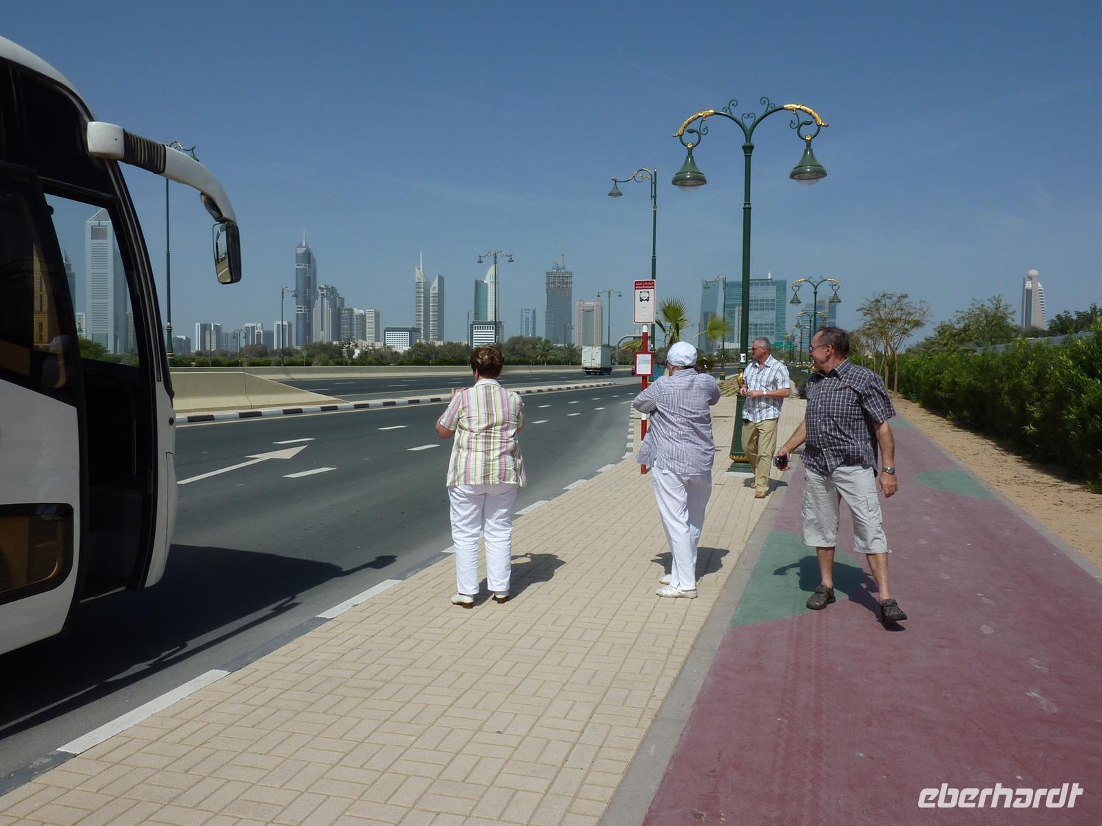 Es war Freitag und das Wetter in Deutschland war leicht regnerisch und kalt. Was gibt es also schöneres an diesem Tag mit Eberhardt TRAVEL nach Dubai zu fliegen? AM Flughafen Dresden begrüßte ich die erste Hälfte meiner Gruppe, alle waren gut gelaunt und in Gedanken schon bei 30 Grad und Sonne. Alle waren pünktlich und da ich die Gruppe am Vorabend schon online eingecheckt hatte, mussten wir nur noch unsere Koffer aufgeben. Dann fuhren wir eine Etage nach oben und stärkten und bei einem kleinen Frühstück. Mit kurzer Verspätung ging es dann von Dresden und Leipzig nach Frankfurt. Dort nahm ich dann Frau Bothe in Empfang. Auch die Leipziger Gäste kamen daraufhin mit etwas Verspätung an. Endlich war meine Gruppe komplett. Frohen Mutes ging es nun an Bord der Boing 747 der Lufthansa. Nach 6 Stunde Flugzeit, die wir mit essen, trinken, schlafen und/oder lesen verbrachten, kamen wir in Dubai an. Nachdem wir unsere Koffer ALLE abgeholt und durch die Passkontrolle passiert hatten, erwartete uns Martina bereits am Ausgang. Sie lebt seit 17 Jahren in Dubai und ist für die nächsten 10 Tage unsere örtliche Reiseleiterin.