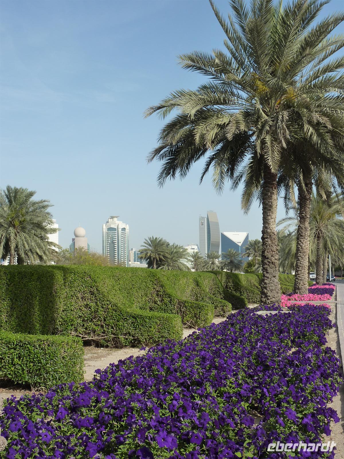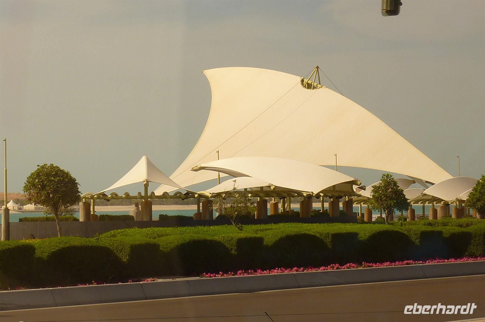 Gestärkt von einem reichhaltigen Frühstück erwartete uns heute die Hauptstadt und Regierungssitz der Vereinigten Arabischen Emirate, Abu Dhabi. Mit dem Bus hatten wir ca. 150km zurückzulegen und konnten links und rechts eine Menge entdecken. Zum Beispiel ist der Übergang von Dubai nach Abu Dhabi sehr markant. Plötzlich sind entlang derAutobahn über hundert Kilometer Palmen angepflanzt, die alle bewässert werden müssen. Und auch die Straßenlaternen wirken etwas prunkvoller. Abu Dhabi hat eben etwas mehr Geld als Dubai. Wobei viele meiner Gäste die Bauten in Dubai viel stilvoller finden. Ist eben Geschmackssache. Nachdem uns Martina eine ganze Menge Wissenswertes und Interessantes über Abu Dhabi erzählt hat, ist auch unser erstes Highlight nicht mehr weit: der Besuch der drittgrößten Moschee der Welt. Das weiße Gebäude ist sehr imposant und wirkt vor dem strahlend blauen Himmel wie gemalt. Das nutzten wir gleich aus und stellten uns alle parat für ein Gruppenfoto. „Lääääääächelllln!“ - und zack war es im Kasten. Bevor es aber in die Moschee hinein geht, müssen die Frauen eine typische Abaja tragen, das heißt ein schwarzes, langes Kleid und ein Tuch. Es war für jeden ein Spaß seine Frau oder seinen Mann wieder zu erkennen, aber es klappte. Jeder hatte nun individuell Zeit für Besichtigungen und Fotos.
