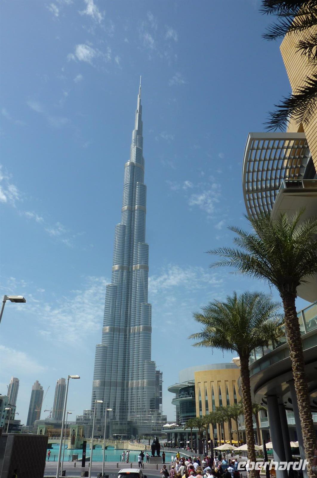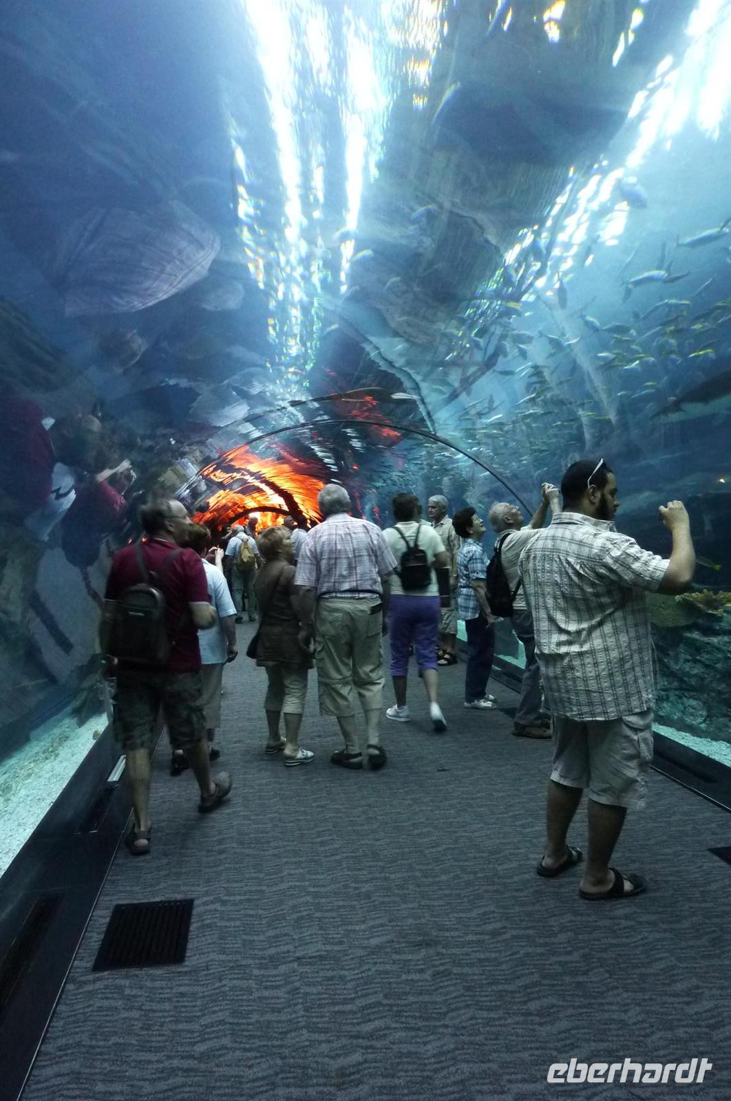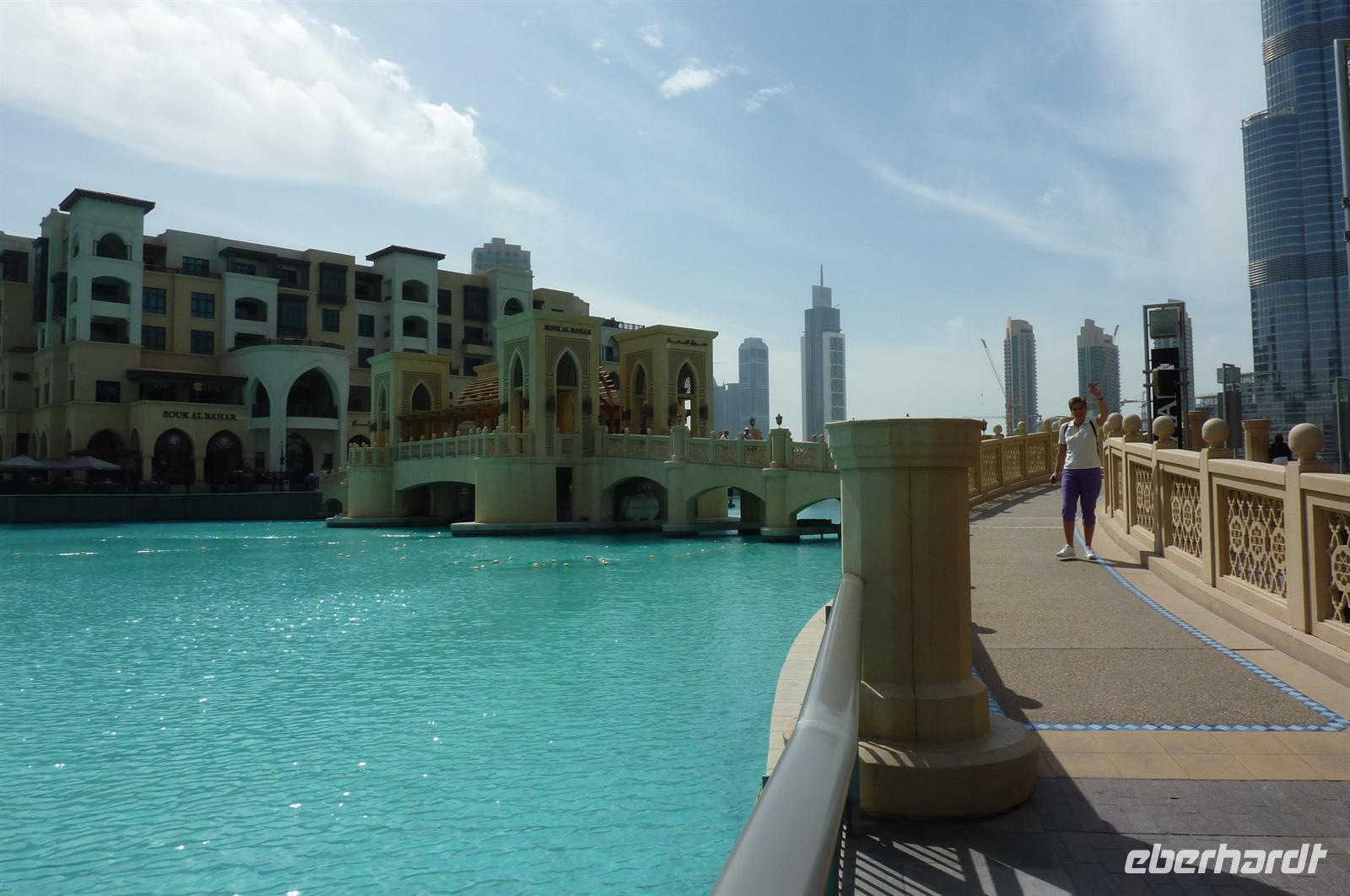 Gut gestärkt von einem leckeren Frühstück brachen wir gegen zehn auf und schlenderten durch die Gassen, die Souks waren geöffnet und jeder Händler wollte seine Waren an den Mann bringen. Es war noch wenig los in den Straßen, so dass alle gut beieinander blieben und trotzdem jeder etwas schauen konnte. Wir liefen Richtung Dubai Creek, um mit einer typischen Dhau zum anderen Stadtteil überzusetzen. Eine etwas wackelige Angelegenheit, aber der Blick ringsherum war sehr schön. Nach einer kurzen Fahrt stiegen wir aus und waren auch schon mitten im Gewürz-Souk. Martina erklärte uns einige landestypische Gewürze und gab uns hilfreiche Tipps zum Einkaufen auf den Souks. Handeln ist hier die Devise. Wir bummelten durch die Gassen, es duftete nach Weihrauch und hunderten von Gewürzen. Typisch arabisch eben. Weiter ging es in Richtung Gold Souk. Ein paar meiner Gäste hatten sich schon förmlich Einkaufszettel gemacht, was unbedingt besorgt werden muss für die Daheimgebliebenen. Nach über einer Stunde Zeit, war jeder zufrieden und glücklich - auch die nichts gekauft haben. Wir liefen noch ein paar Meter und stiegen in den Bus, der bereits auf uns wartete. Die Fahrt ging nun weiter zur Dubai Mall. Nachdem etwas Zeit war um zu essen oder einfach nur durch die Mall zu spazieren, trafen wir uns, um ins Dubai Aquarium zu gehen. Man fühlte sich wie unter Wasser, überall sah man die kuriosesten Fischarten. Auf einer Hängebrücke fühlte man sich dann nicht mehr wie in Dubai, sondern wir im Dschungel - mitten in der Wüste. Doch nun erwartete uns der Höhepunkt des Tages: die Auffahrt in den 828. hohen und damit höchsten Turm der Welt, dem Burj Khalifa.