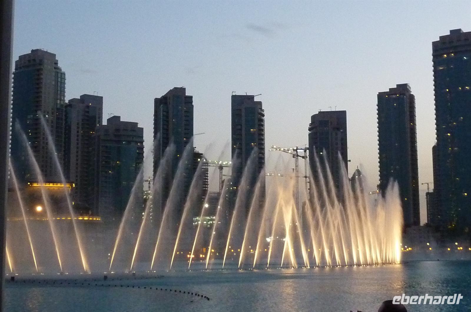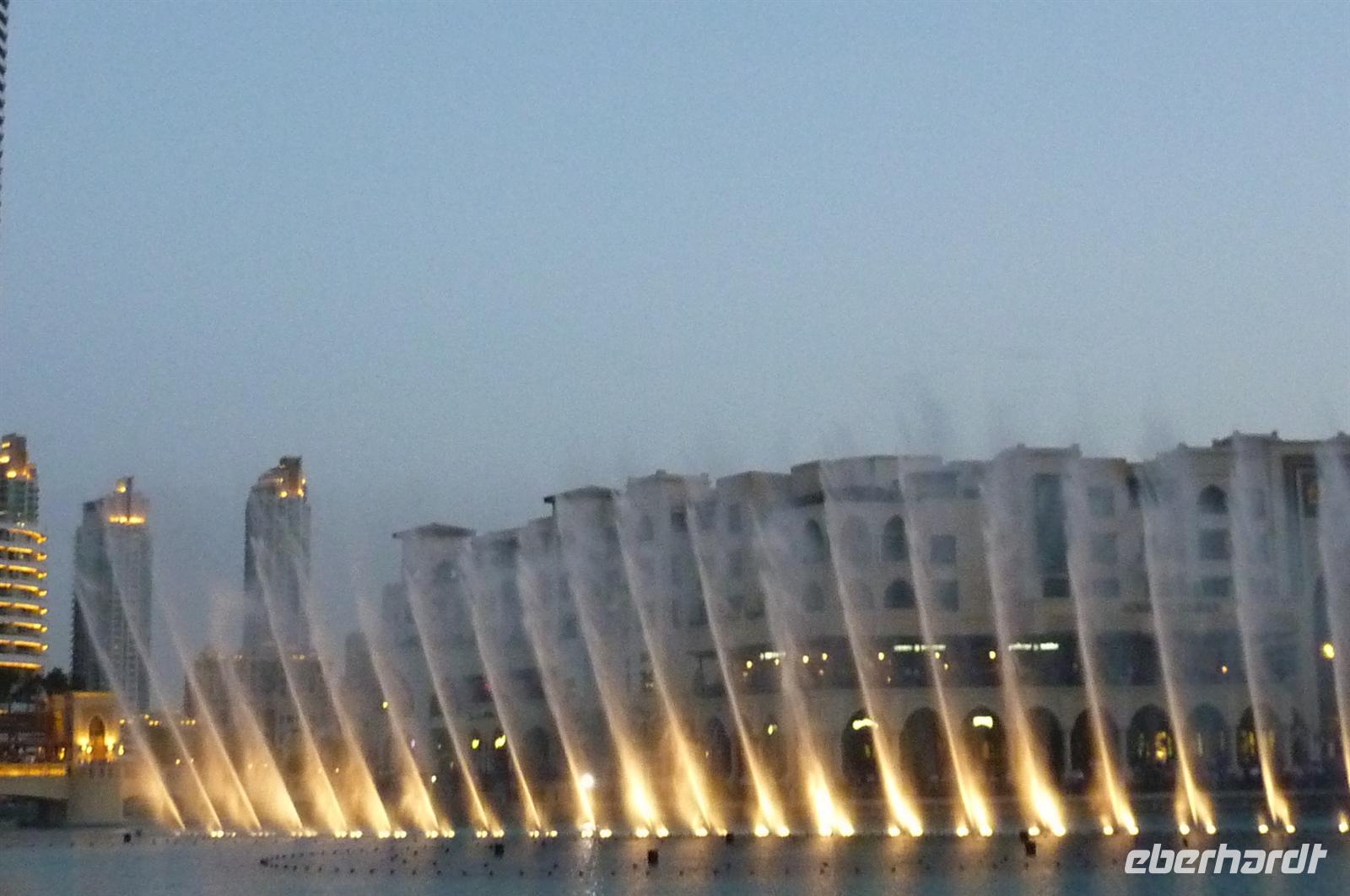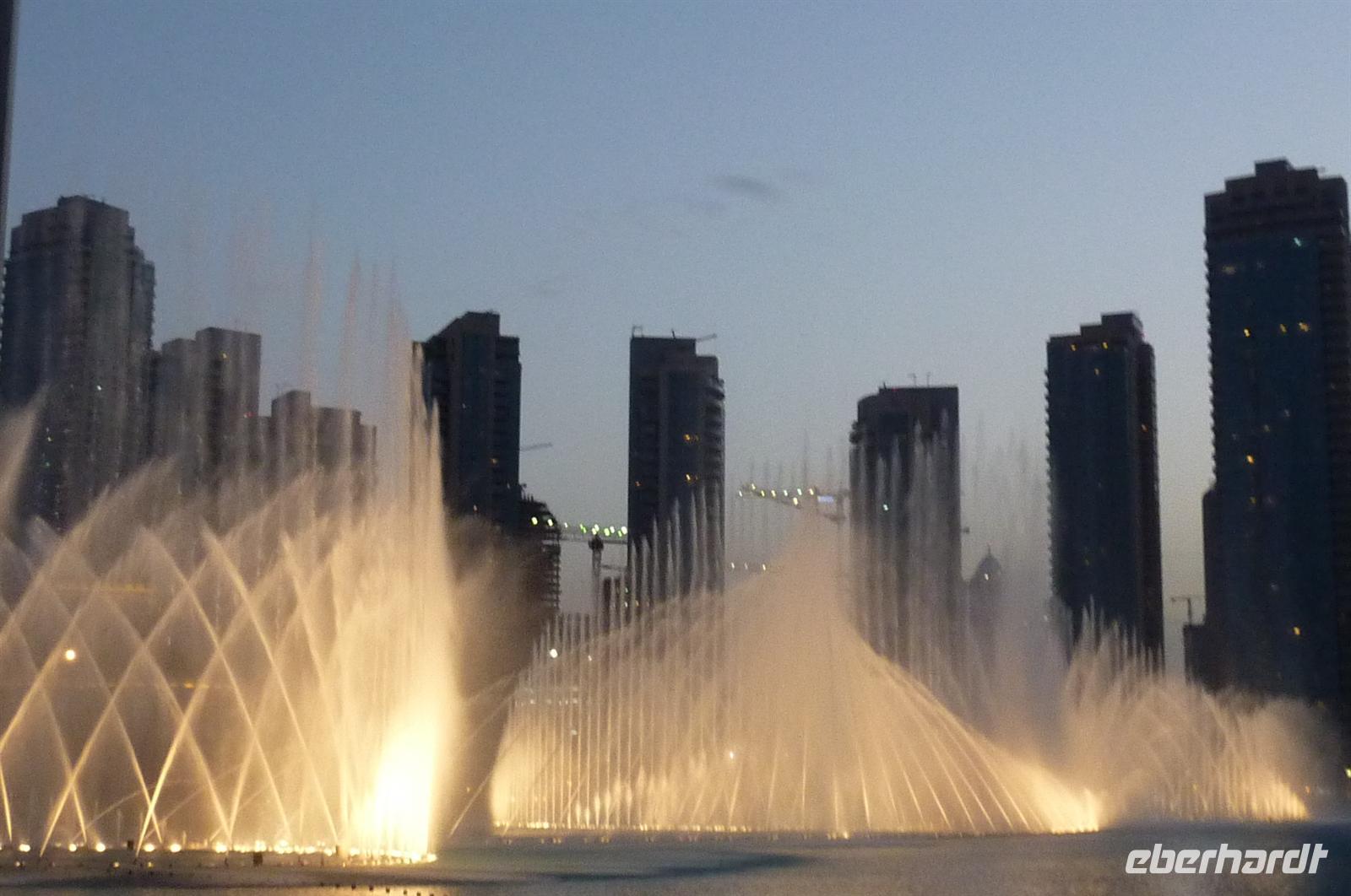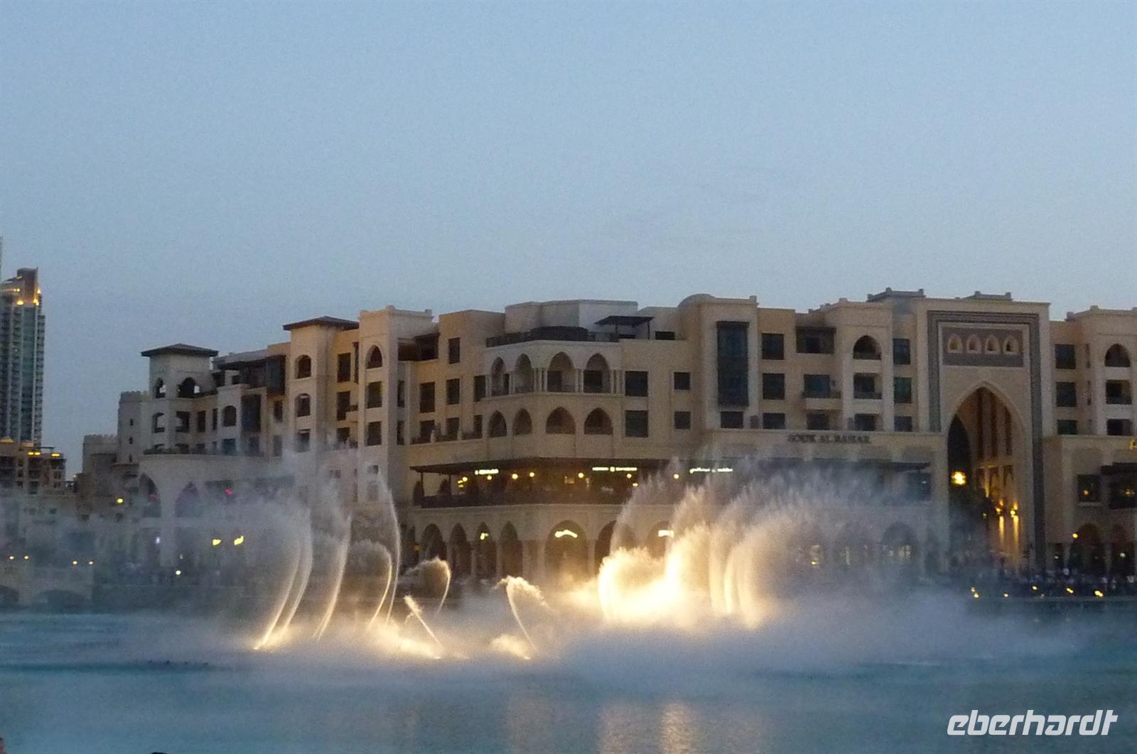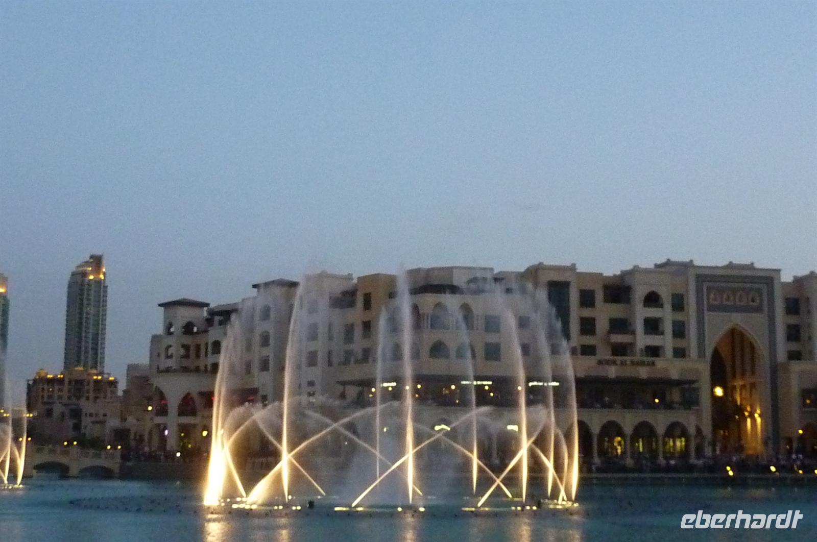 Nach einer strengen Sicherheitskontrolle, fast wie am Flughafen, mussten wir noch ein paar Meter zurücklegen um zu DEM Fahrstuhl zu gelangen. Der Fahrstuhl der uns in den 124. Stock auf 460m fahren sollte. Die Fahrt dauerte nicht mal eine Minute, es knackste zweimal in den Ohren und schon waren wir angekommen. Uns eröffnete sich ein traumhafter 369 Grad Blick auf Dubai. Wir hatten bei optimalsten Bedingungen eine super Aussicht in alle Himmelsrichtungen. Sogar das Nachbaremitat Sharjah konnte man sehen. Die Kameras liefen wieder heiß, es wurde viel fotografiert. Die Hochhäuser von oben wirkten plötzlich wie kleine Luxus-Legohäuschen, man fühlte sich selbst wie der Scheich über Dubai. Nach einer knappen Stunde fuhren wir wieder auf den „Boden der Tatsachen“ hinunter. Mit tollen Eindrücken, wollten wir diesen erlebnisreichen Tag bei den Wasserspielen am Burj Khalifa ausklingen lassen. Die erste Show begann um 6 und war schon sehr schön. Doch da hatten wir die zweite noch nicht gesehen. Diese folgte dann eine halbe Stunde später und war das Sahnehäubchen des heutigen Tages. ES war schon etwas dunkler geworden und die Wasserspiele wurden mit Licht untersetzt. Die richtige Musik dazu, ließ uns Gänsehaut bekommen.