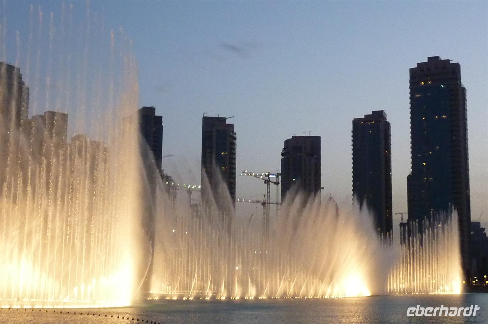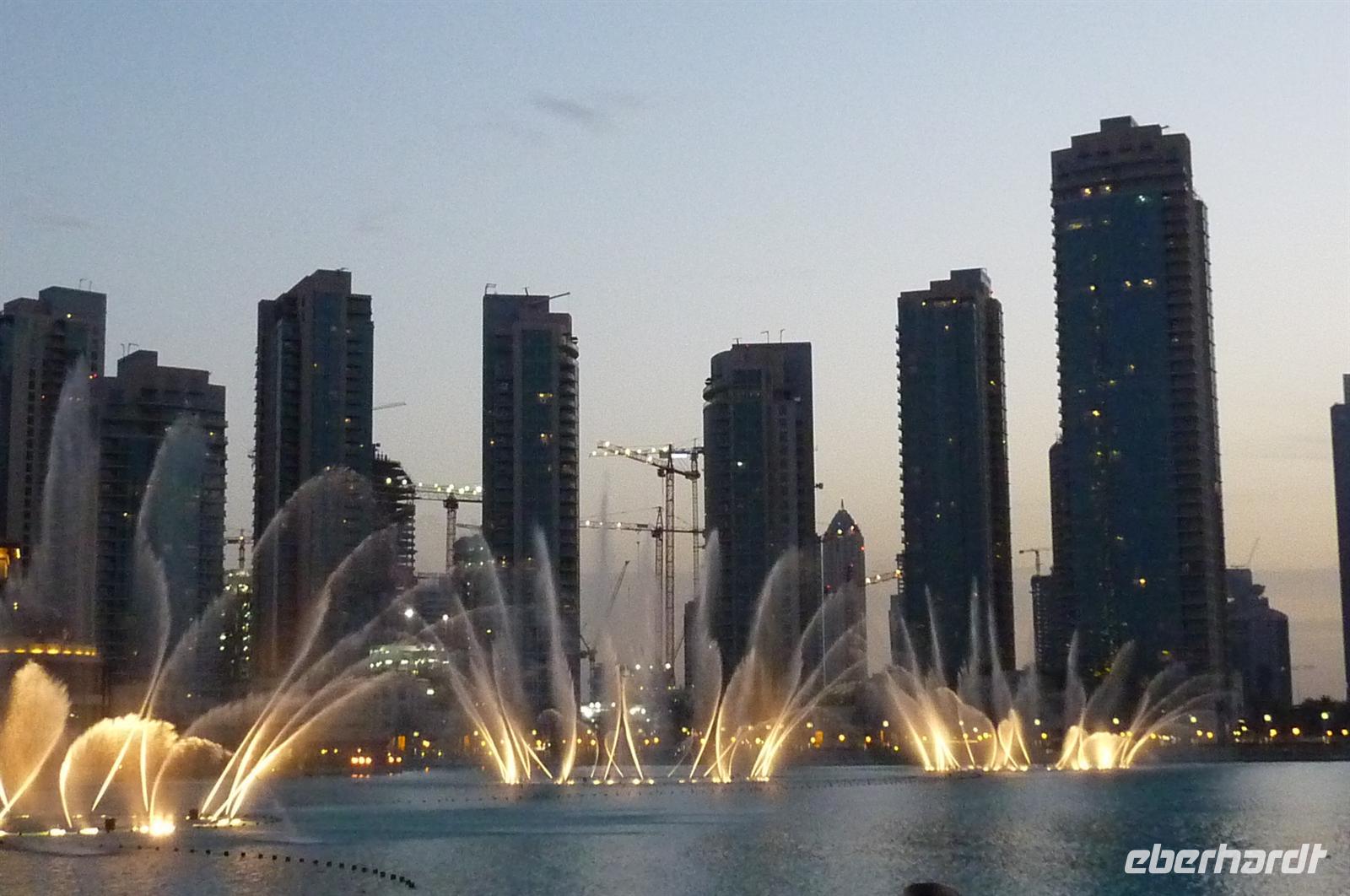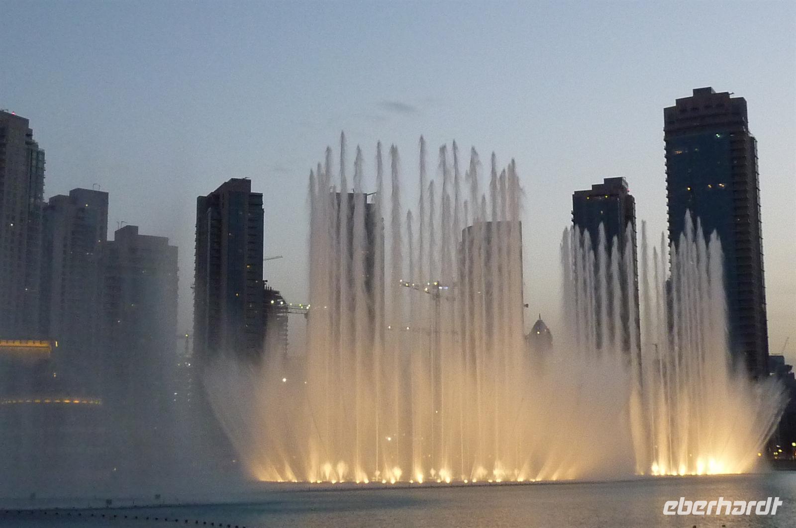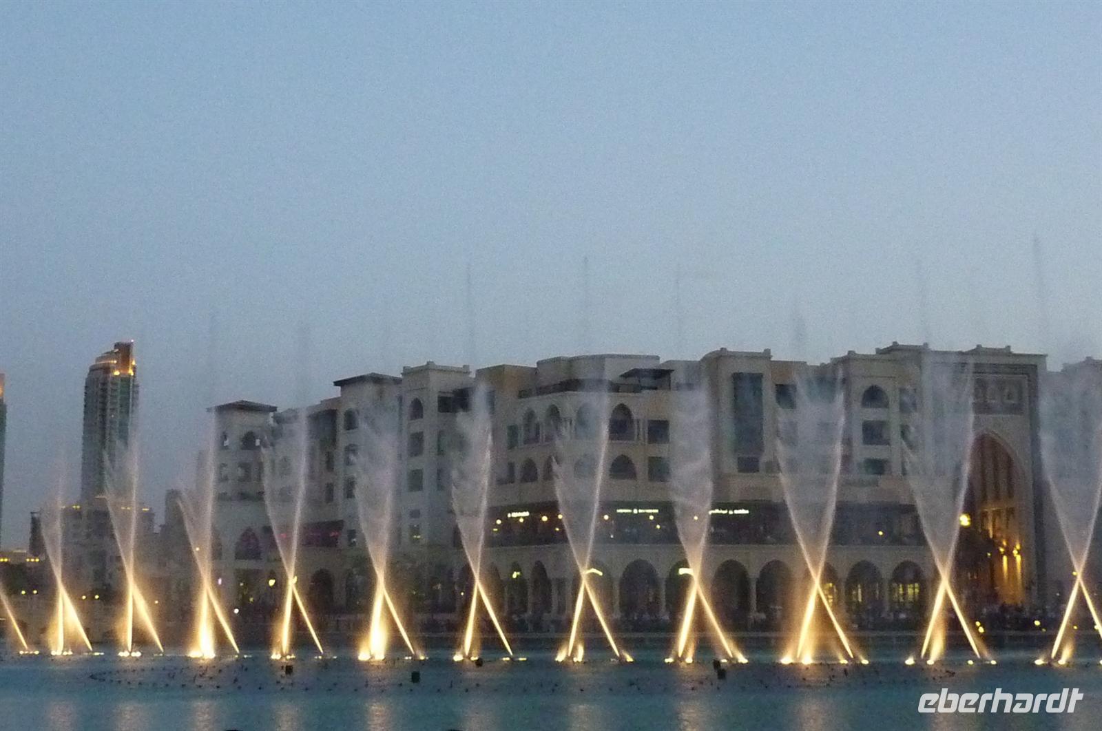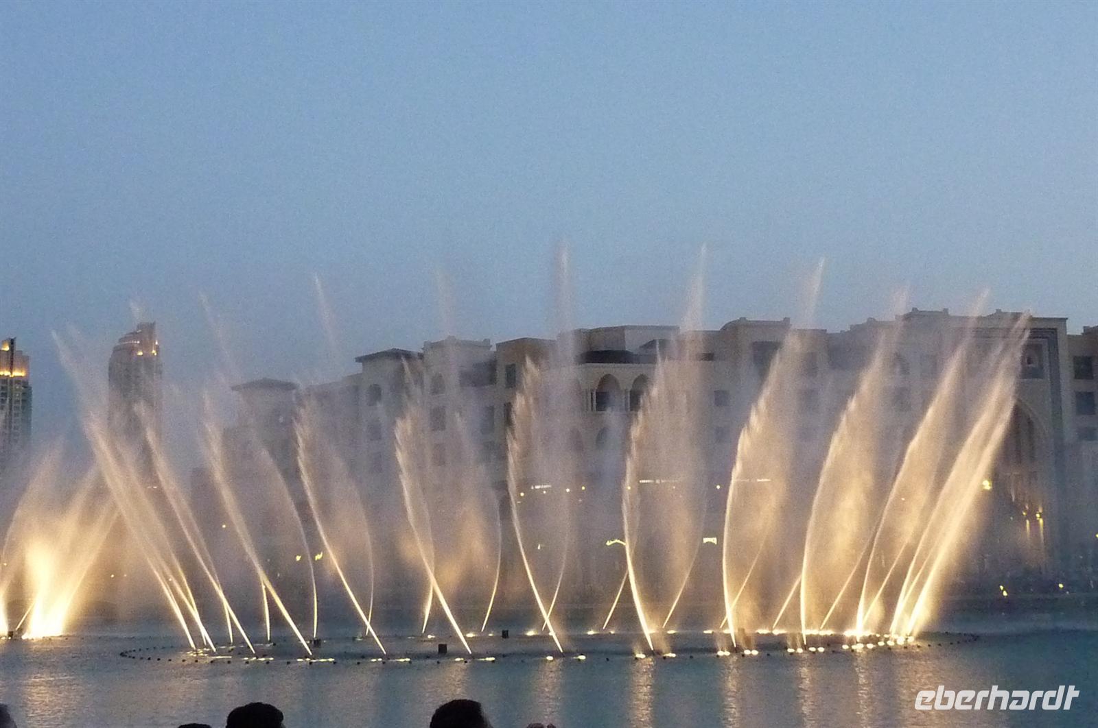 Nach einer strengen Sicherheitskontrolle, fast wie am Flughafen, mussten wir noch ein paar Meter zurücklegen um zu DEM Fahrstuhl zu gelangen. Der Fahrstuhl der uns in den 124. Stock auf 460m fahren sollte. Die Fahrt dauerte nicht mal eine Minute, es knackste zweimal in den Ohren und schon waren wir angekommen. Uns eröffnete sich ein traumhafter 369 Grad Blick auf Dubai. Wir hatten bei optimalsten Bedingungen eine super Aussicht in alle Himmelsrichtungen. Sogar das Nachbaremitat Sharjah konnte man sehen. Die Kameras liefen wieder heiß, es wurde viel fotografiert. Die Hochhäuser von oben wirkten plötzlich wie kleine Luxus-Legohäuschen, man fühlte sich selbst wie der Scheich über Dubai. Nach einer knappen Stunde fuhren wir wieder auf den „Boden der Tatsachen“ hinunter. Mit tollen Eindrücken, wollten wir diesen erlebnisreichen Tag bei den Wasserspielen am Burj Khalifa ausklingen lassen. Die erste Show begann um 6 und war schon sehr schön. Doch da hatten wir die zweite noch nicht gesehen. Diese folgte dann eine halbe Stunde später und war das Sahnehäubchen des heutigen Tages. ES war schon etwas dunkler geworden und die Wasserspiele wurden mit Licht untersetzt. Die richtige Musik dazu, ließ uns Gänsehaut bekommen.