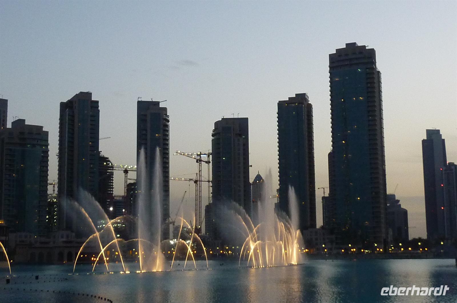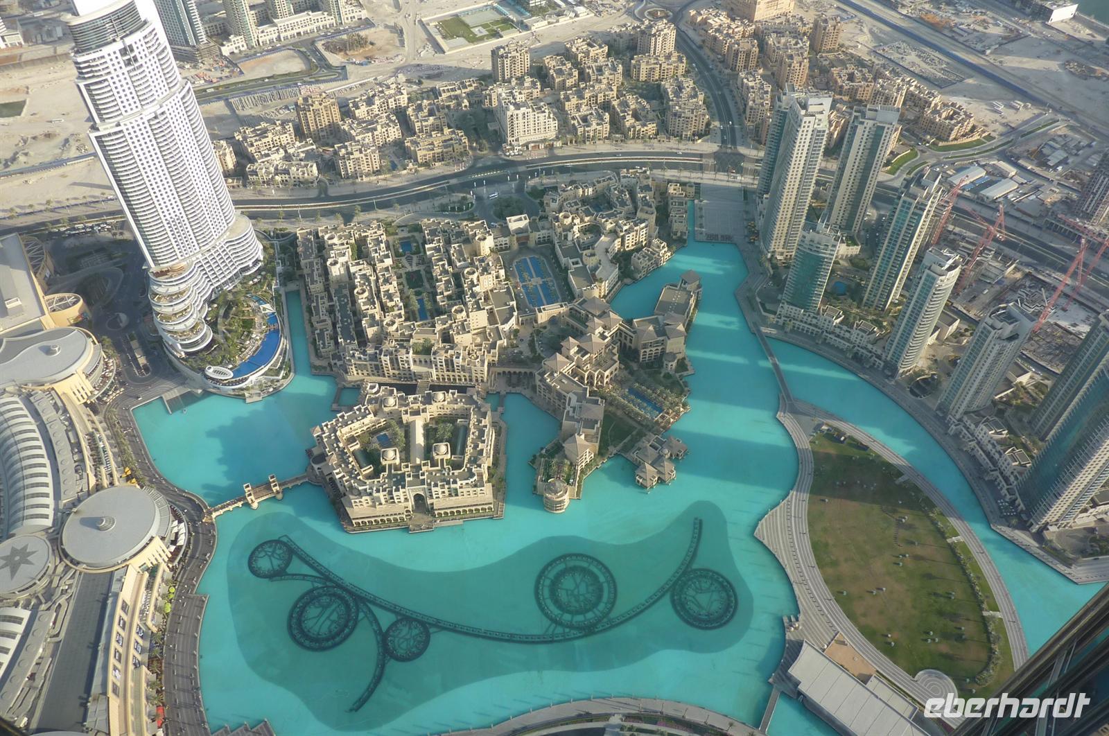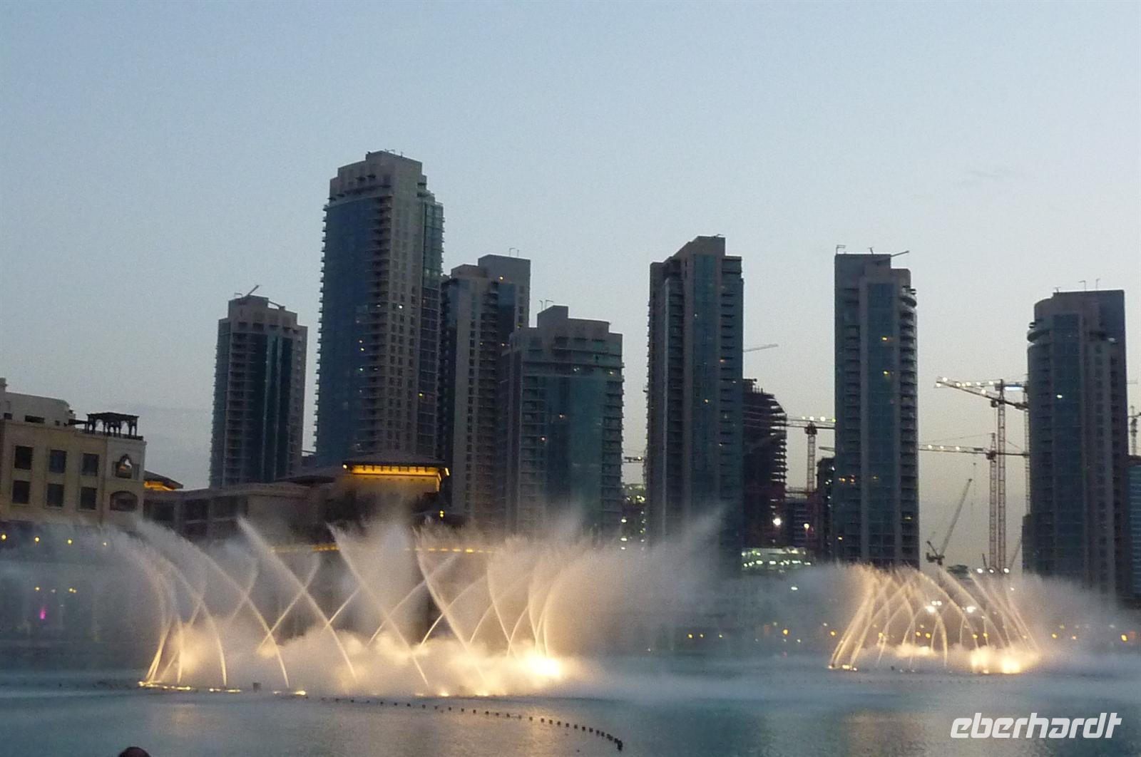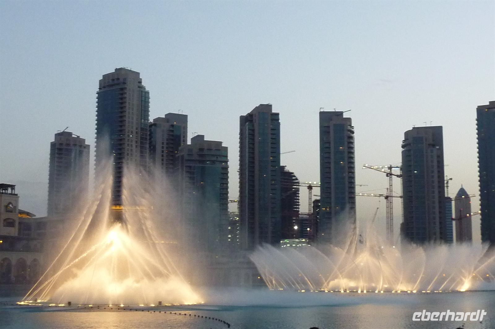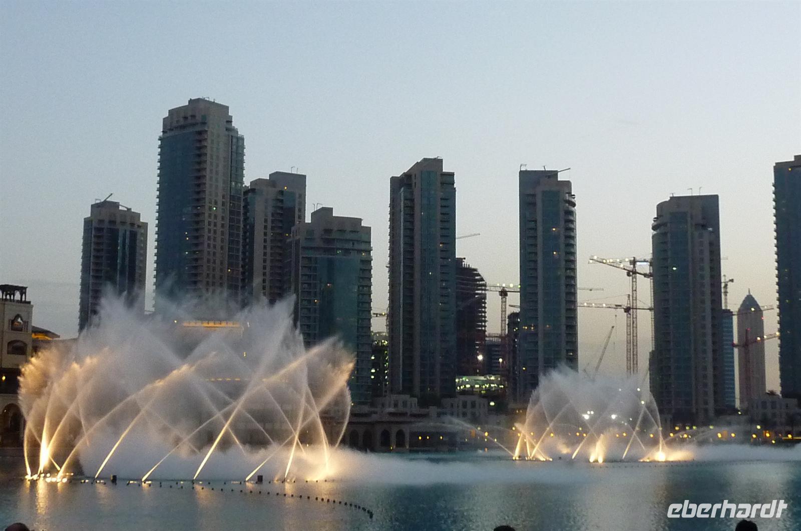 Nach einer strengen Sicherheitskontrolle, fast wie am Flughafen, mussten wir noch ein paar Meter zurücklegen um zu DEM Fahrstuhl zu gelangen. Der Fahrstuhl der uns in den 124. Stock auf 460m fahren sollte. Die Fahrt dauerte nicht mal eine Minute, es knackste zweimal in den Ohren und schon waren wir angekommen. Uns eröffnete sich ein traumhafter 369 Grad Blick auf Dubai. Wir hatten bei optimalsten Bedingungen eine super Aussicht in alle Himmelsrichtungen. Sogar das Nachbaremitat Sharjah konnte man sehen. Die Kameras liefen wieder heiß, es wurde viel fotografiert. Die Hochhäuser von oben wirkten plötzlich wie kleine Luxus-Legohäuschen, man fühlte sich selbst wie der Scheich über Dubai. Nach einer knappen Stunde fuhren wir wieder auf den „Boden der Tatsachen“ hinunter. Mit tollen Eindrücken, wollten wir diesen erlebnisreichen Tag bei den Wasserspielen am Burj Khalifa ausklingen lassen. Die erste Show begann um 6 und war schon sehr schön. Doch da hatten wir die zweite noch nicht gesehen. Diese folgte dann eine halbe Stunde später und war das Sahnehäubchen des heutigen Tages. ES war schon etwas dunkler geworden und die Wasserspiele wurden mit Licht untersetzt. Die richtige Musik dazu, ließ uns Gänsehaut bekommen.