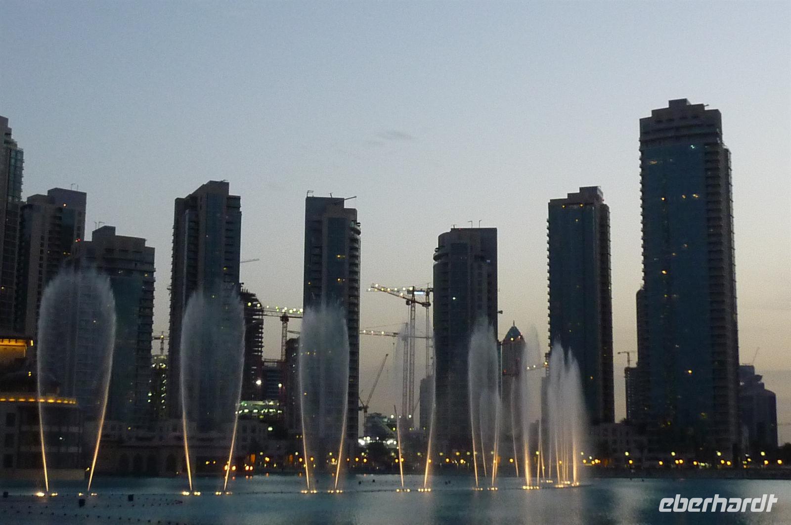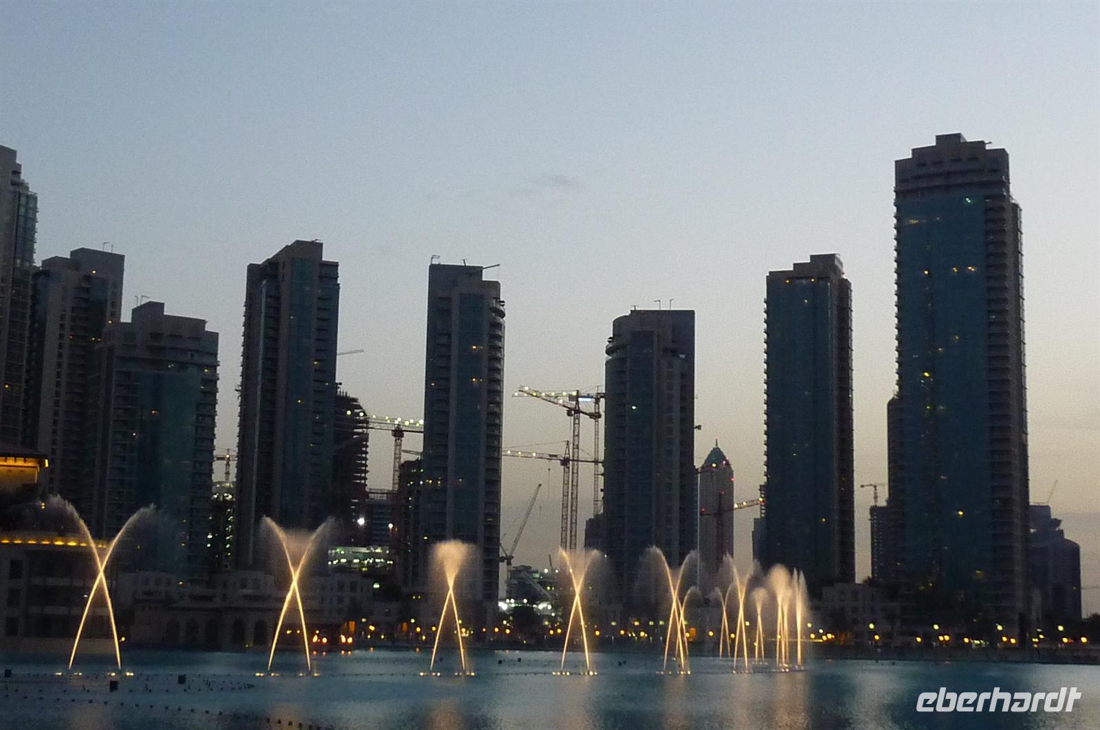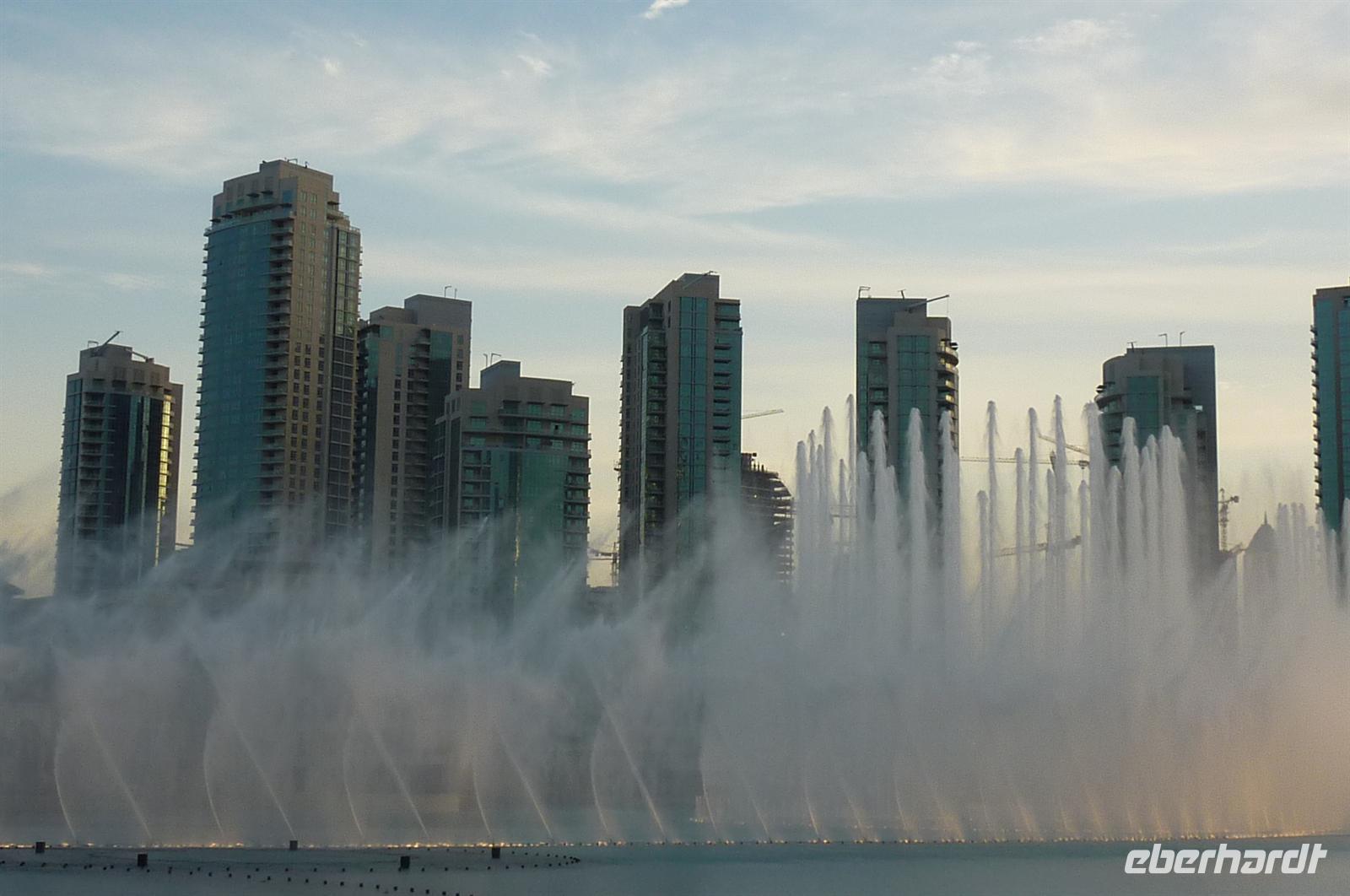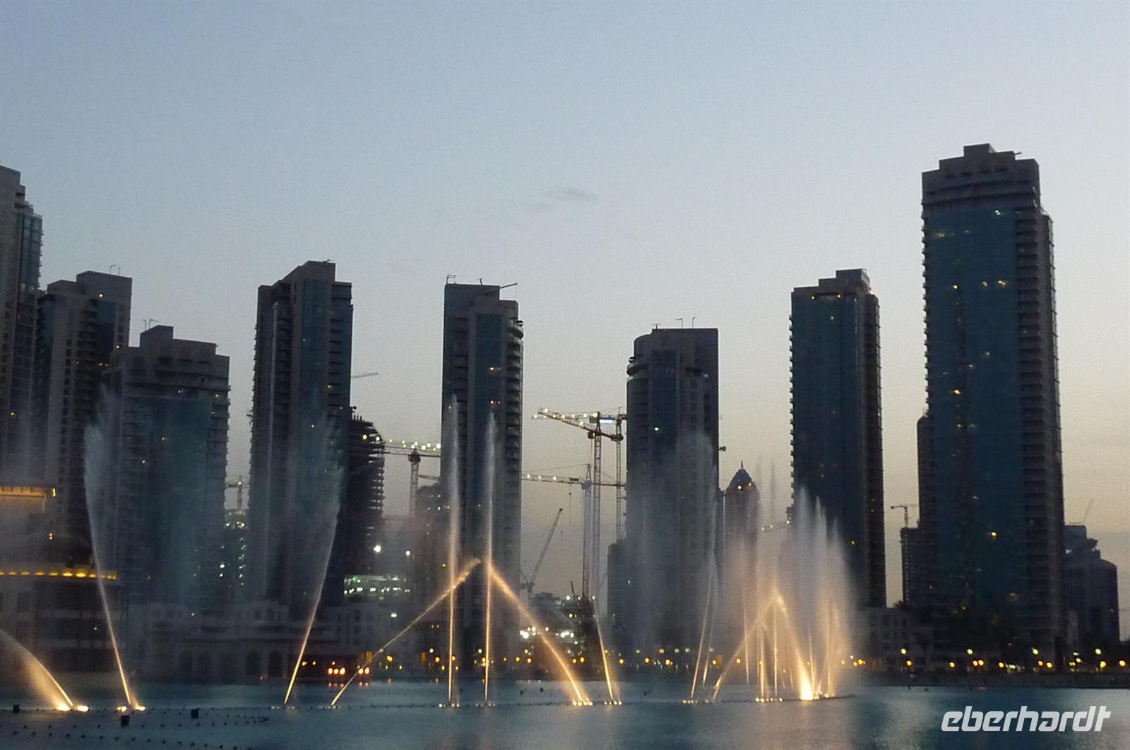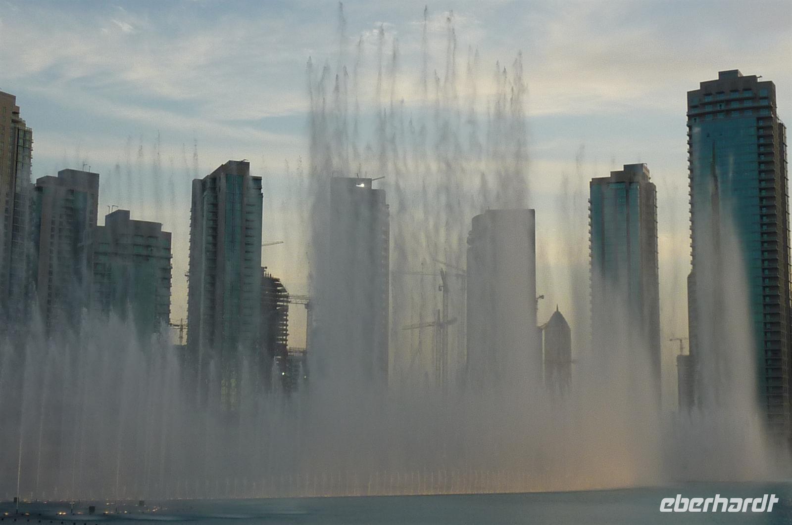 Nach einer strengen Sicherheitskontrolle, fast wie am Flughafen, mussten wir noch ein paar Meter zurücklegen um zu DEM Fahrstuhl zu gelangen. Der Fahrstuhl der uns in den 124. Stock auf 460m fahren sollte. Die Fahrt dauerte nicht mal eine Minute, es knackste zweimal in den Ohren und schon waren wir angekommen. Uns eröffnete sich ein traumhafter 369 Grad Blick auf Dubai. Wir hatten bei optimalsten Bedingungen eine super Aussicht in alle Himmelsrichtungen. Sogar das Nachbaremitat Sharjah konnte man sehen. Die Kameras liefen wieder heiß, es wurde viel fotografiert. Die Hochhäuser von oben wirkten plötzlich wie kleine Luxus-Legohäuschen, man fühlte sich selbst wie der Scheich über Dubai. Nach einer knappen Stunde fuhren wir wieder auf den „Boden der Tatsachen“ hinunter. Mit tollen Eindrücken, wollten wir diesen erlebnisreichen Tag bei den Wasserspielen am Burj Khalifa ausklingen lassen. Die erste Show begann um 6 und war schon sehr schön. Doch da hatten wir die zweite noch nicht gesehen. Diese folgte dann eine halbe Stunde später und war das Sahnehäubchen des heutigen Tages. ES war schon etwas dunkler geworden und die Wasserspiele wurden mit Licht untersetzt. Die richtige Musik dazu, ließ uns Gänsehaut bekommen.