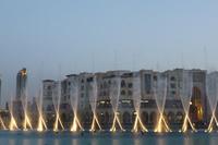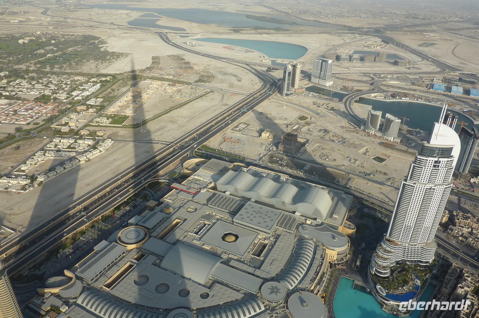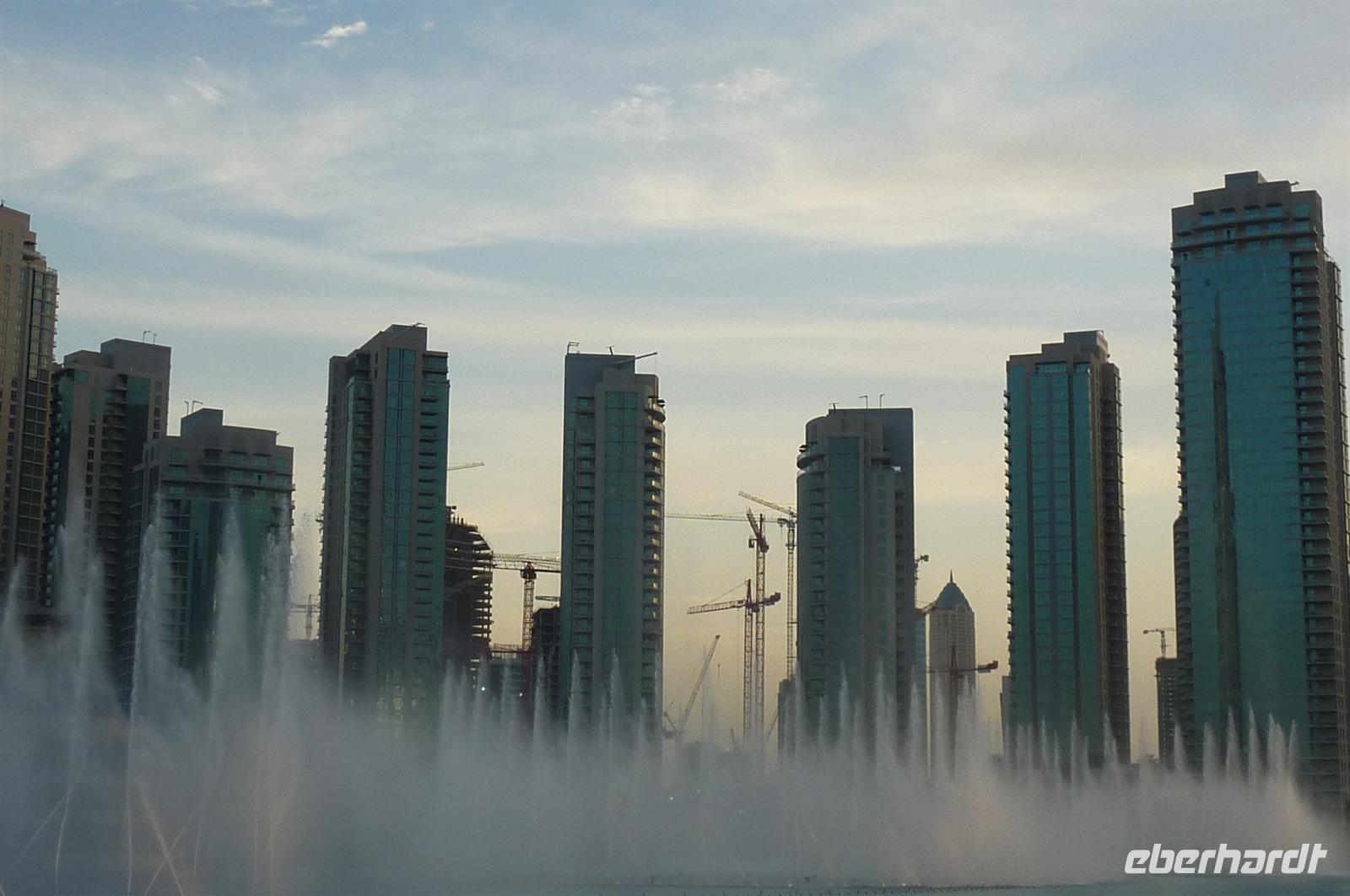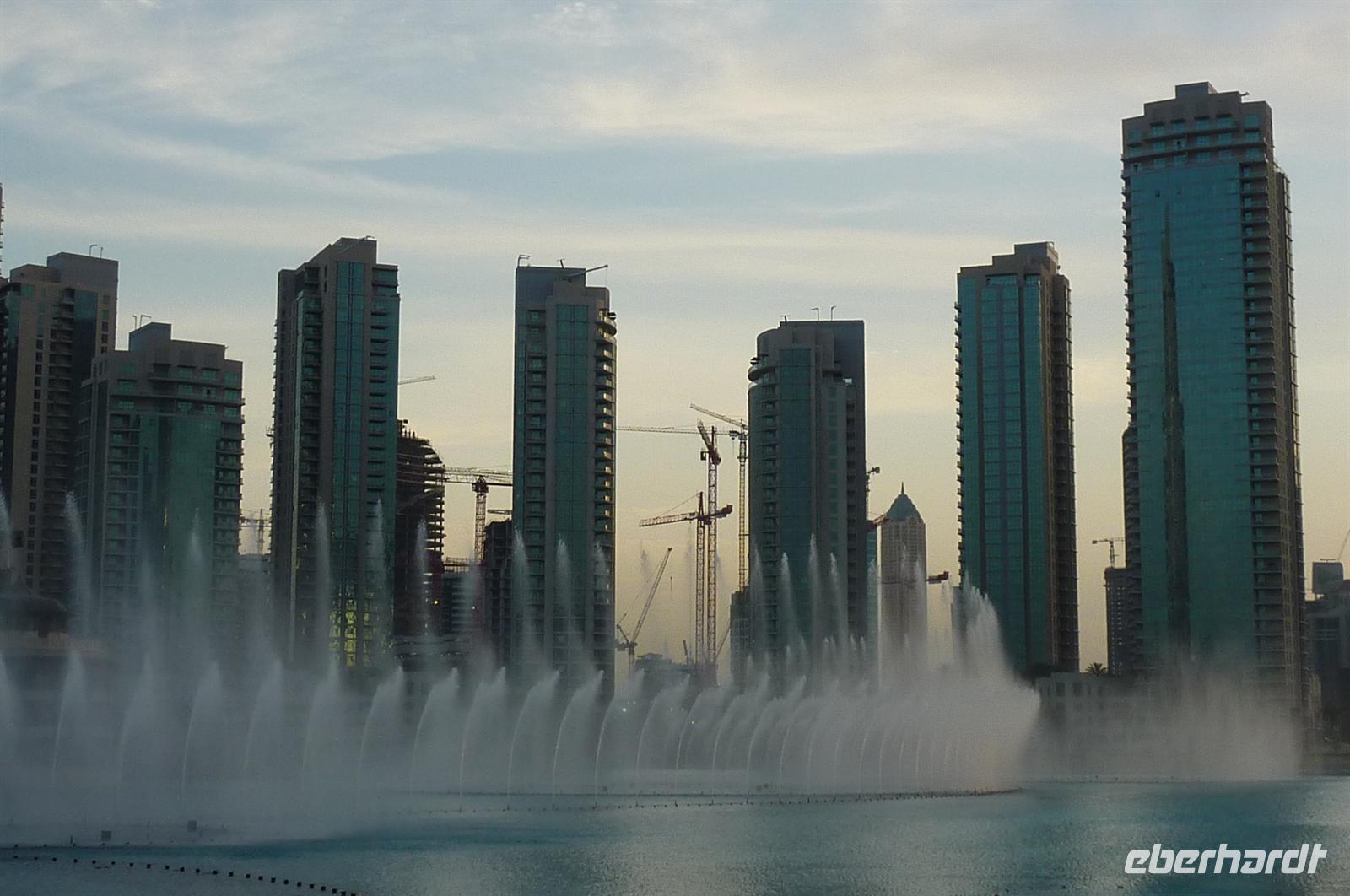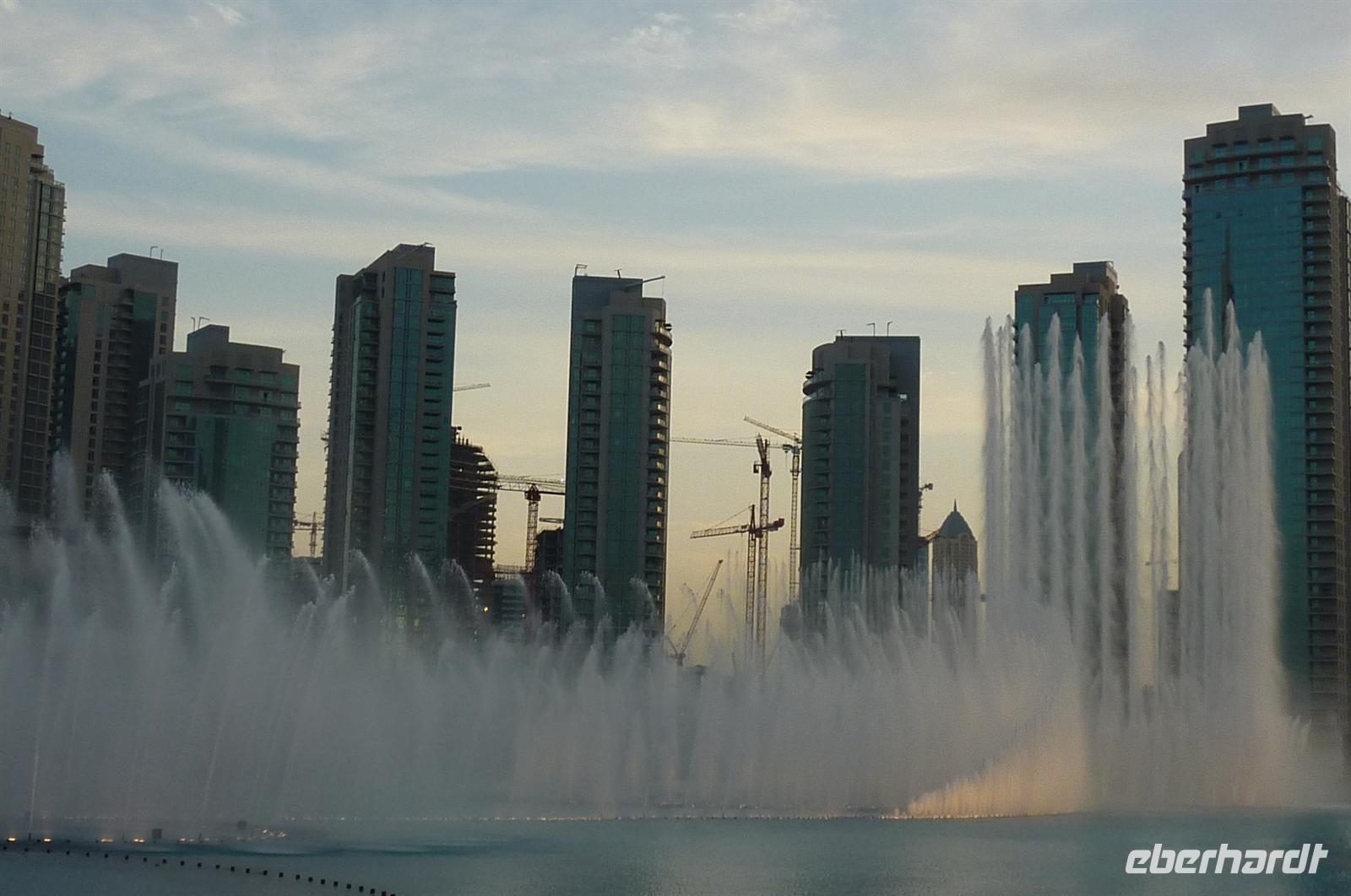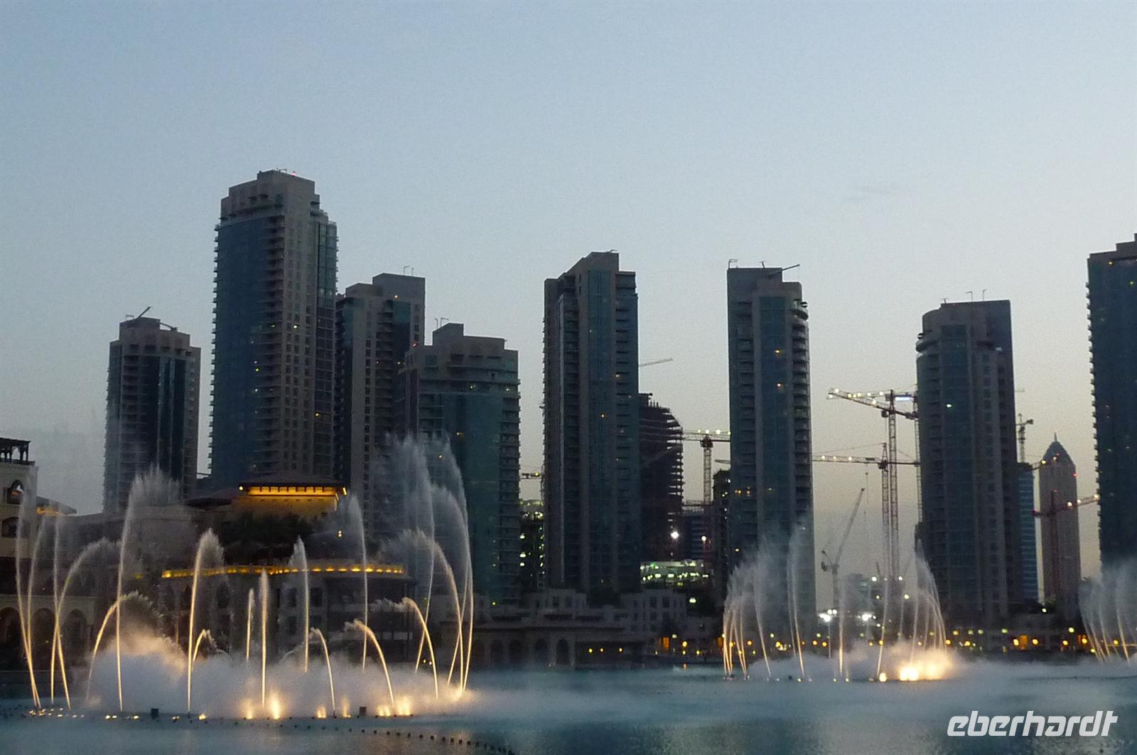 Nach einer strengen Sicherheitskontrolle, fast wie am Flughafen, mussten wir noch ein paar Meter zurücklegen um zu DEM Fahrstuhl zu gelangen. Der Fahrstuhl der uns in den 124. Stock auf 460m fahren sollte. Die Fahrt dauerte nicht mal eine Minute, es knackste zweimal in den Ohren und schon waren wir angekommen. Uns eröffnete sich ein traumhafter 369 Grad Blick auf Dubai. Wir hatten bei optimalsten Bedingungen eine super Aussicht in alle Himmelsrichtungen. Sogar das Nachbaremitat Sharjah konnte man sehen. Die Kameras liefen wieder heiß, es wurde viel fotografiert. Die Hochhäuser von oben wirkten plötzlich wie kleine Luxus-Legohäuschen, man fühlte sich selbst wie der Scheich über Dubai. Nach einer knappen Stunde fuhren wir wieder auf den „Boden der Tatsachen“ hinunter. Mit tollen Eindrücken, wollten wir diesen erlebnisreichen Tag bei den Wasserspielen am Burj Khalifa ausklingen lassen. Die erste Show begann um 6 und war schon sehr schön. Doch da hatten wir die zweite noch nicht gesehen. Diese folgte dann eine halbe Stunde später und war das Sahnehäubchen des heutigen Tages. ES war schon etwas dunkler geworden und die Wasserspiele wurden mit Licht untersetzt. Die richtige Musik dazu, ließ uns Gänsehaut bekommen.