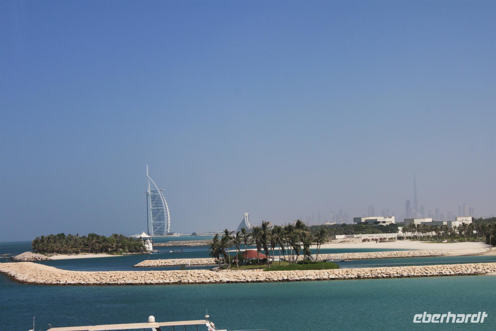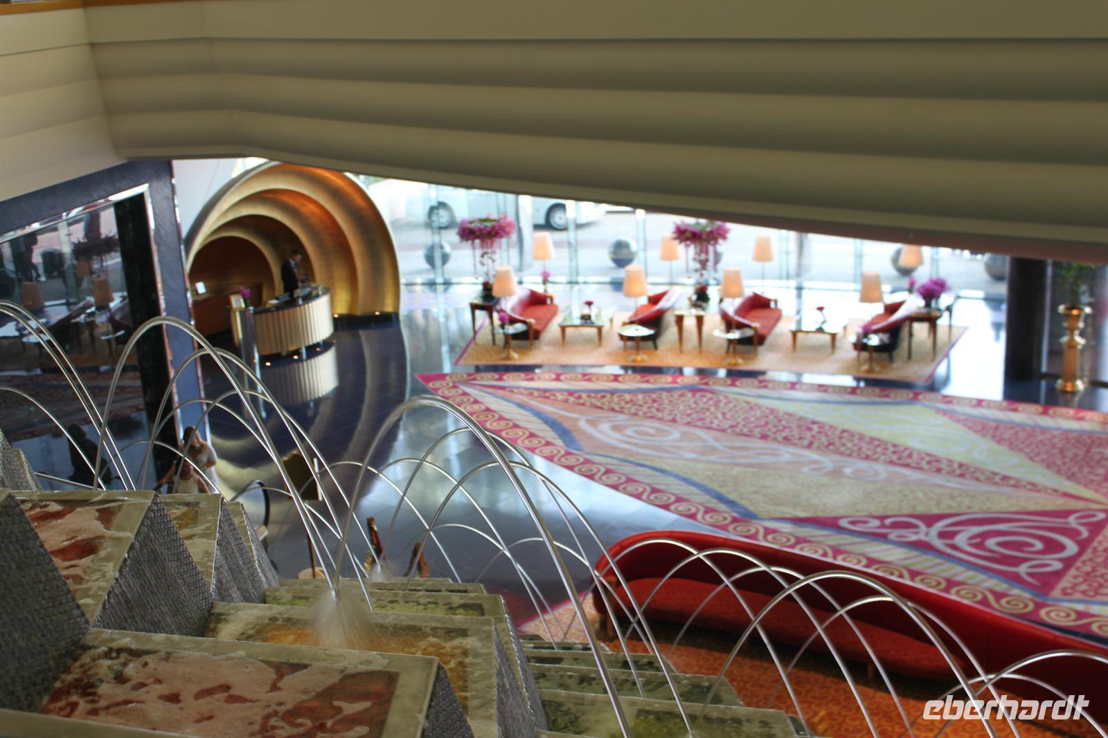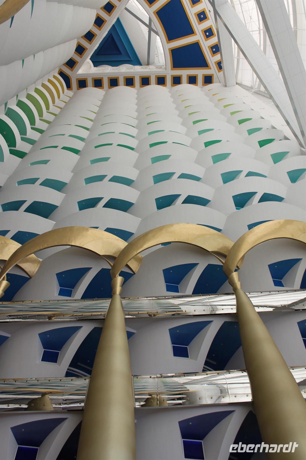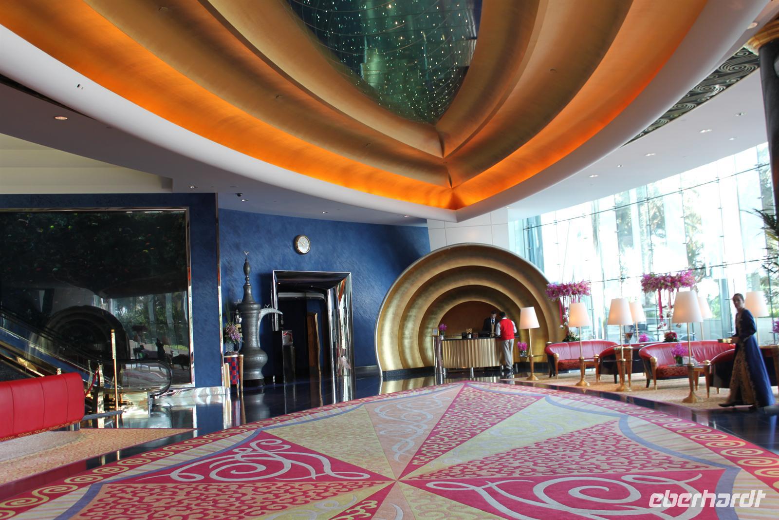 Das I-Tüpfelchen für meine Gäste war natürlich das Wetter: die Sicht vom Burj Khalifa war einfach wunderbar, kaum diesig. Dasselbe Glück hatten alle Gäste, die den Zusatzausflug in das 7-Sterne-Hotel Burj al-Arab gebucht hatten. Bereits beim Betreten der Lobby ging ein leichtes Raunen durch die Runde. Mich persönlich beeindrucken hier immer die Farben: viel weiß, dazwischen rot, gelb, blau und grün sowie selbstverständlich ganz viel gold. Das Buffet war wie immer gut bestückt und laut Aussagen meiner Gäste köstlich - es sei ihnen gegönnt, jeder muss ab und zu mal so richtig Schlemmen.