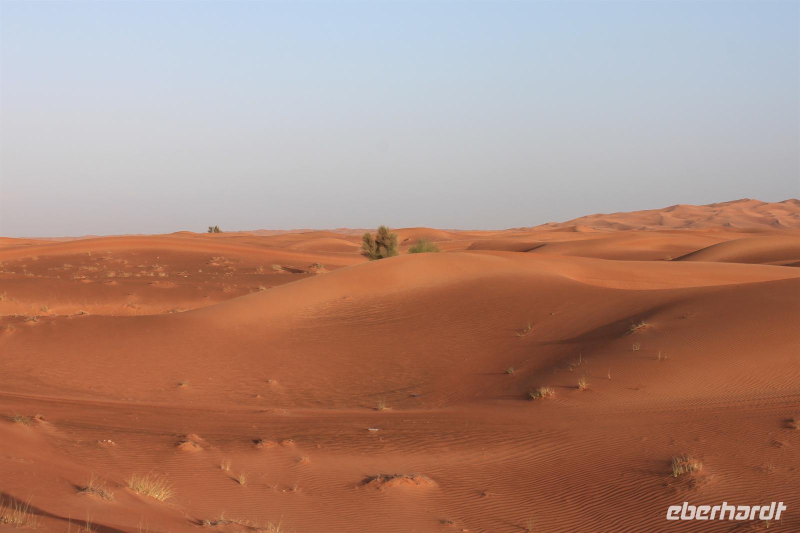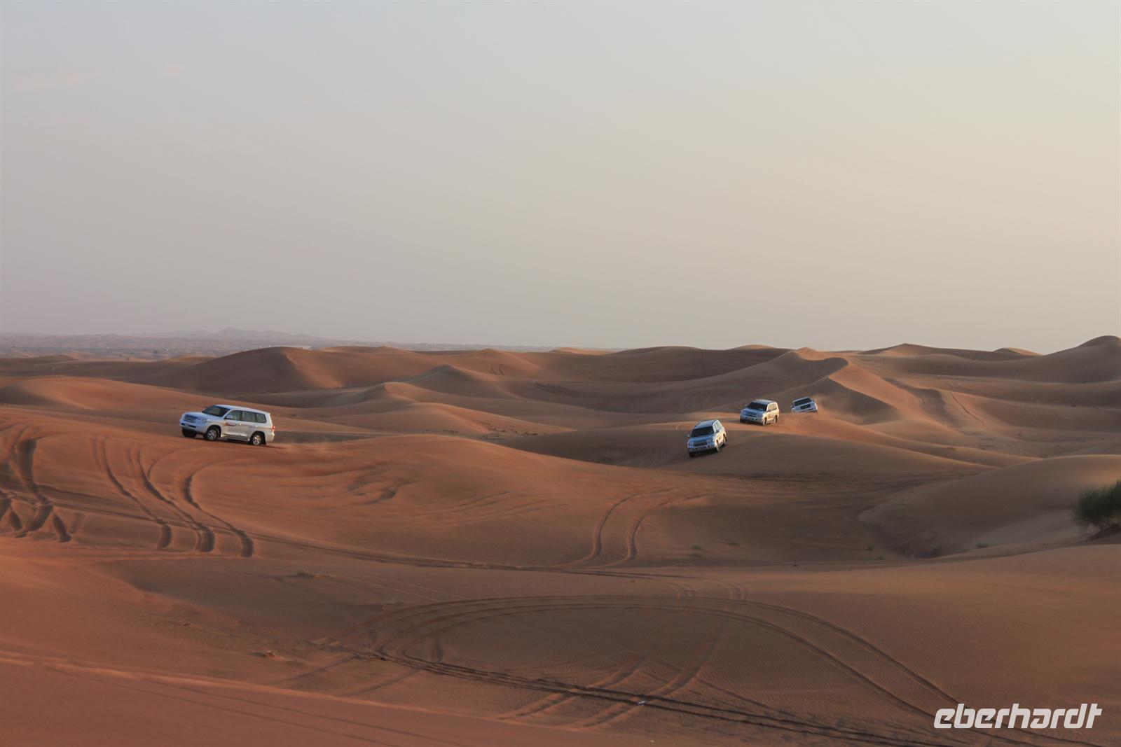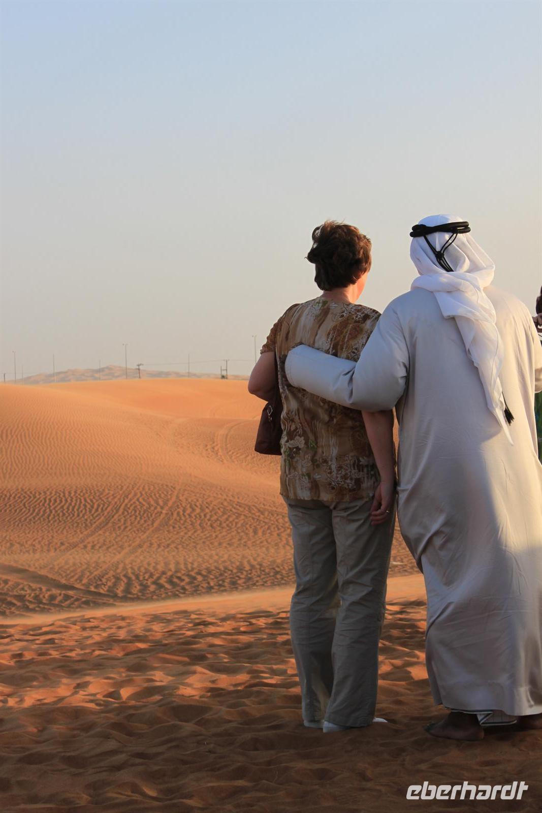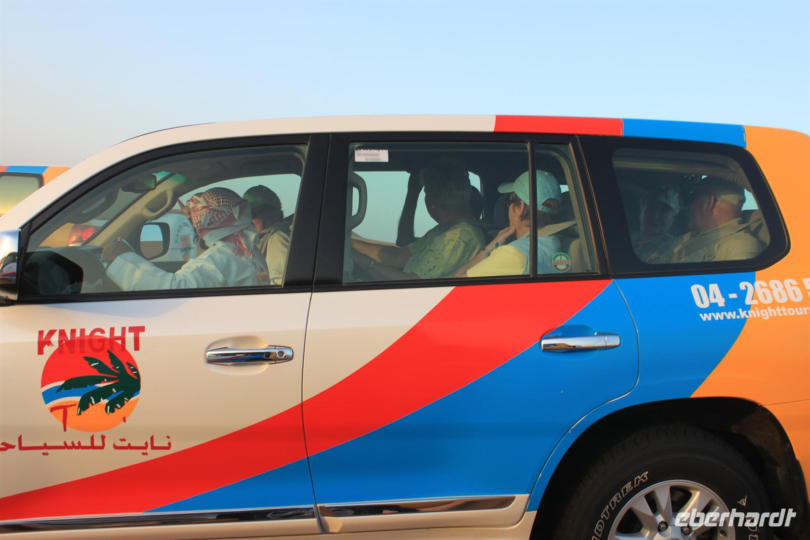 Einen etwas anderen Eindruck gewinnt man dann bei unserem Halbtagesausflug nach Sharjah. Hier wirken die Bauten geradezu europäisch, der Strand fast menschenleer. Sharjah ist „kleiner“, nicht so „prunkvoll“ und dennoch schön. Gerade im Blauen Souk lassen sich traditionelle Kleider der Einheimischen bestaunen. Der Nachmittag hält dann einen besonderen Programmteil für uns bereit: die Jeep-Safari. Mit meist kreischenden Insassen fahre ich die Dünen hinauf und hinab. Das Können der Fahrer ist einfach bemerkenswert und den Sonnenuntergang haben wir haarscharf vor die Fotolinse bekommen. Im Camp hatten wir wie gewohnt Plätze direkt an der Bühne und unser eigenes Buffet. Die Rückfahrt ist dann weniger anstrengend, sodass die vollen Mägen geschont werden!