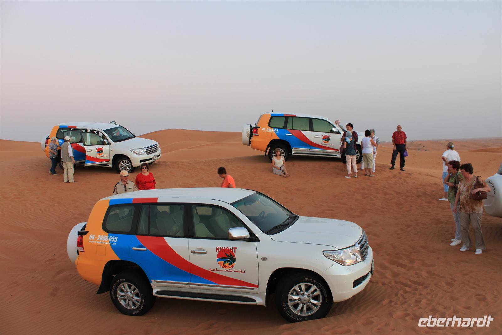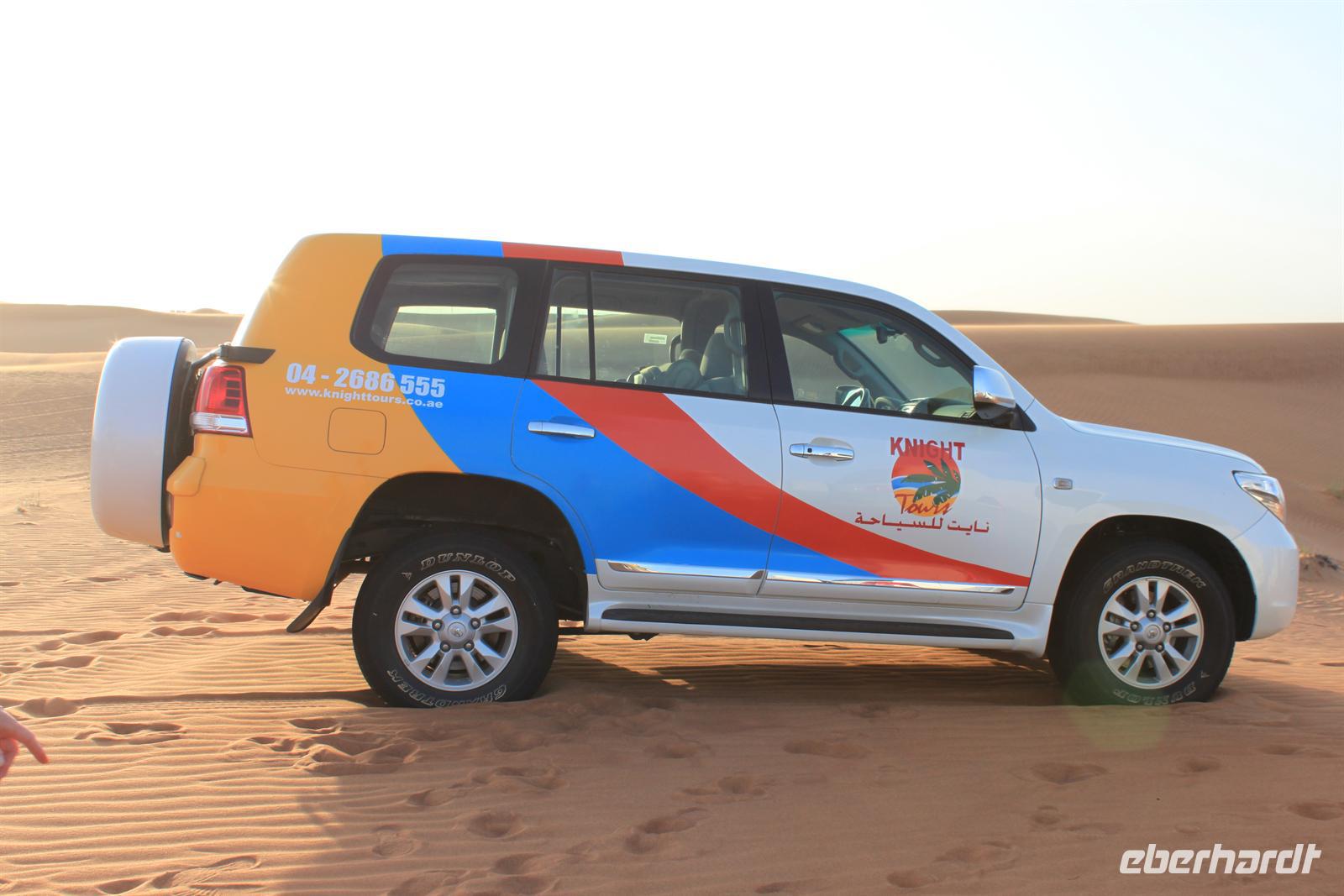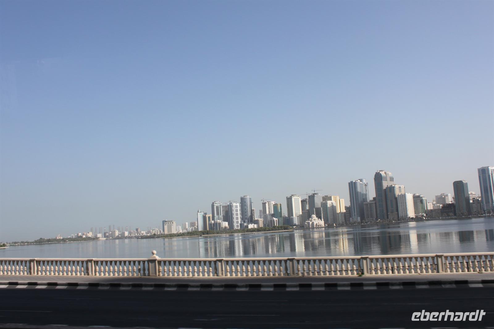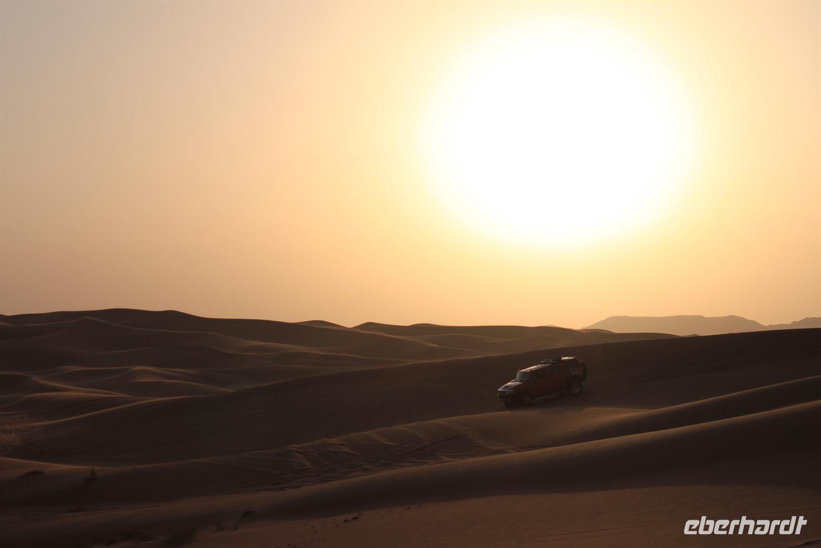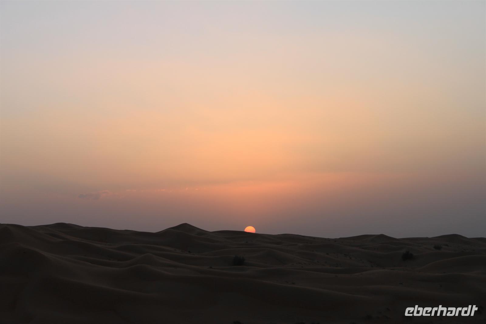Einen etwas anderen Eindruck gewinnt man dann bei unserem Halbtagesausflug nach Sharjah. Hier wirken die Bauten geradezu europäisch, der Strand fast menschenleer. Sharjah ist „kleiner“, nicht so „prunkvoll“ und dennoch schön. Gerade im Blauen Souk lassen sich traditionelle Kleider der Einheimischen bestaunen. Der Nachmittag hält dann einen besonderen Programmteil für uns bereit: die Jeep-Safari. Mit meist kreischenden Insassen fahre ich die Dünen hinauf und hinab. Das Können der Fahrer ist einfach bemerkenswert und den Sonnenuntergang haben wir haarscharf vor die Fotolinse bekommen. Im Camp hatten wir wie gewohnt Plätze direkt an der Bühne und unser eigenes Buffet. Die Rückfahrt ist dann weniger anstrengend, sodass die vollen Mägen geschont werden!