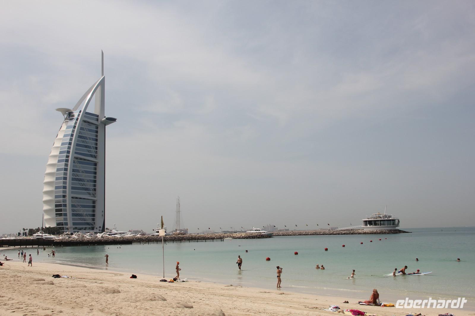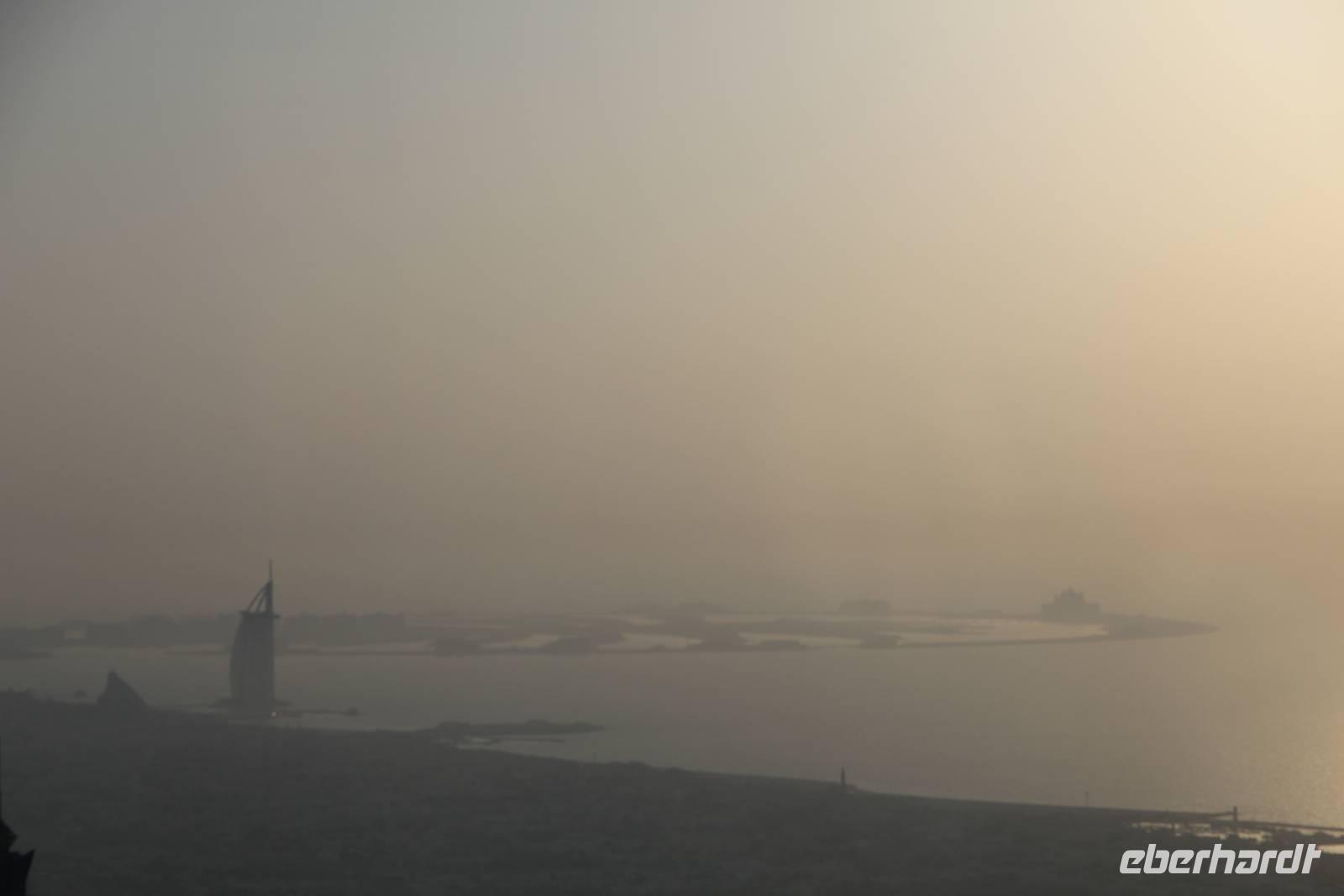 Dann näherten wir uns dem Wahrzeichen Dubais: dem Burj Al Arab. Bei bester Sicht machten wir einen Fotostopp am Strand von Dubai und konnten vom Burj Al Arab bis hinter zur Palm Jumeirah und dem Atlantis Hotel schauen.