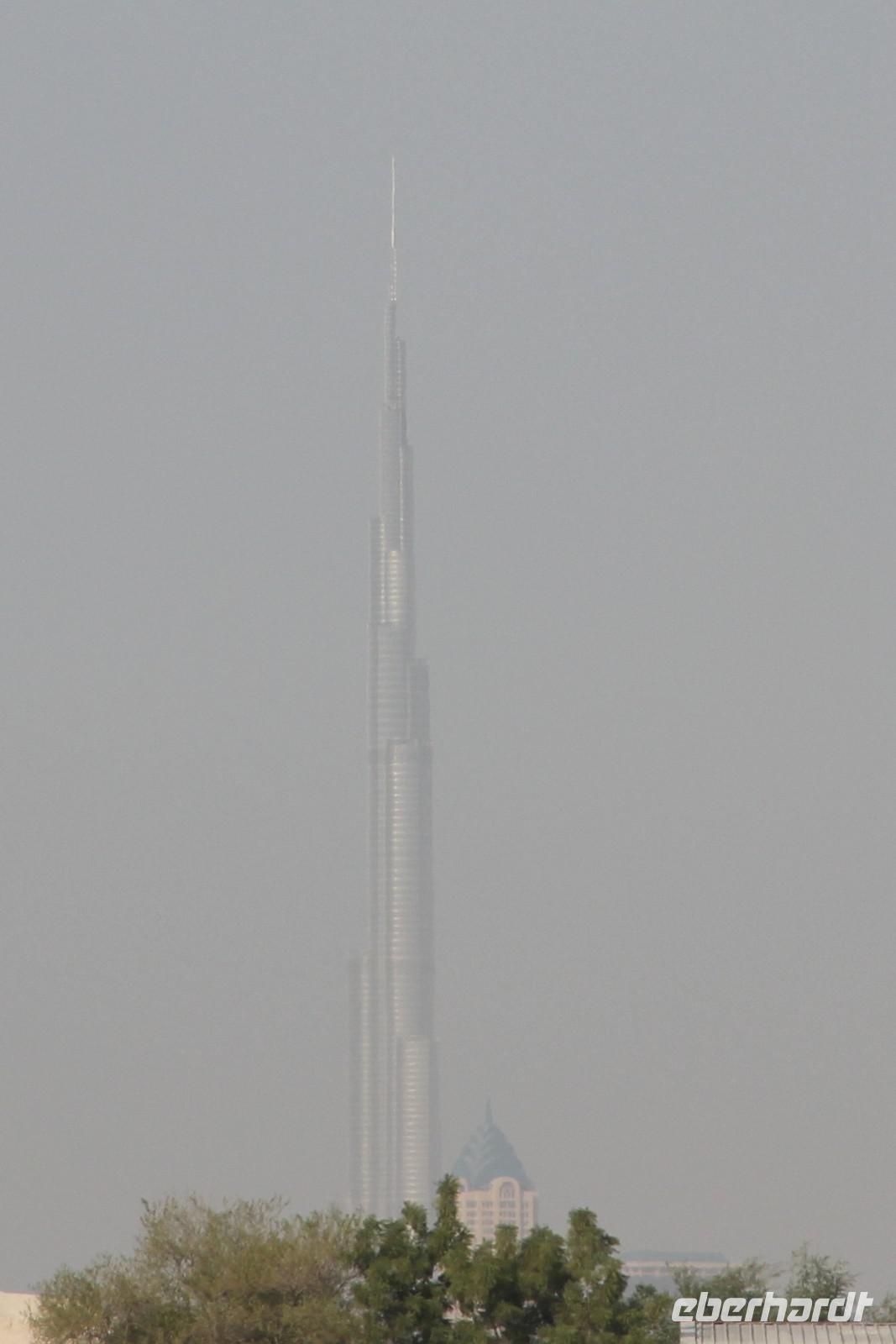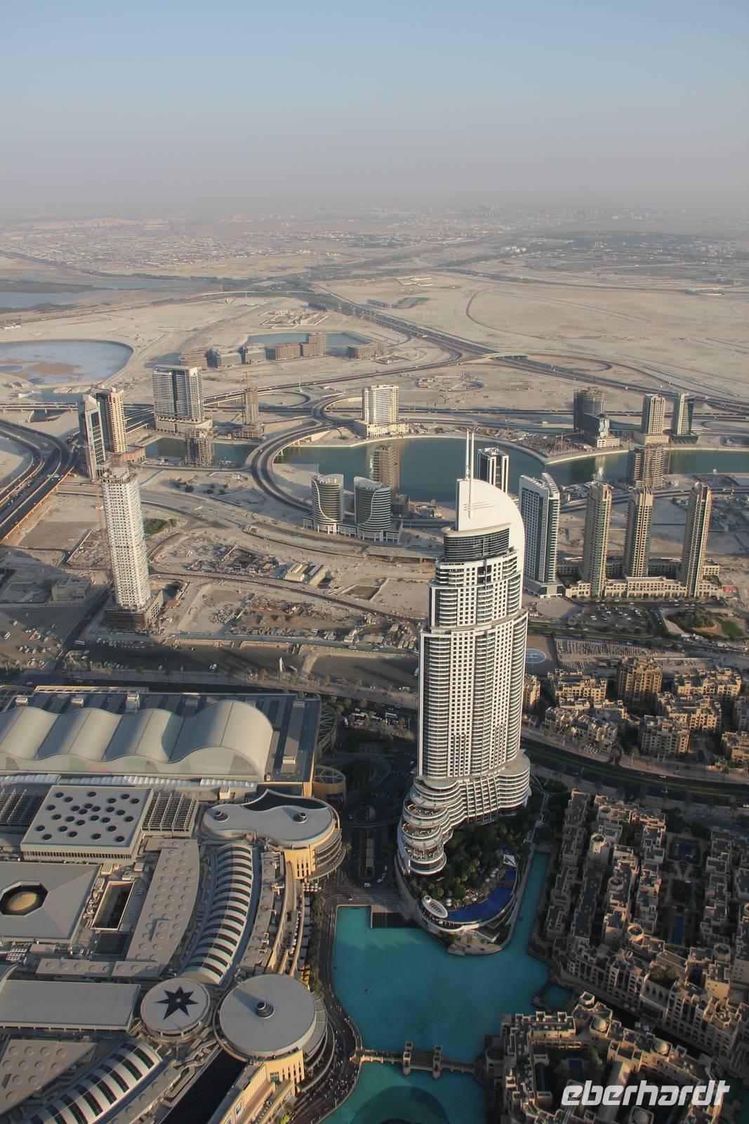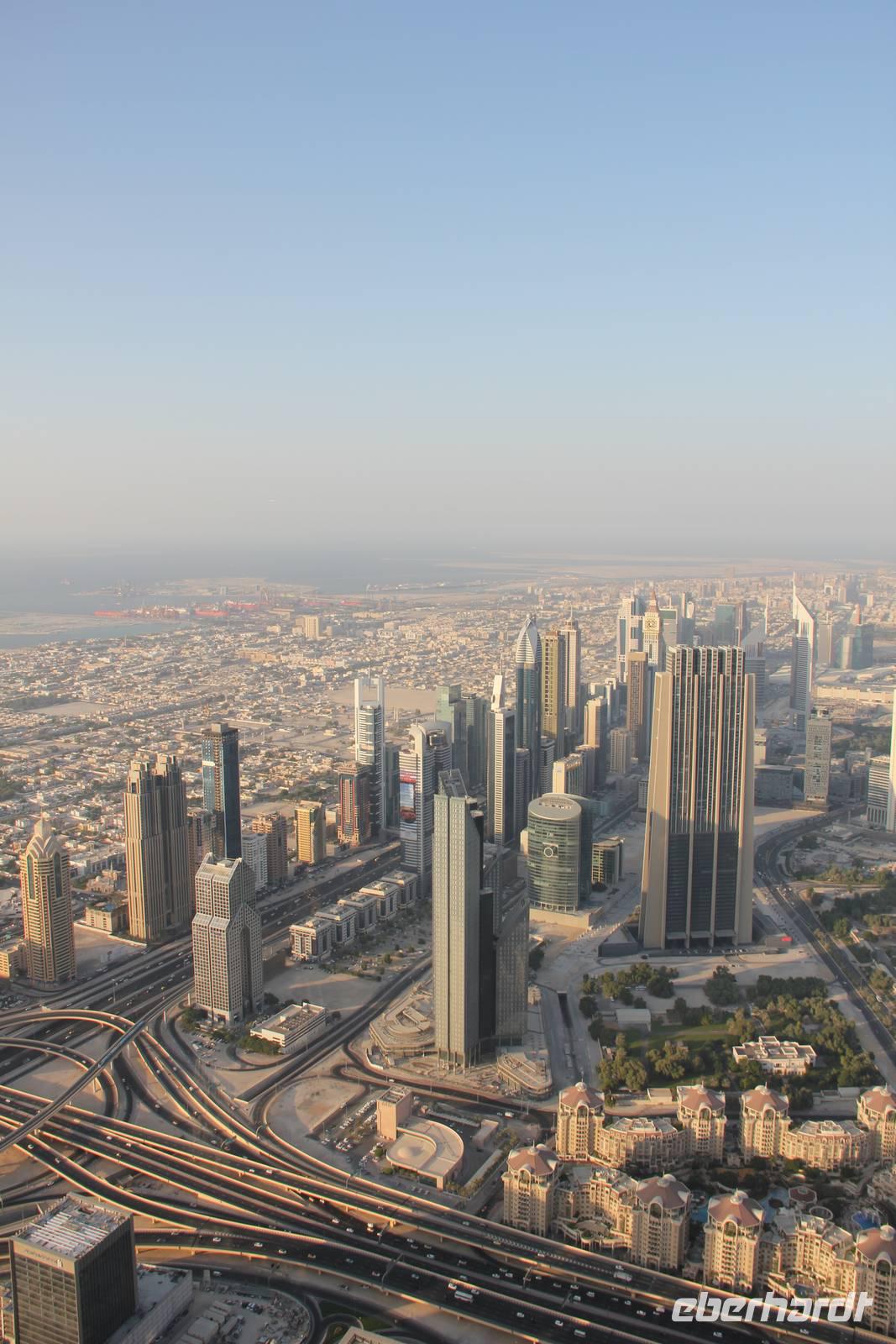 Im Anschluss hatte jeder etwas freie Zeit für sich zur Verfügung, konnte die Einkaufsläden unsicher machen oder einfach nur etwas zu Mittag essen gehen. Nachmittags trafen wir uns dann wieder um auf die Besucherplattform des Burj Khalifa zu fahren. Und wir hatten mit dem Wetter einmal richtig Glück, da wir eine fast klare Aussicht bis hin zum Stadtteil Dubai Marina und zur Palm Jumeirah hatten. Auch die anderen Palmen-Projekte von Dubai konnte man von hier aus teilweise sehen.