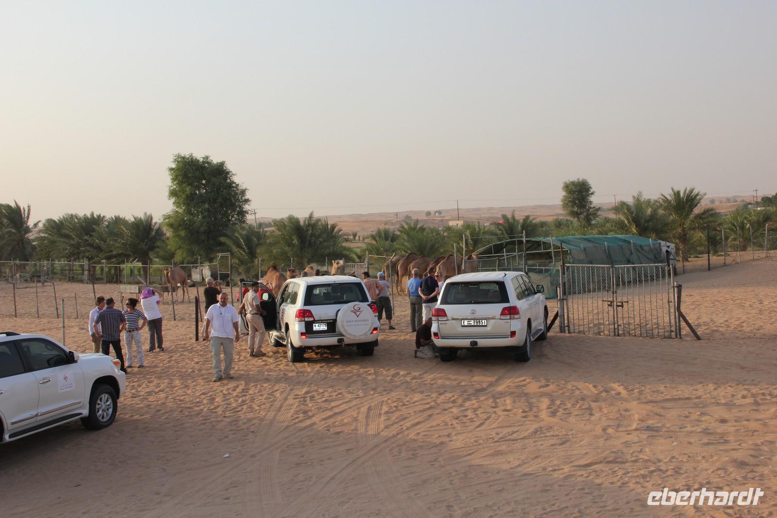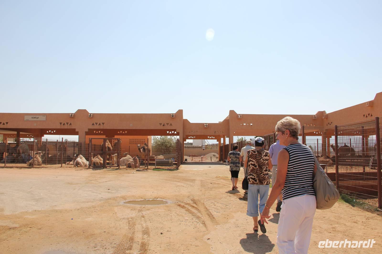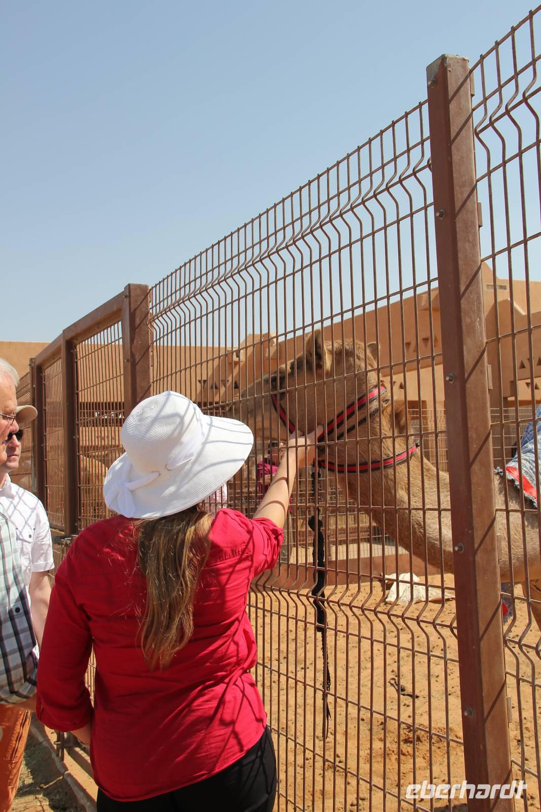 Am Vormittag fuhren wir von Dubai in das Emirat Abu Dhabi. Unser Ziel war die Oasenstadt Al Ain. Unterwegs kamen wir an einer Kamelrennbahn vorbei, auf der auch gerade Trainings stattfanden. Während unserer Fahrt durch die recht karge Landschaft konnten wir rechts und links immer wieder die verschiedensten Kamele sehen. Unser erster Stopp war dann der Kamelmarkt in Al Ain. Hier konnten wir sehen, wie die Kamele gehalten werden, bevor die verkauft werden und wir konnten sogar den Kauf eines Kamels mit verfolgen.