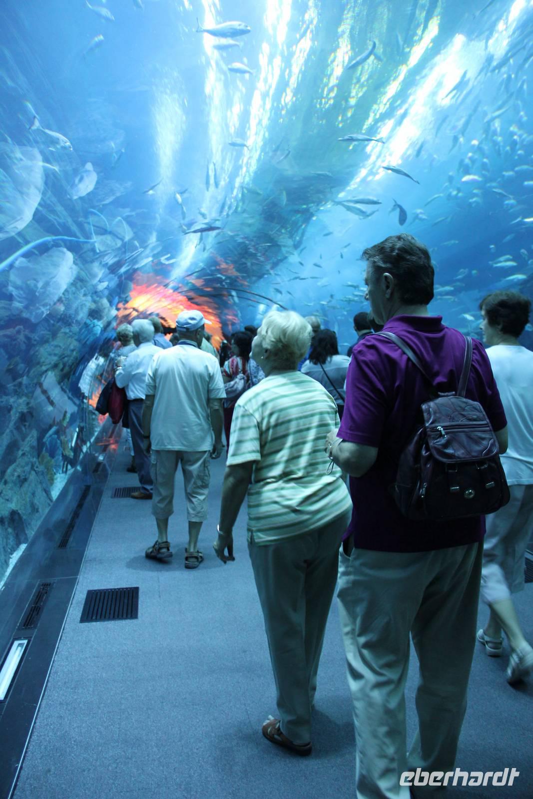 In Dubai angekommen steuerten wir die Dubai Mall an. Dort schauten wir uns zuerst die berühmten Wasserspiele vor dem Burj Khalifa an. Anschließend gingen wir zum Dubai Aquarium, welches sich in der Dubai Mall befindet. Hier konnten wir Wassertiere aller Art sehen und kamen aus dem fotografieren gar nicht mehr heraus. Danach ging es direkt zum Aquarium Tunnel, wo wir noch Rochen und andere Fische bestaunen konnten.