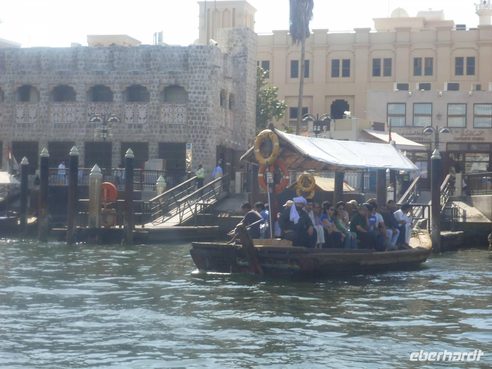 Anschließend erwartet uns ein ganz besonderes Erlebnis. Um auf die gegenüberliegende Seite des Creeks zu gelangen rüsten wir uns für eine Fahrt mit dem Wassertaxi, der sogenannten "Abra". Die flachen Holzboote mit zwei Sitzreihen und Dieselmotor sind für die vielen asiatischen und arabischen Gastarbeiter ein unentbehrliches Transportmittel. Für uns als Touristen stellen die hölzernen Kähne eine günstige und stimmungsvolle Möglichkeit dar, Dubai vom Wasser aus kennen zu lernen. So genießen wir die fröhliche Fahrt unter der arabischen Sonne und können unsere Augen kaum von Dubais spektakulärer Kulisse lassen. Heil und trocken angekommen, finden wir uns in der bunten Welt der arabischen Märkte wieder.