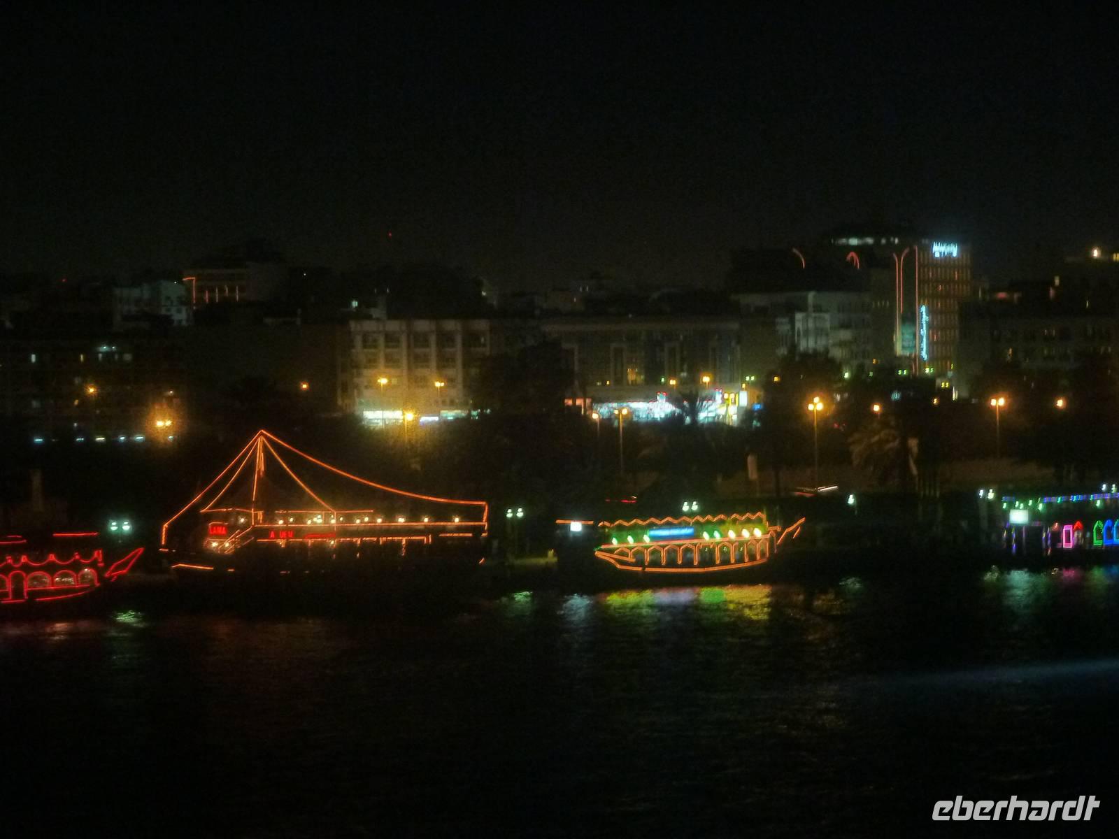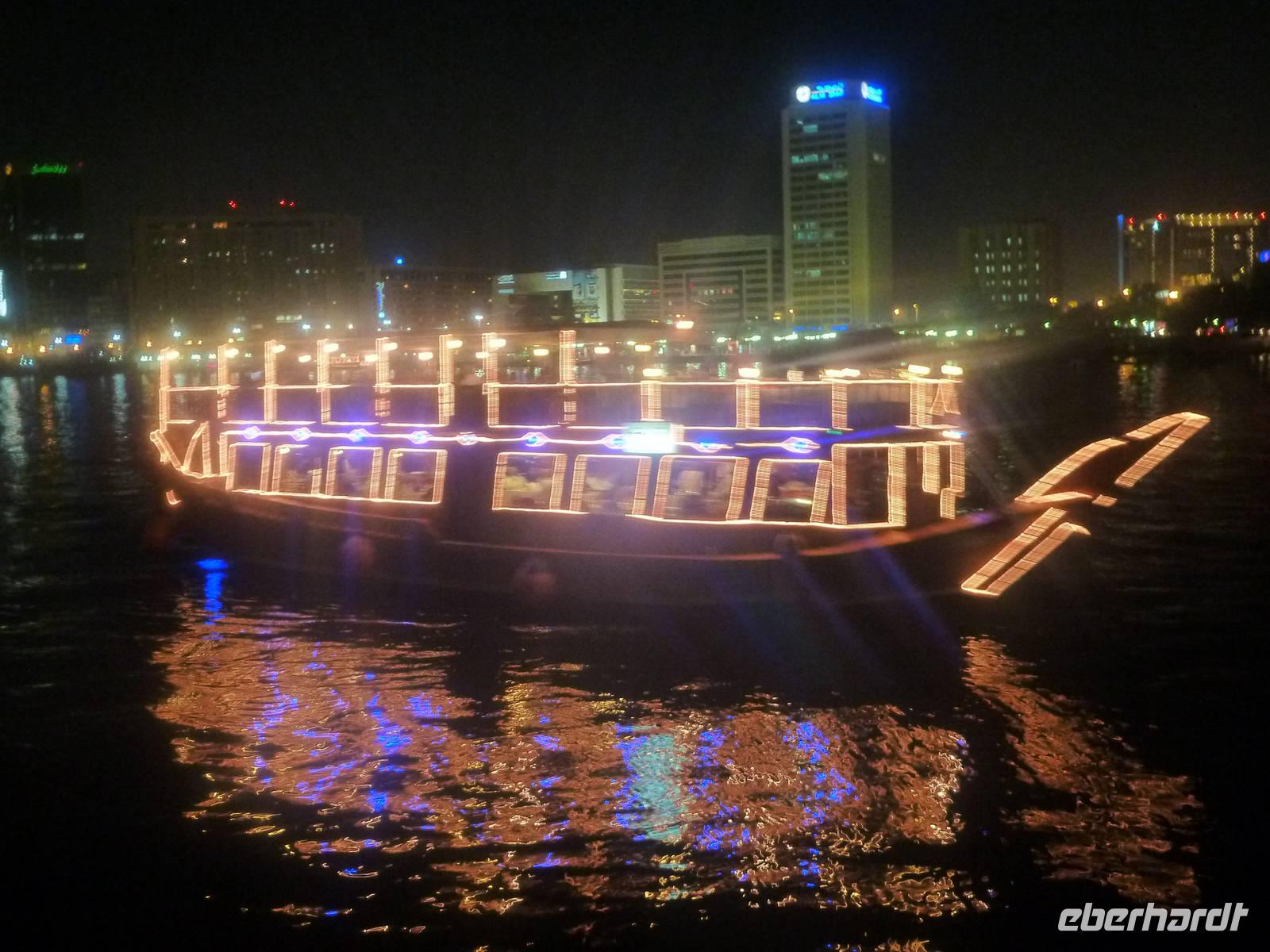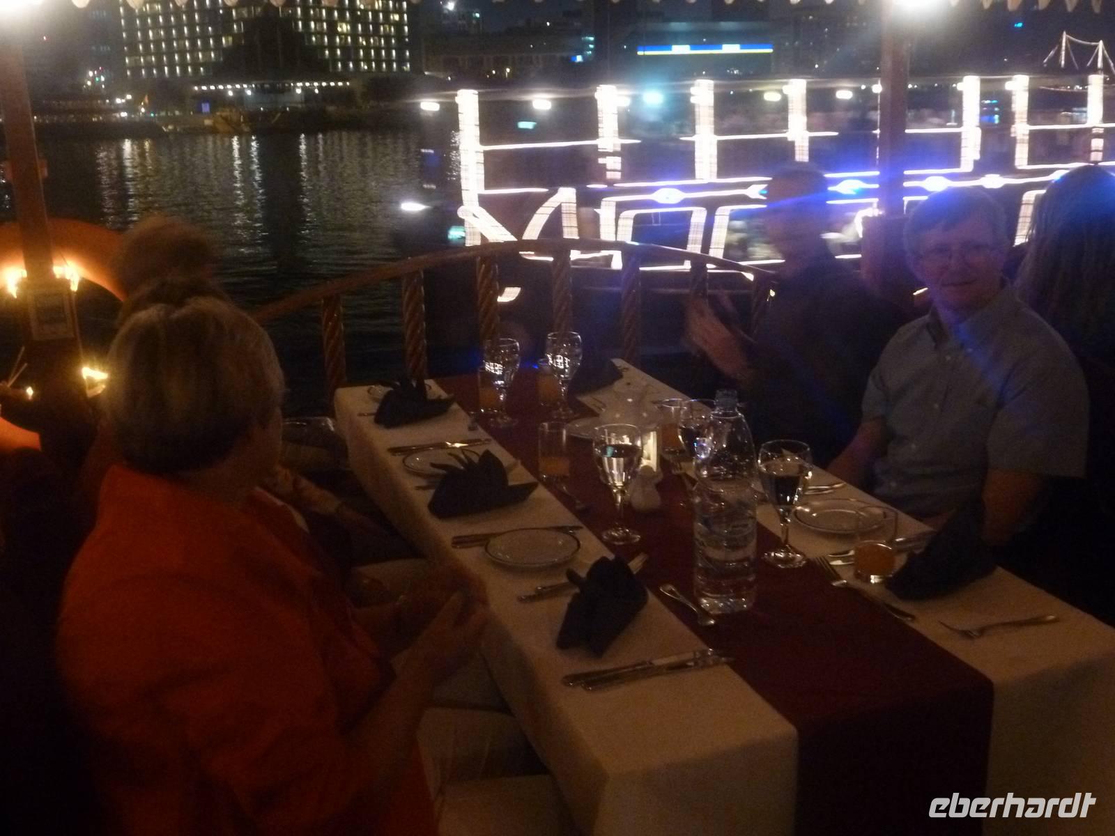 Am Abend spazierten wir gemeinsam von unserem Hotel zum Creek um an einer traditionellen Dhaufahrt teilzunehmen. So schipperten wir über den Creek und genossen den Ausblick auf das beleuchtete Dubai. Bei einem leckeren Buffet konnten wir die Seele baumeln lassen und ließen unsere Eindrücke Revue passieren.