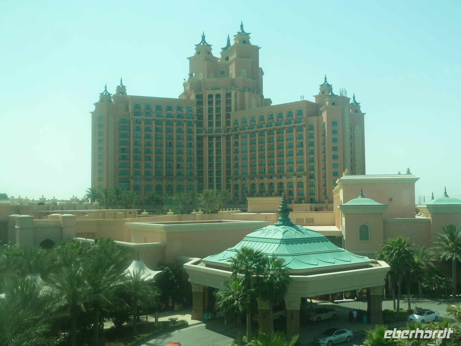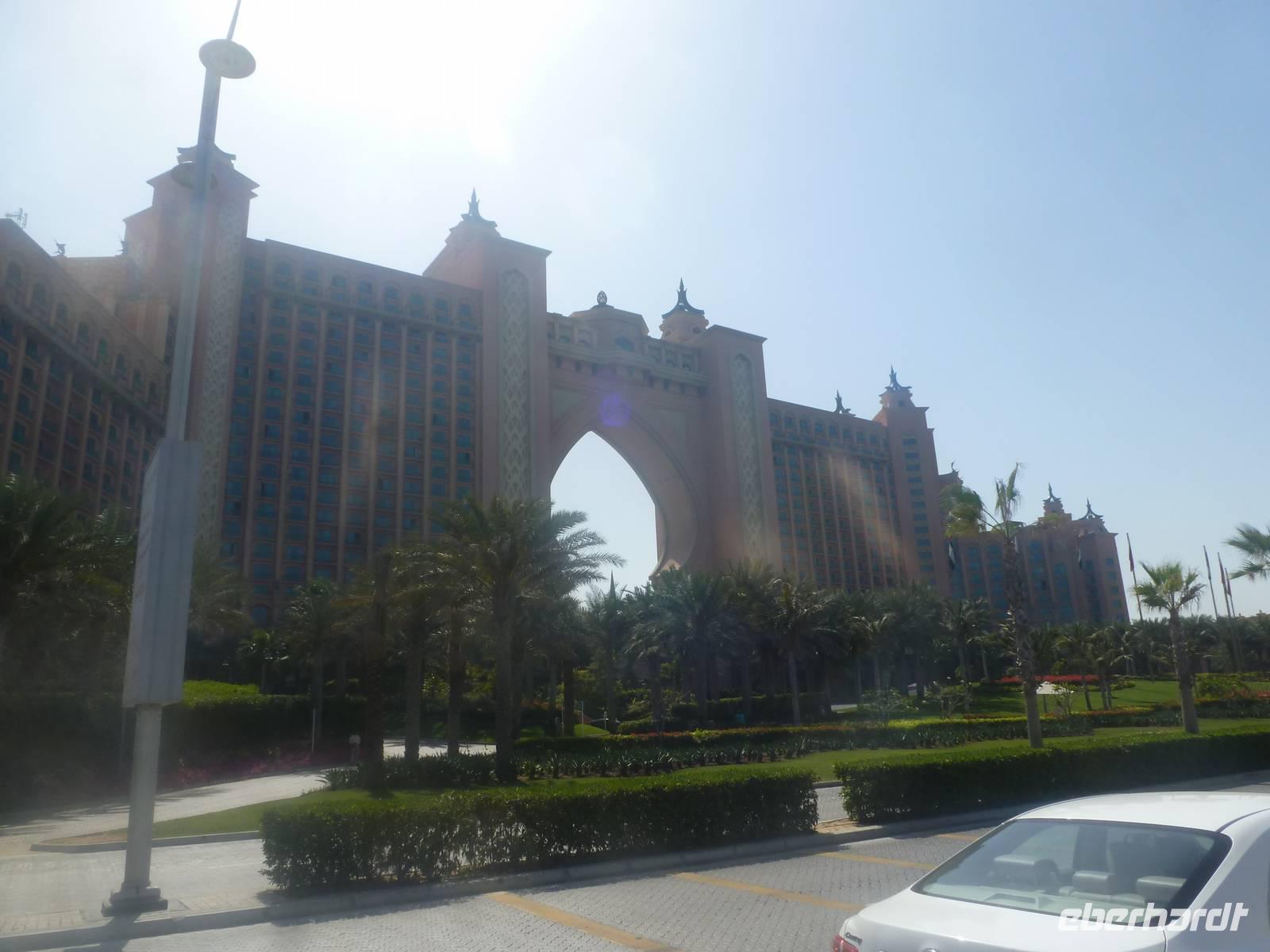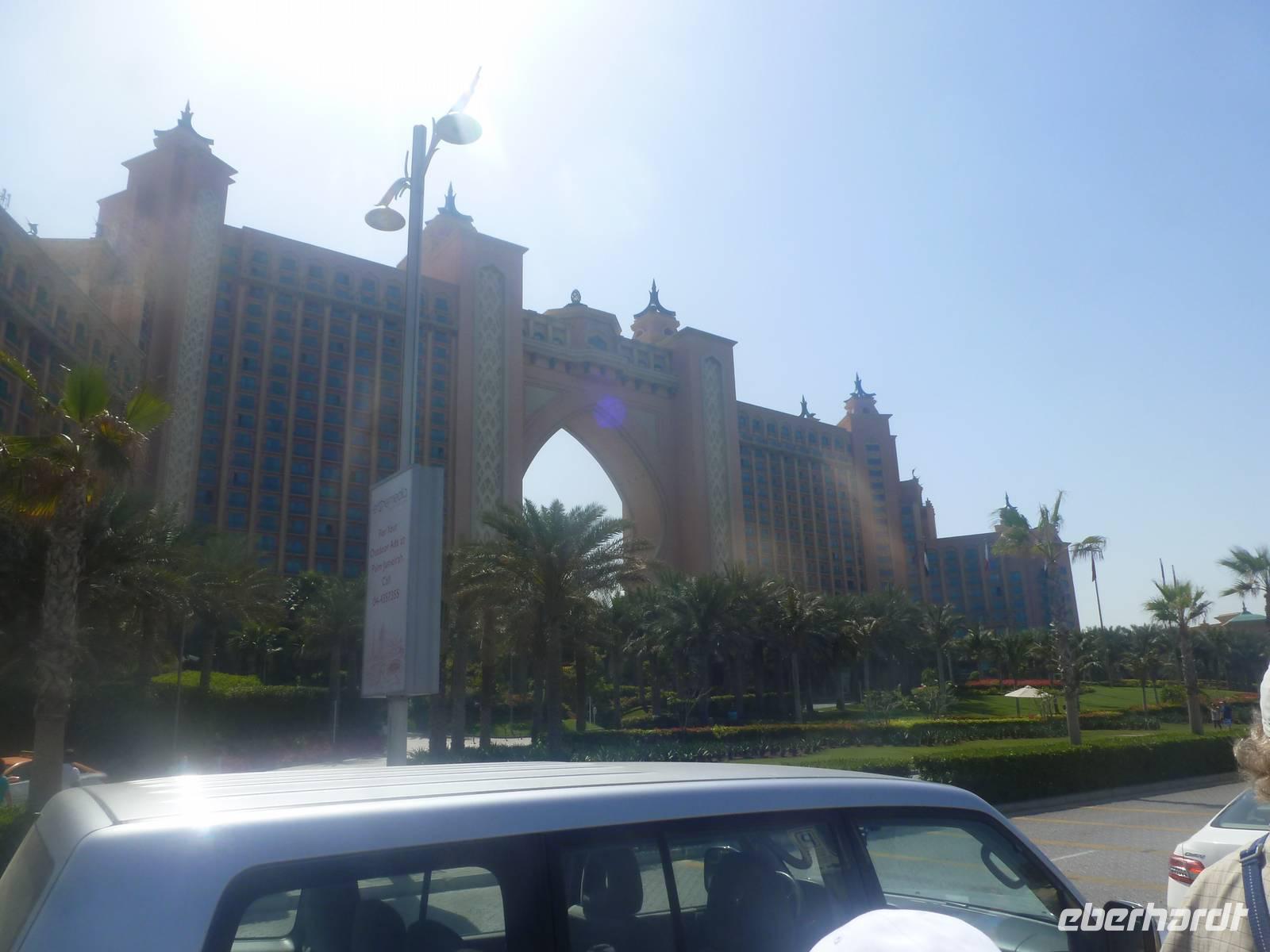 Ein Höhepunkt jagt den nächsten und so erwartet uns The Palm Jumeirah - die Palme. An der Küste von Jumeirah erstreckt Sie sich 4,5 Kilometer ins Meer und ist die Erste von mehreren künstlichen Inseln, die fertiggestellt wurde. Über eine Brücke gelangen wir auf den Stamm der Insel. Auf den insgesamt 16 Wedeln stehen ziemlich dicht nebeneinander Häuser und Villen, die zu den begehrtesten Immobilien des Emirats gehören. Anja erzählt uns, dass noch nicht alle der Häuser und Villen verkauft sind, so dass man diese teilweise zu sehr guten Preisen erwerben kann. Ein beinahe kreisförmiges, 150 Meter kreisförmiges Riff aus Sand und Steinen soll die Insel vor dem zerstörerischen Einfluss eines ungebremst anbrandenden Meeres schützen. Wir sehen, dass die Palme weitestgehend fertig gestellt ist, aber einige Baustellen doch noch zu bewältigen sind. Neben dieser Palme sollen noch zwei weitere geschaffen werden. Allerdings wurden diese Pläne aufgrund der Wirtschaftskrise erst einmal auf Eis gelegt. Am Scheitelpunkt der Palme kommen wir am spektakulären Themenhotel Atlantis an. Ein gewaltiger rosfarbener Palast, der mit seiner Gestaltung Assoziationen an versunkene Unterwasserwelten wecken will. Leider haben Nicht-Hotelgäste keinen Zutritt aber Anja und Vicky haben sich schon etwas überlegt. So laden wir alle unseren lieben Gäste zu einer Fahrt mit der Monorail ein. Das Besondere daran ist, dass wir so zumindest in den Eingangsbereich des Hotels gelangen und dort einen Eindruck gewinnen wie es wohl ganz innen aussehen muss. So schießen wir unsere Fotos. In dieser Zeit besorgen Anja und ich bereits die Ticktes für die Monorail. Wir spazieren zusamnmen zu unserer Abfahrtsstation und genießen eine herrliche Fahrt mit dieser Schwebebahn über die Palme. So gewinnen wir auch wieder andere Perspektiven vom Atlantis Hotel und der Palme mit ihren Wedeln als von unserem Bus aus.
