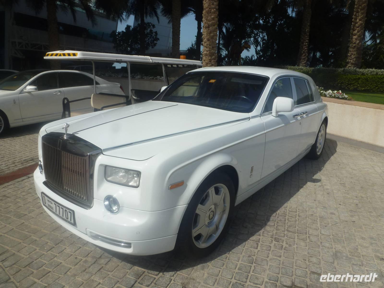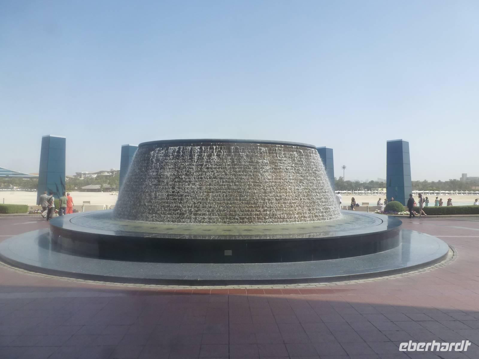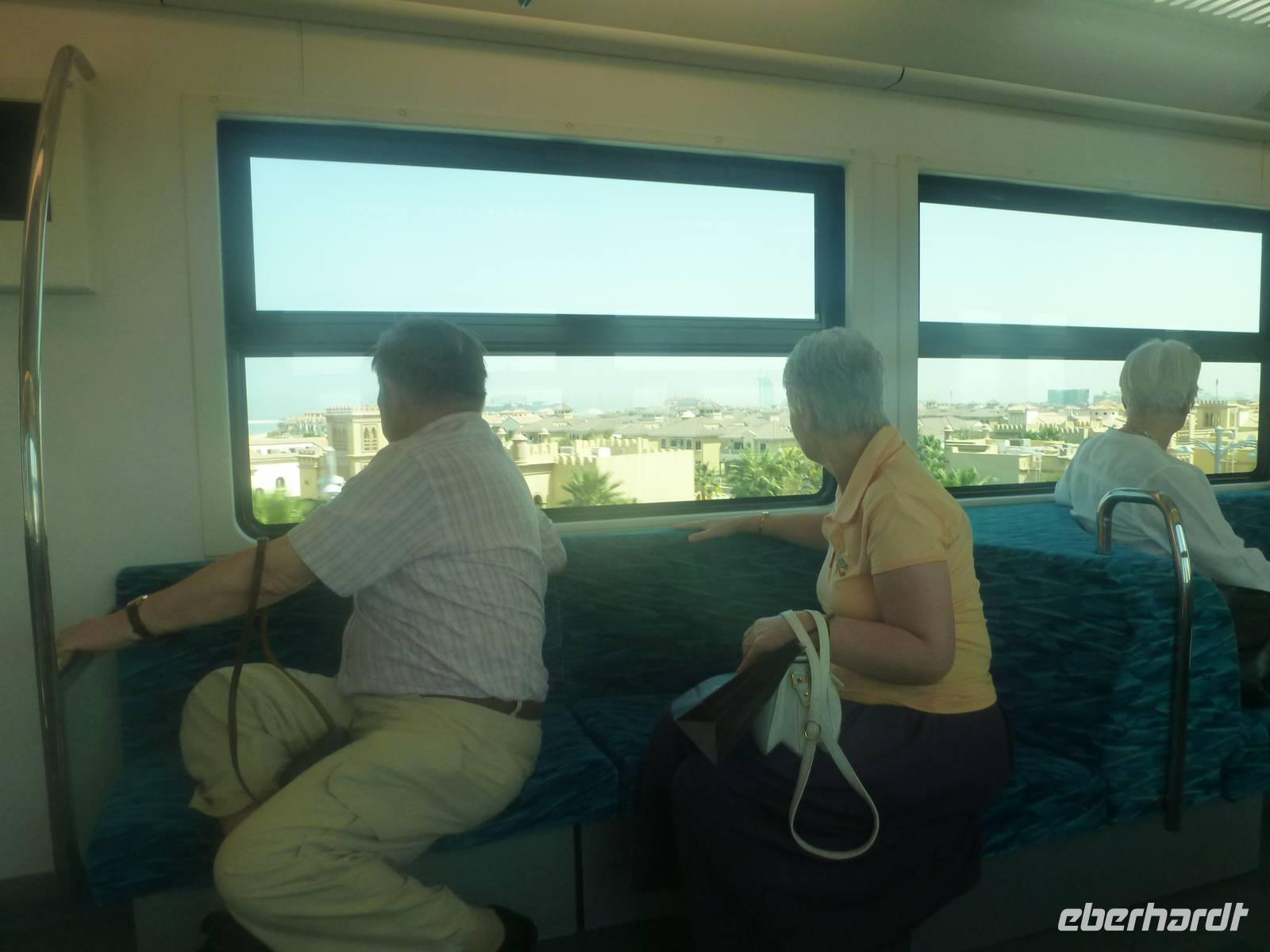 Ein Höhepunkt jagt den nächsten und so erwartet uns The Palm Jumeirah - die Palme. An der Küste von Jumeirah erstreckt Sie sich 4,5 Kilometer ins Meer und ist die Erste von mehreren künstlichen Inseln, die fertiggestellt wurde. Über eine Brücke gelangen wir auf den Stamm der Insel. Auf den insgesamt 16 Wedeln stehen ziemlich dicht nebeneinander Häuser und Villen, die zu den begehrtesten Immobilien des Emirats gehören. Anja erzählt uns, dass noch nicht alle der Häuser und Villen verkauft sind, so dass man diese teilweise zu sehr guten Preisen erwerben kann. Ein beinahe kreisförmiges, 150 Meter kreisförmiges Riff aus Sand und Steinen soll die Insel vor dem zerstörerischen Einfluss eines ungebremst anbrandenden Meeres schützen. Wir sehen, dass die Palme weitestgehend fertig gestellt ist, aber einige Baustellen doch noch zu bewältigen sind. Neben dieser Palme sollen noch zwei weitere geschaffen werden. Allerdings wurden diese Pläne aufgrund der Wirtschaftskrise erst einmal auf Eis gelegt. Am Scheitelpunkt der Palme kommen wir am spektakulären Themenhotel Atlantis an. Ein gewaltiger rosfarbener Palast, der mit seiner Gestaltung Assoziationen an versunkene Unterwasserwelten wecken will. Leider haben Nicht-Hotelgäste keinen Zutritt aber Anja und Vicky haben sich schon etwas überlegt. So laden wir alle unseren lieben Gäste zu einer Fahrt mit der Monorail ein. Das Besondere daran ist, dass wir so zumindest in den Eingangsbereich des Hotels gelangen und dort einen Eindruck gewinnen wie es wohl ganz innen aussehen muss. So schießen wir unsere Fotos. In dieser Zeit besorgen Anja und ich bereits die Ticktes für die Monorail. Wir spazieren zusamnmen zu unserer Abfahrtsstation und genießen eine herrliche Fahrt mit dieser Schwebebahn über die Palme. So gewinnen wir auch wieder andere Perspektiven vom Atlantis Hotel und der Palme mit ihren Wedeln als von unserem Bus aus.
