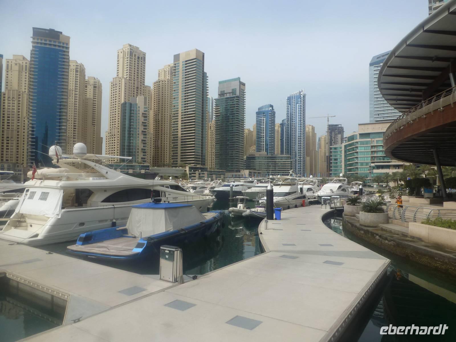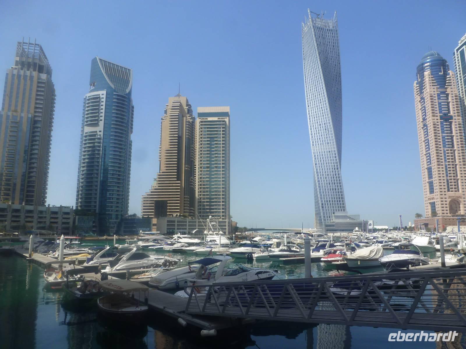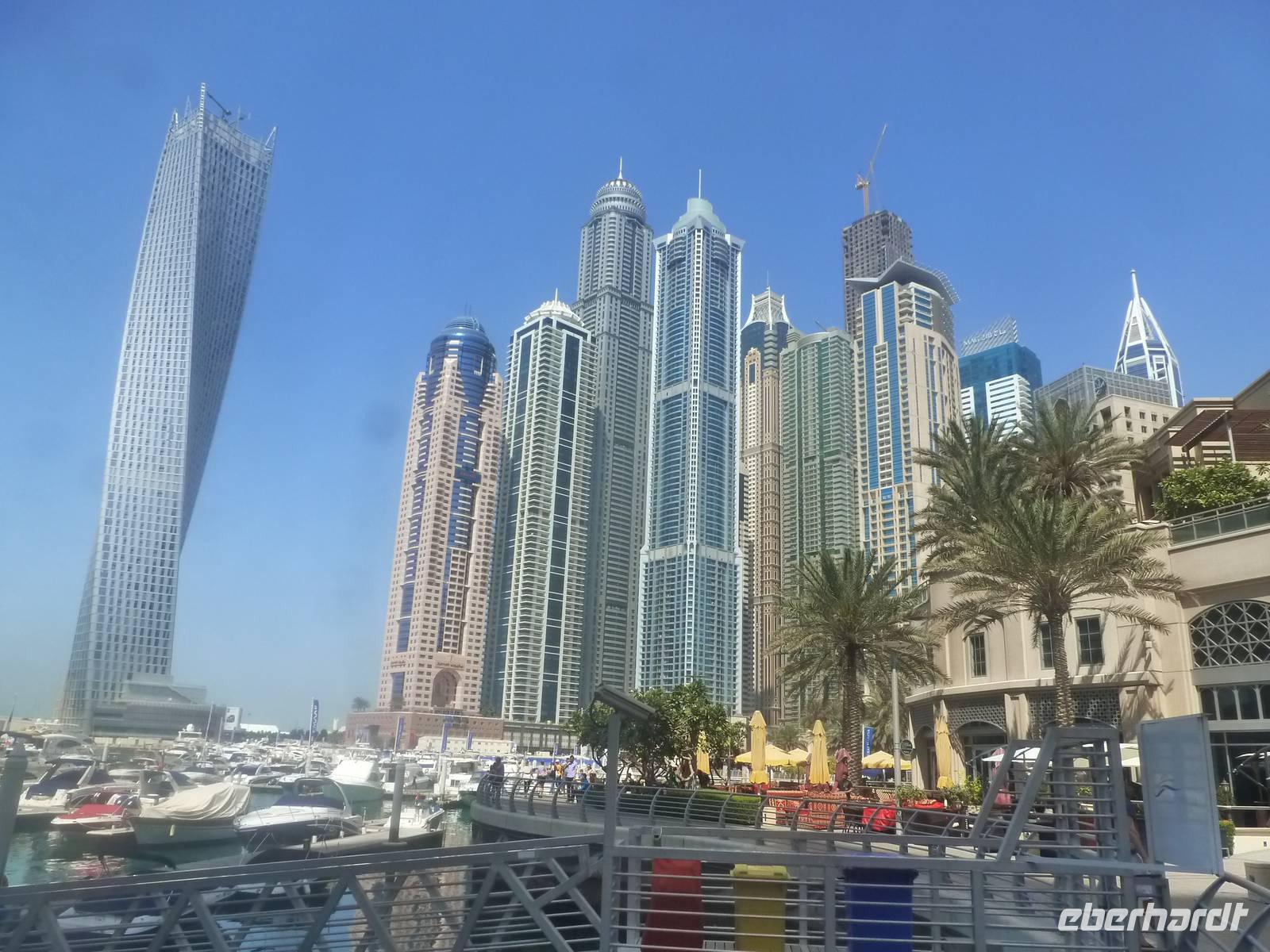 Anschließend geht es weiter zur Dubai Marina. Sie entstand an einer vier Kilometer langen künstlichen Lagune. Hier wurden neben dem Yachthafen - Hotels, Parks, Supermärkte, Bürogebäude und Wohnhäuser gebaut. Mit durchschnittlichen Höhen von um die 150 Meter fühlt man sich hier ein wenig an Hongkong oder Manhattan erinnert. So bummeln wir entspannt entlang der Lagune und staunen über das gedrehte Gebäude, welches sich vor unseren Augen auftürmt.