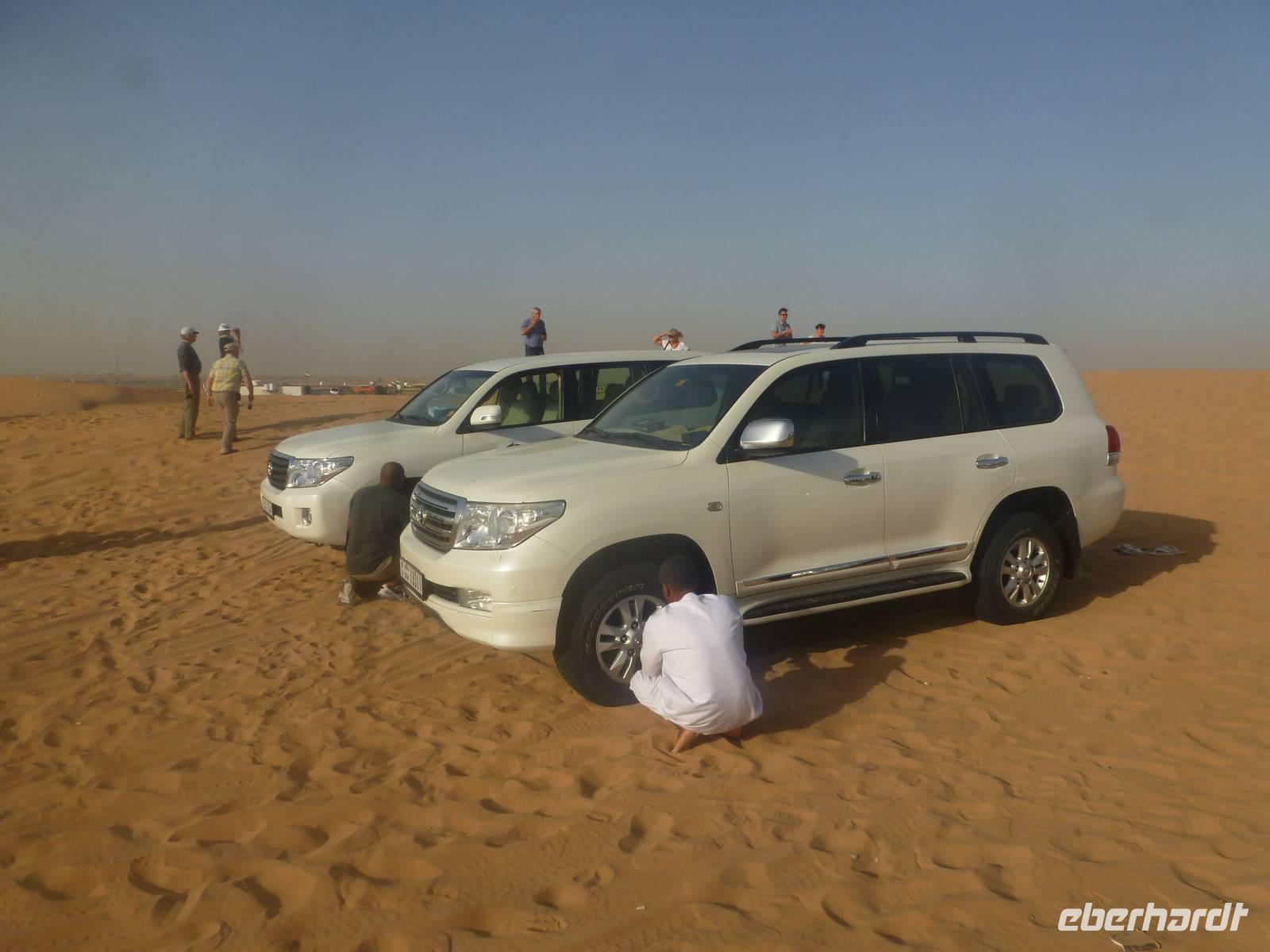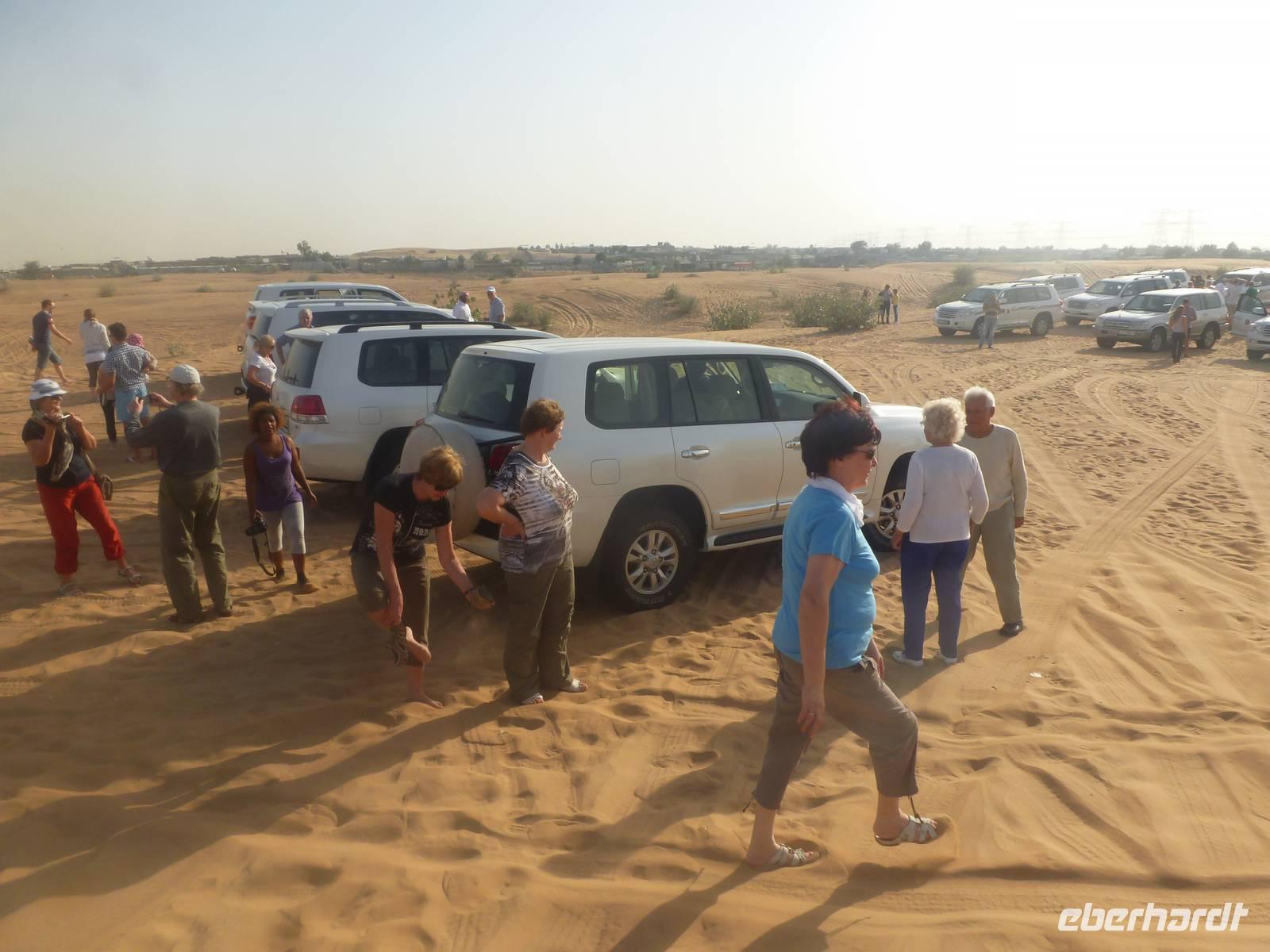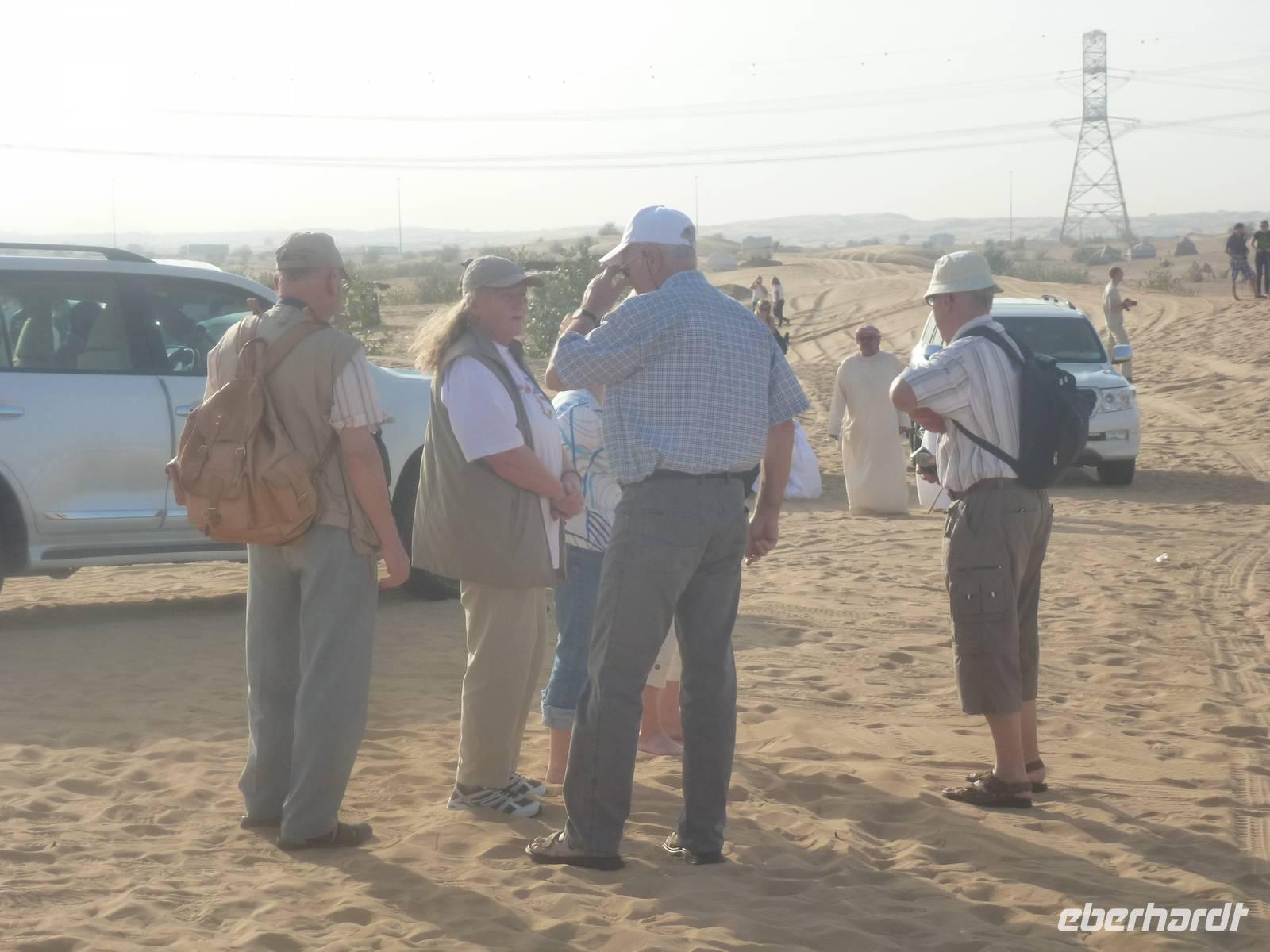 Alle wieder mit gesunder Gesichtsfarbe im Hotel angekommen, genießen wir noch ein leckeres Mittagsbuffet, um uns dann für unser "Abenteuer" Wüste auszustatten. Direkt vor unserem Hotel werden wir von den Jeeps abgeholt. Je sechs Personen passen in einen Jeep. Bei den erfahrenen Fahren fühlen wir uns sehr gut aufgehoben. Etwa zwei Drittel der Vereinigten Arabischen Emirate sind Sandwüste, Geröllwüste und savannenähnliche Halbwüste. Die Sandwüste besteht zum beträchtlichen Teil aus Dünen, die sich mit dem Wind vom Meer weg bewegen und sich zu immer neuen, bis zu 150 Meter hohen Formationen auftürmen. So fahren wir zuerst noch die geteerte Straße entlang bevor die Jeeps kurz anhalten um etwas Luft aus den Reifen zu lassen, damit diese auf dem weichen Wüstensand besser greifen können. Anschließend fahren wir mit einer doch beachtlichen Geschwindigkeit über die Dünen. Einigen von uns wurde dann doch schon etwas mulmig aber alle haben tapfer durchgehalten. Bei einem kurzen Halt genießen wir die Atmosphäre in der Wüste und machen wunderschöne Aufnahmen. Natürlich schießen wir auch ein Gruppenbild mit unseren Fahrern. Am Abend, pünktlich zum Sonnenuntergang, erreichen wir unser Wüstencamp, wo es viel zu entdecken gibt. So genießen wir unser Barbecue mit allerlei Köstlichkeiten vom Grill und leckeren Salaten. Einige von uns rauchen Shisha, kleiden sich wie die Emiratis oder verzieren Ihre Haut mit Henna. Den krönenden Abschluß des Abends bildete eine Bauchtanzdarbietung sowie ein Derwisch-Tänzer.