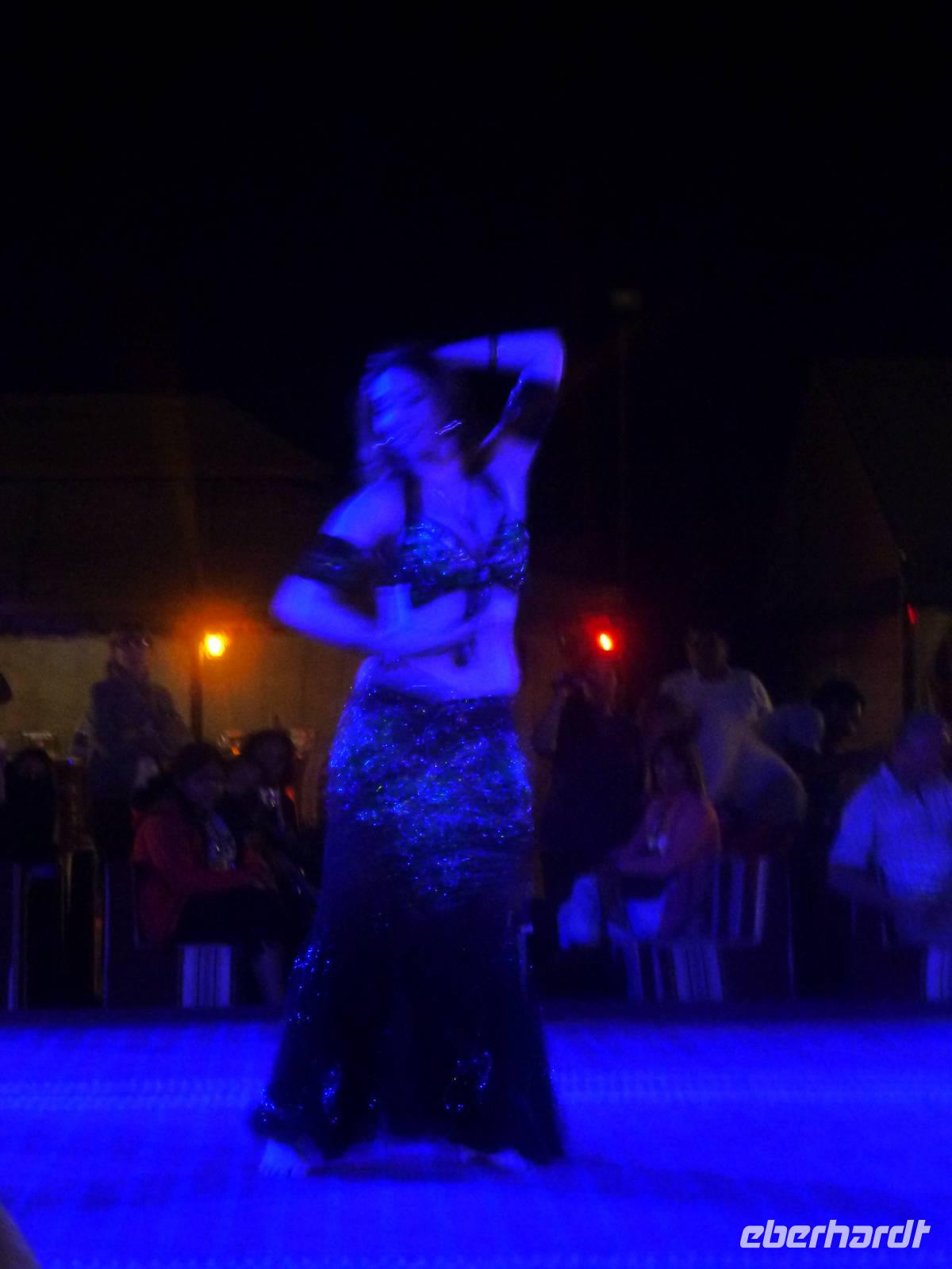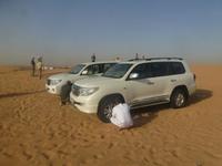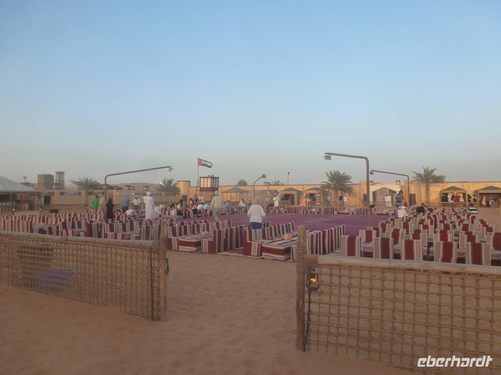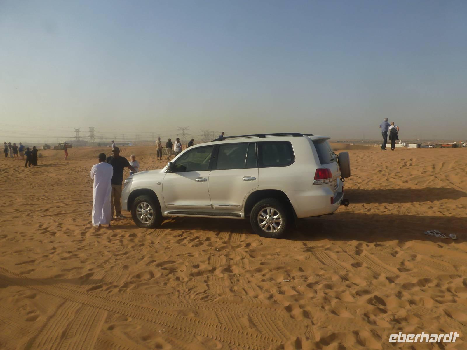 Alle wieder mit gesunder Gesichtsfarbe im Hotel angekommen, genießen wir noch ein leckeres Mittagsbuffet, um uns dann für unser "Abenteuer" Wüste auszustatten. Direkt vor unserem Hotel werden wir von den Jeeps abgeholt. Je sechs Personen passen in einen Jeep. Bei den erfahrenen Fahren fühlen wir uns sehr gut aufgehoben. Etwa zwei Drittel der Vereinigten Arabischen Emirate sind Sandwüste, Geröllwüste und savannenähnliche Halbwüste. Die Sandwüste besteht zum beträchtlichen Teil aus Dünen, die sich mit dem Wind vom Meer weg bewegen und sich zu immer neuen, bis zu 150 Meter hohen Formationen auftürmen. So fahren wir zuerst noch die geteerte Straße entlang bevor die Jeeps kurz anhalten um etwas Luft aus den Reifen zu lassen, damit diese auf dem weichen Wüstensand besser greifen können. Anschließend fahren wir mit einer doch beachtlichen Geschwindigkeit über die Dünen. Einigen von uns wurde dann doch schon etwas mulmig aber alle haben tapfer durchgehalten. Bei einem kurzen Halt genießen wir die Atmosphäre in der Wüste und machen wunderschöne Aufnahmen. Natürlich schießen wir auch ein Gruppenbild mit unseren Fahrern. Am Abend, pünktlich zum Sonnenuntergang, erreichen wir unser Wüstencamp, wo es viel zu entdecken gibt. So genießen wir unser Barbecue mit allerlei Köstlichkeiten vom Grill und leckeren Salaten. Einige von uns rauchen Shisha, kleiden sich wie die Emiratis oder verzieren Ihre Haut mit Henna. Den krönenden Abschluß des Abends bildete eine Bauchtanzdarbietung sowie ein Derwisch-Tänzer.