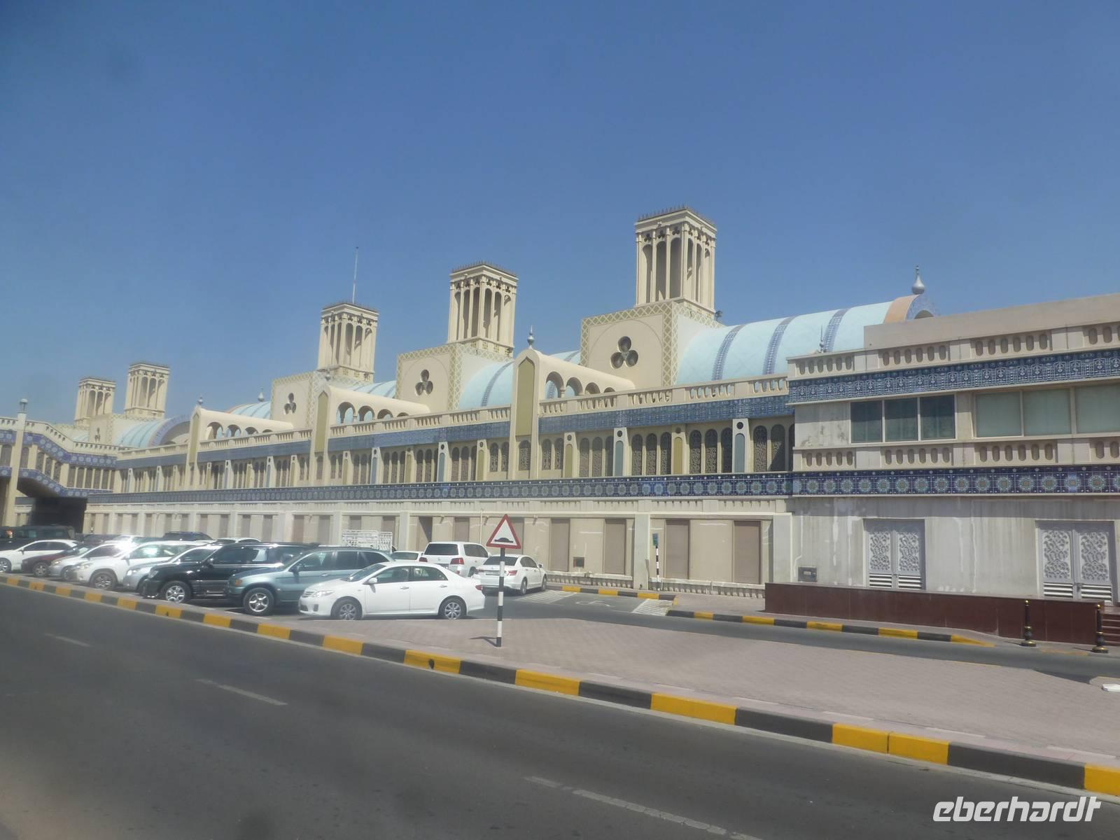 Weiter führt uns unsere Reise zum berühmten Blauen Souk auch "Blue Souk" genannt. Sechs lang gestreckte Gebäude mit blauer Kachel-Dekoration und aufgesetzten Windtürmen geben dem Bauwerk aus dem Jahr 1978 das Aussehen eines Belle-Epoque-Bahnhofs. Der Souk ist das meistfotografierteste Bauwerk des Emirats und gilt als Wahrzeichen Sharjahs. Rund 600 Geschäfte bieten uns hier Kosmetika, Elektronikgeräte, Textilien, Gebetsteppiche und Haushaltswaren an. Für jeden Geschmack ist hier etwas dabei. Von hier genießen auch viele von uns den Blick auf Sharjah in der Sonne. Einfach herrlich während die Lieben daheim frieren. Anja und Vicky nutzen die Möglickeit sich mit einer neuen "Abaya" einzudecken und so Ihre Gäste für den Ausflug nach Abu Dhabi zu überraschen