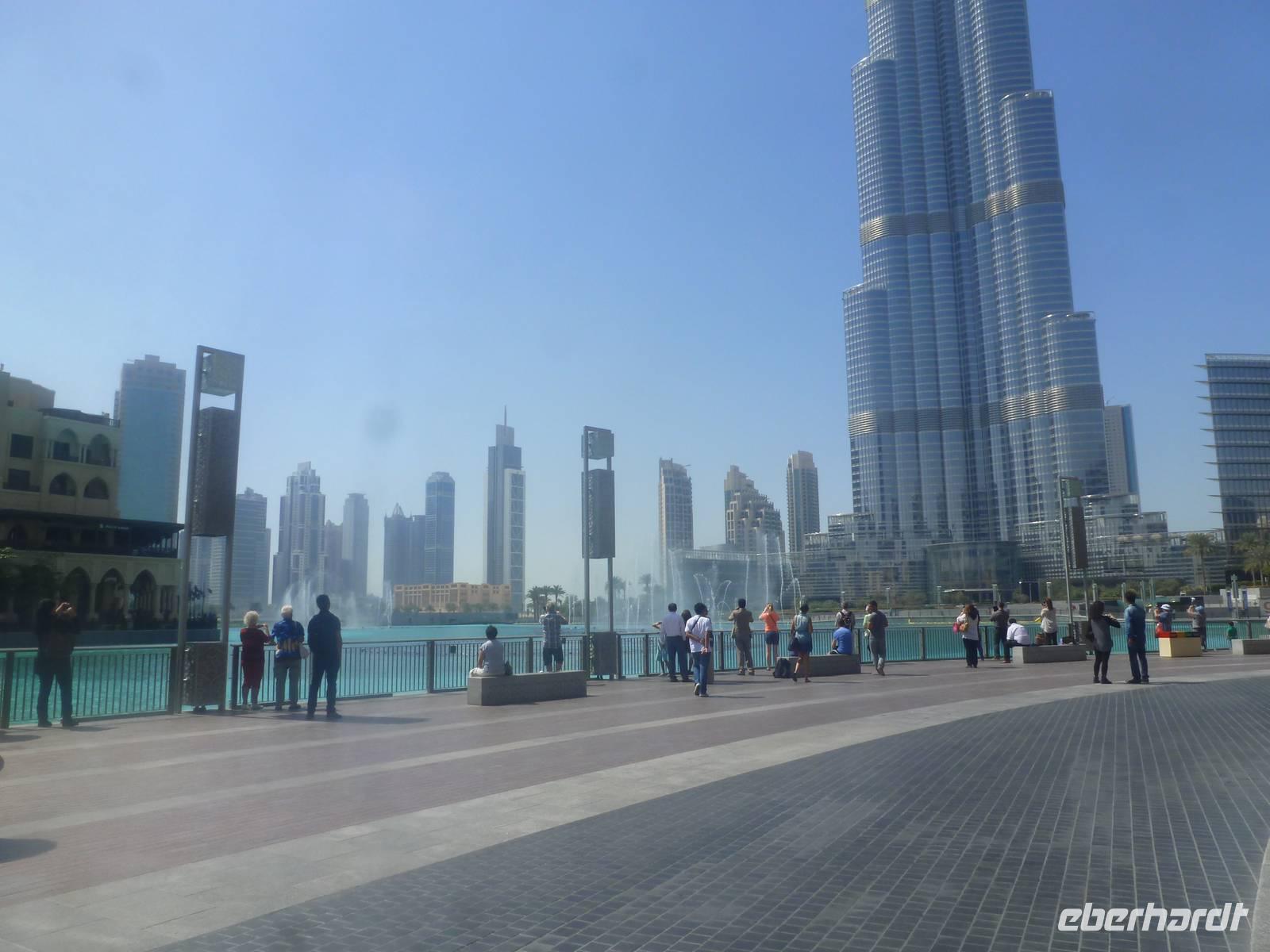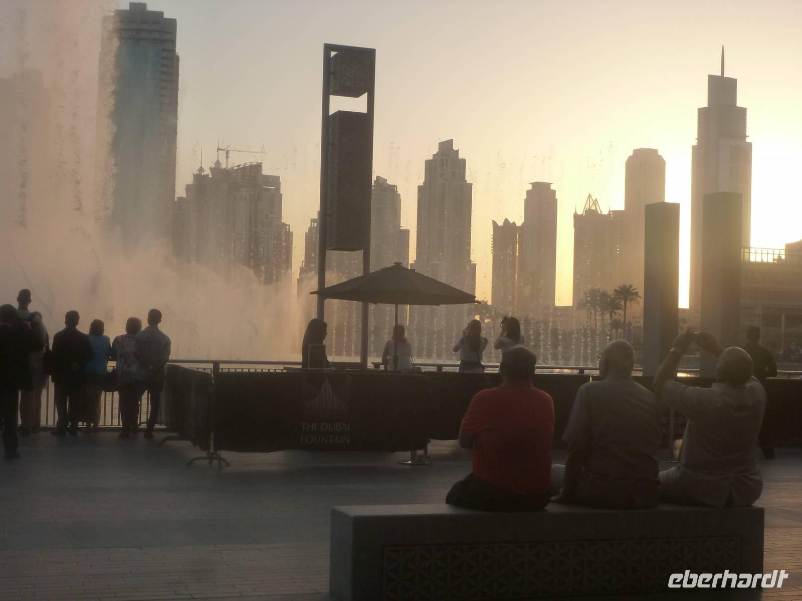 Am Ende des Tages erwartet uns noch ein besonderes Ereignis. Burj Khalifa ist auch das Zentrum des neu geschaffenen Stadtteils Downtown Burj Khalifa, zu dem ein künstlicher See mit der 150 Meter hohen Dubai Fountain gehört. Hier erfreuen wir uns an dem abendlich in regelmäßigen Abständen stattfindenden Licht - und Wasserspiel. Untermalt von klassischer und arabischer Musik, tanzen Wasserfontänen, in Szene gesetzt von Tausenden von Lichtern. Ein herrliches Schauspiel!