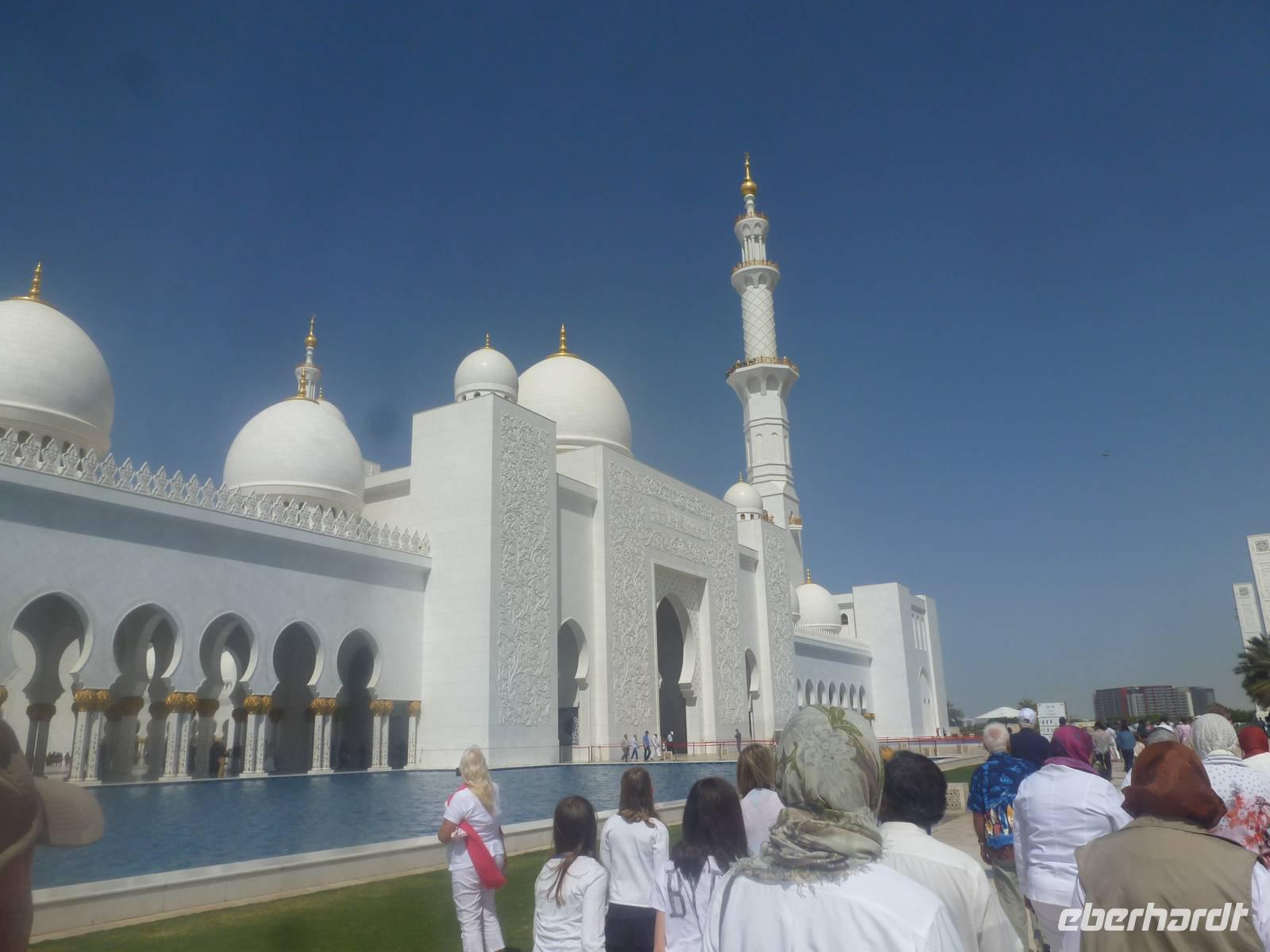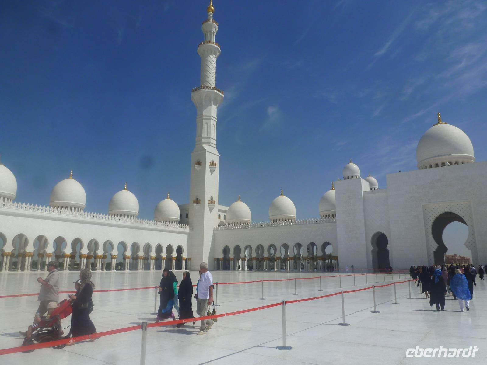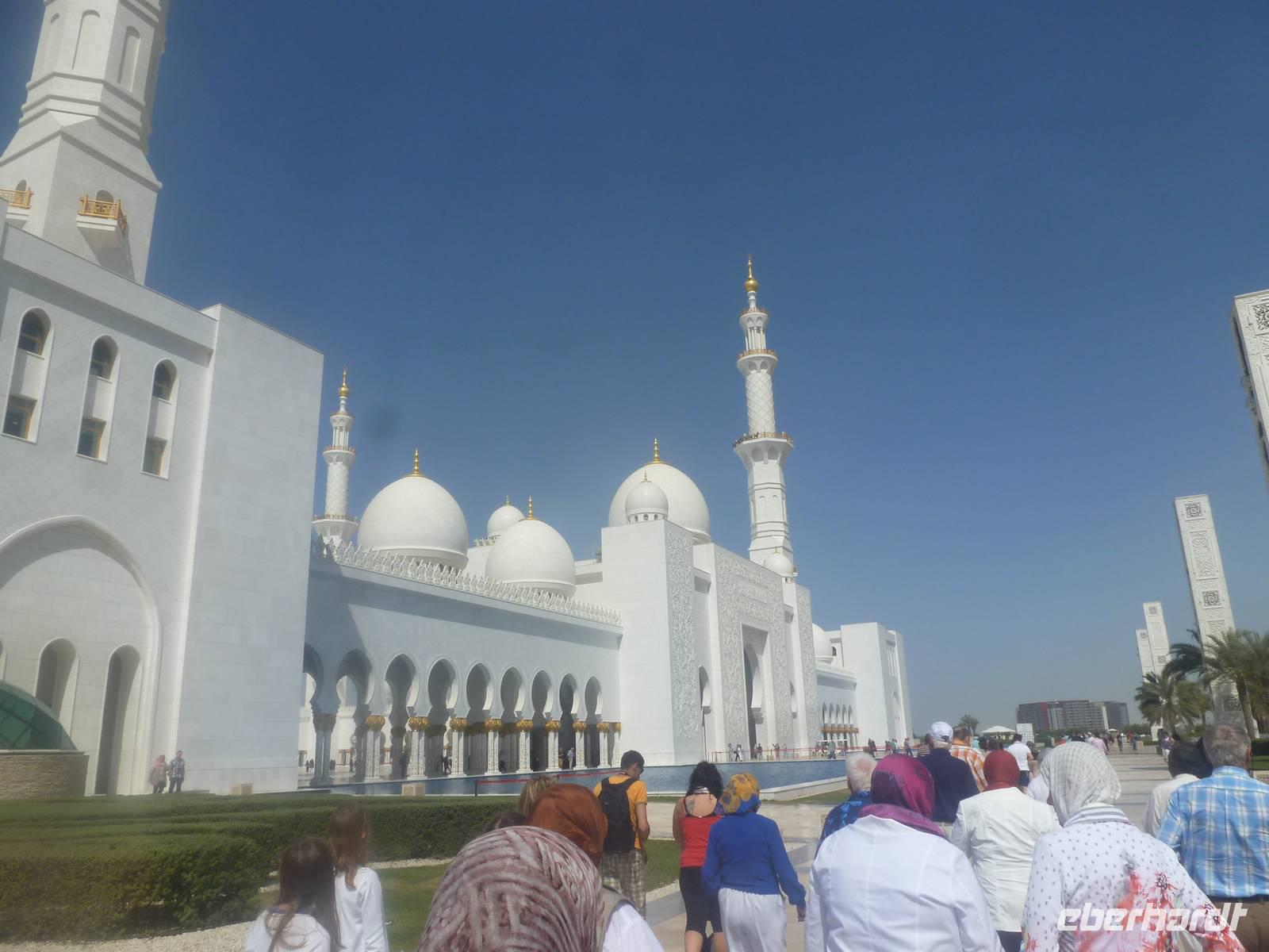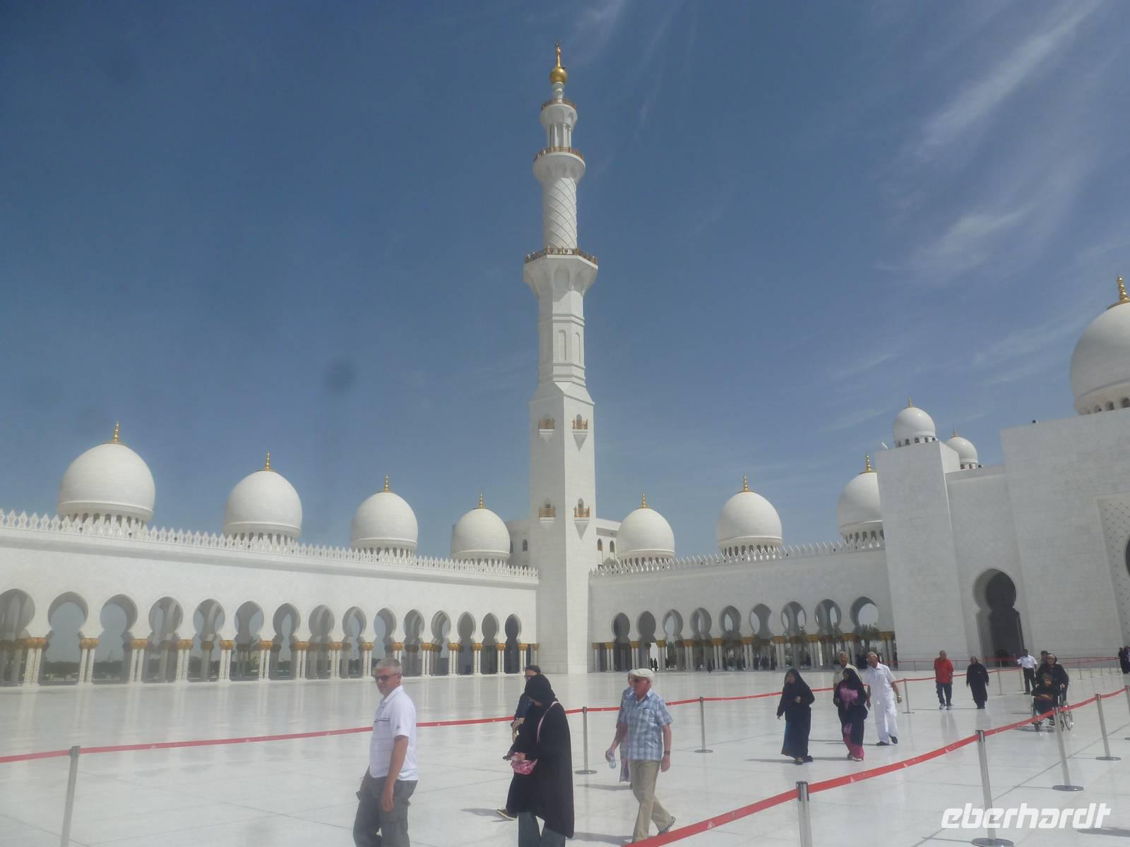 Heute reisen wir nach Abu Dhabi-Stadt, Hauptstadt und Regierungssitz der Vereinigten Arabischen Emirate. Anja und Vicky empfangen Ihre Gäste heute im traditionnellen Gewand der islamischen Welt der Emirate: der "Abaya". Natürlich sind wir so auch ein beliebtes Fotomotiv neben dem luxuriösen Dubai und seinen Sehenswürdigkeiten Es ist gar nicht so leicht in diesem Gewand Wasser im Bus zu verteilen und zu schauen, dass das Kopftuch auch immer an seiner richtigen Stelle sitzt. Aber man gewöhnt sich an alles Auch die Frauen unter uns haben mit diesem Problem zu kämpfen. Aber schick sehen wir alle aus. Abu Dhabi bedeckt eine flache Sandinsel, die mit dem Festland durch zwei Brücken verbunden ist. Uns fällt auf, dass hier vor allem üppige Grünflächen das Stadtbild prägen. Es dauert nicht lang und und vor unseren Augen erhebt sich unübersehbar die mächtige Sheikh-Zayed-Moschee. Wir staunen über die drei riesigen Kuppeln, 79 kleinere Kuppeln, vier hohe Minarette sowie über die zahlreichen Nebengebäude und Arkaden. Die größte Moschee der Vereinigten Arabischen Emirate bietet Platz für 1000 Gläubige. Im Inneren bedeckt ein 5600 Quadratmeter großer und 47 Tonnen schwerer Teppich den Boden. So gehen wir hinein um uns selbst von dem prächtigen Bauwerk zu überzeugen. Natürlich gehört es dazu, dass wir alle unsere Schuhe ausziehen.
