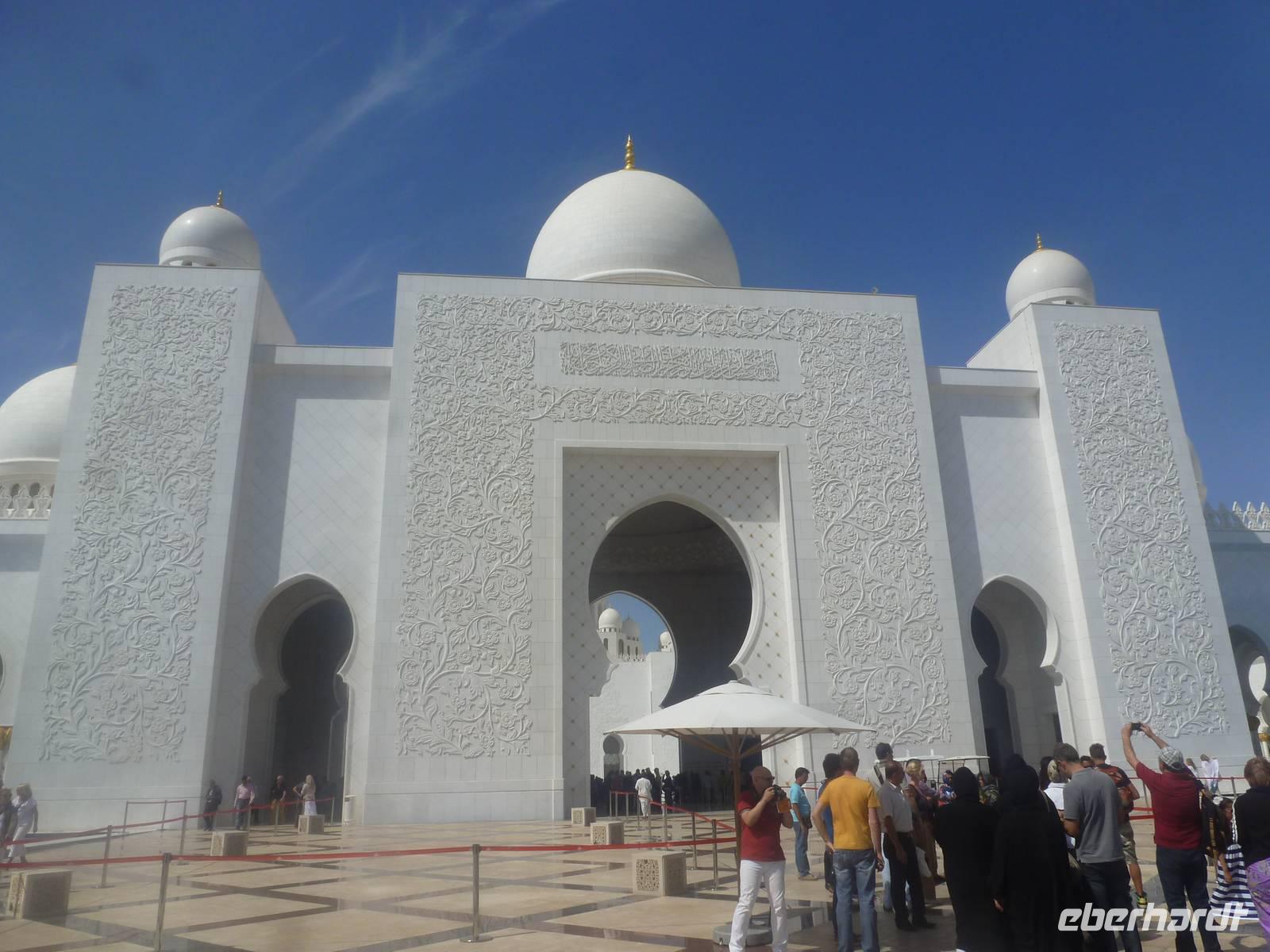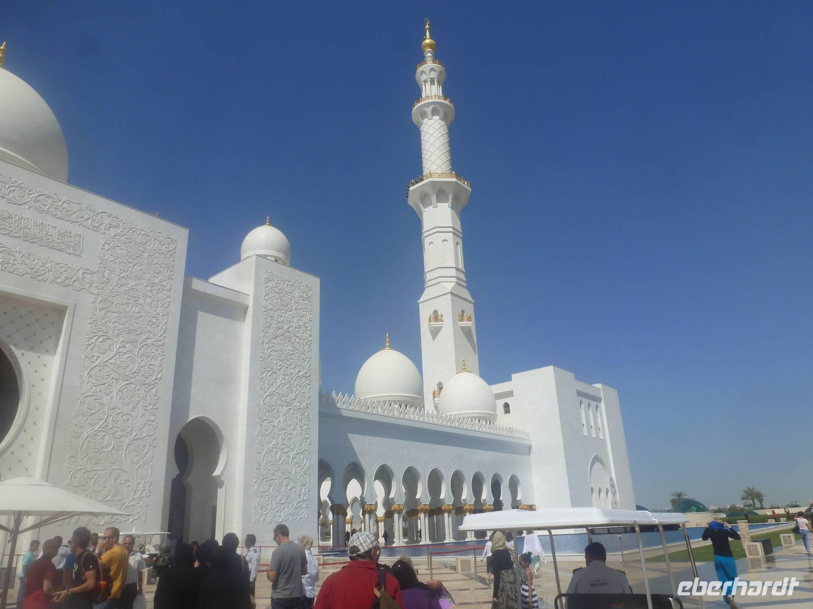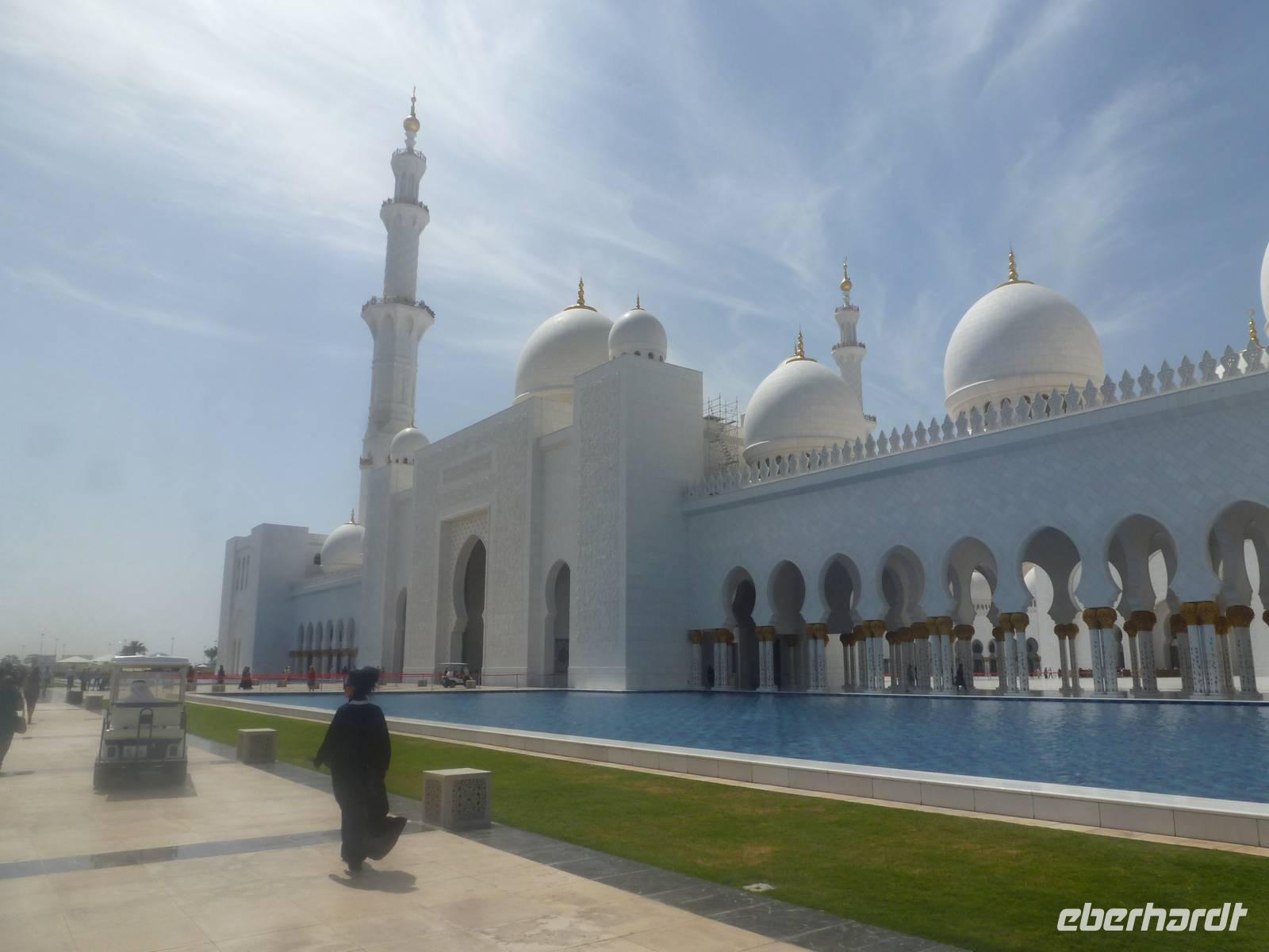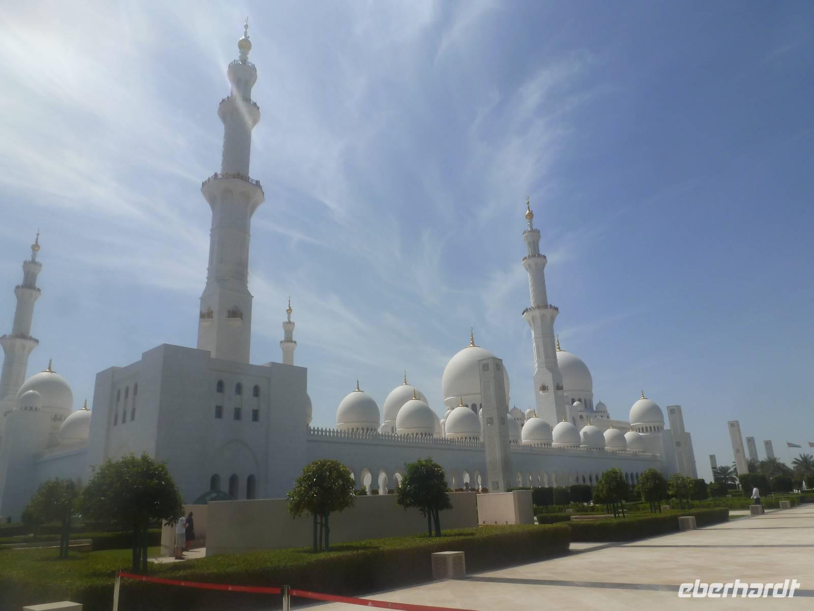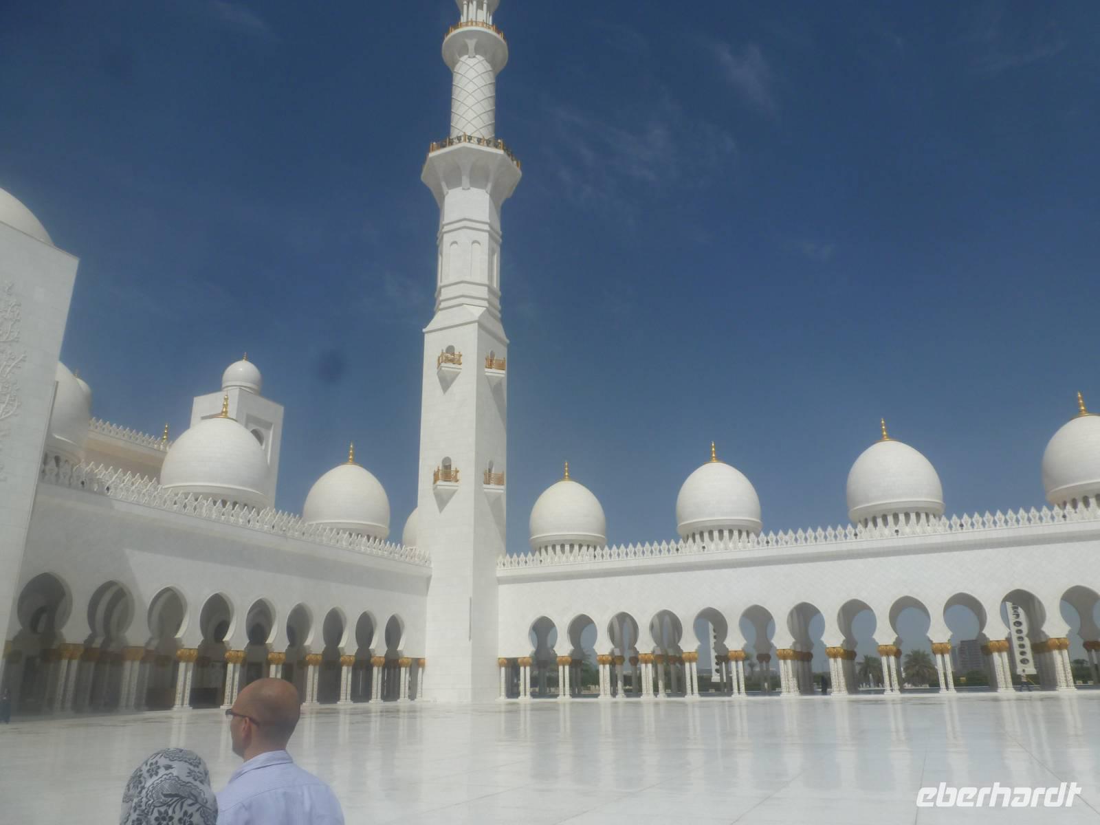 Heute reisen wir nach Abu Dhabi-Stadt, Hauptstadt und Regierungssitz der Vereinigten Arabischen Emirate. Anja und Vicky empfangen Ihre Gäste heute im traditionnellen Gewand der islamischen Welt der Emirate: der "Abaya". Natürlich sind wir so auch ein beliebtes Fotomotiv neben dem luxuriösen Dubai und seinen Sehenswürdigkeiten Es ist gar nicht so leicht in diesem Gewand Wasser im Bus zu verteilen und zu schauen, dass das Kopftuch auch immer an seiner richtigen Stelle sitzt. Aber man gewöhnt sich an alles Auch die Frauen unter uns haben mit diesem Problem zu kämpfen. Aber schick sehen wir alle aus. Abu Dhabi bedeckt eine flache Sandinsel, die mit dem Festland durch zwei Brücken verbunden ist. Uns fällt auf, dass hier vor allem üppige Grünflächen das Stadtbild prägen. Es dauert nicht lang und und vor unseren Augen erhebt sich unübersehbar die mächtige Sheikh-Zayed-Moschee. Wir staunen über die drei riesigen Kuppeln, 79 kleinere Kuppeln, vier hohe Minarette sowie über die zahlreichen Nebengebäude und Arkaden. Die größte Moschee der Vereinigten Arabischen Emirate bietet Platz für 1000 Gläubige. Im Inneren bedeckt ein 5600 Quadratmeter großer und 47 Tonnen schwerer Teppich den Boden. So gehen wir hinein um uns selbst von dem prächtigen Bauwerk zu überzeugen. Natürlich gehört es dazu, dass wir alle unsere Schuhe ausziehen.