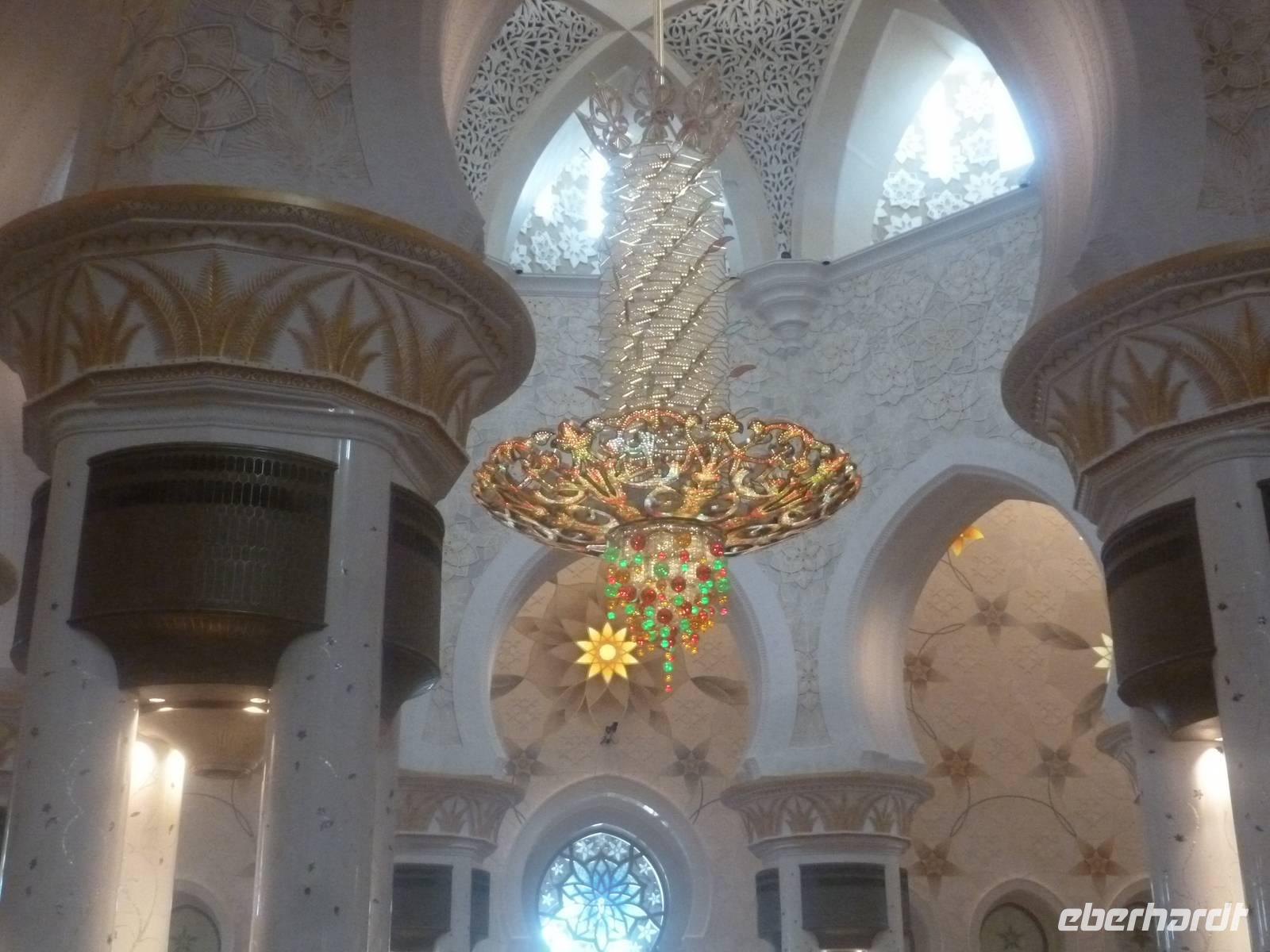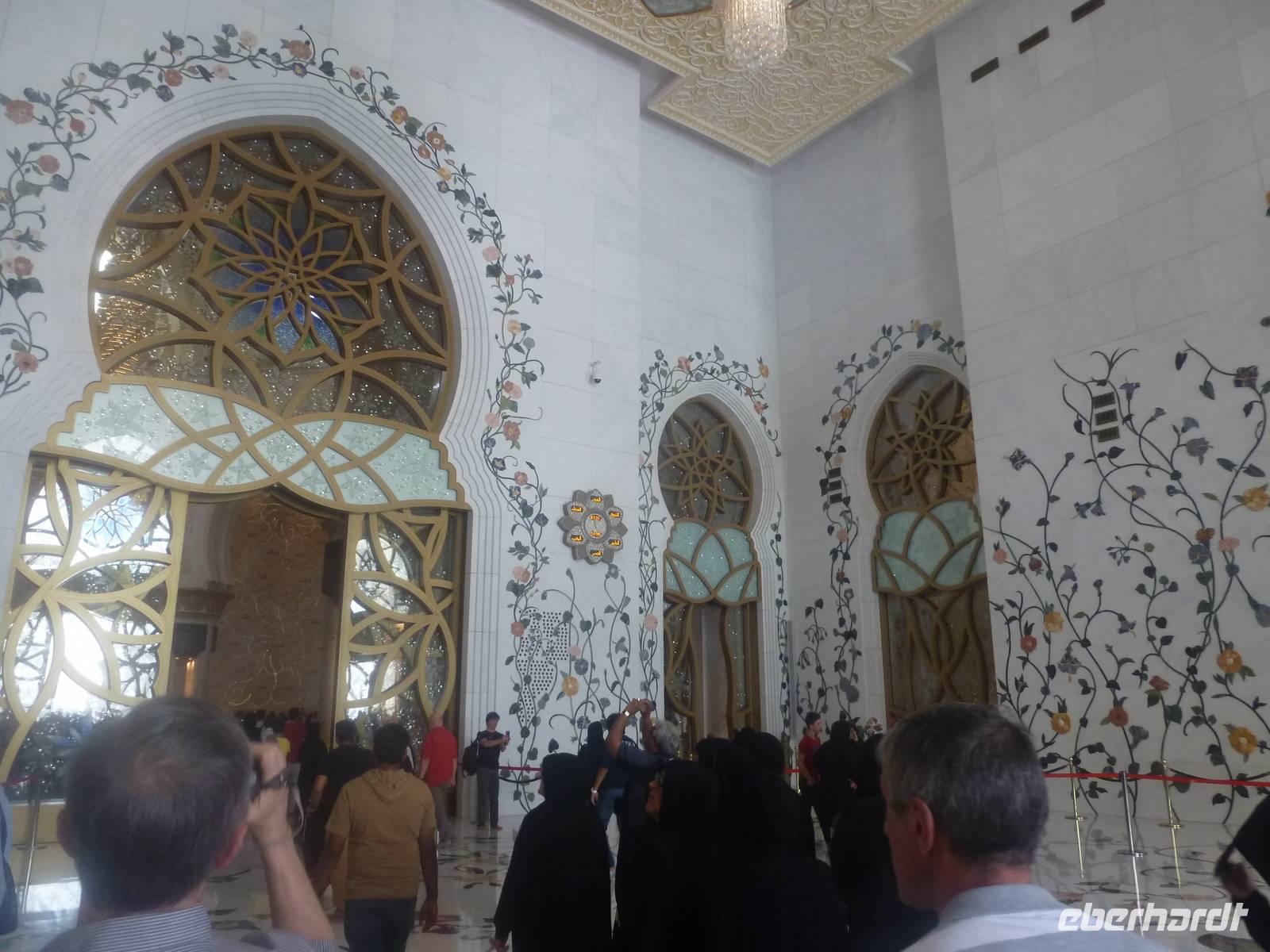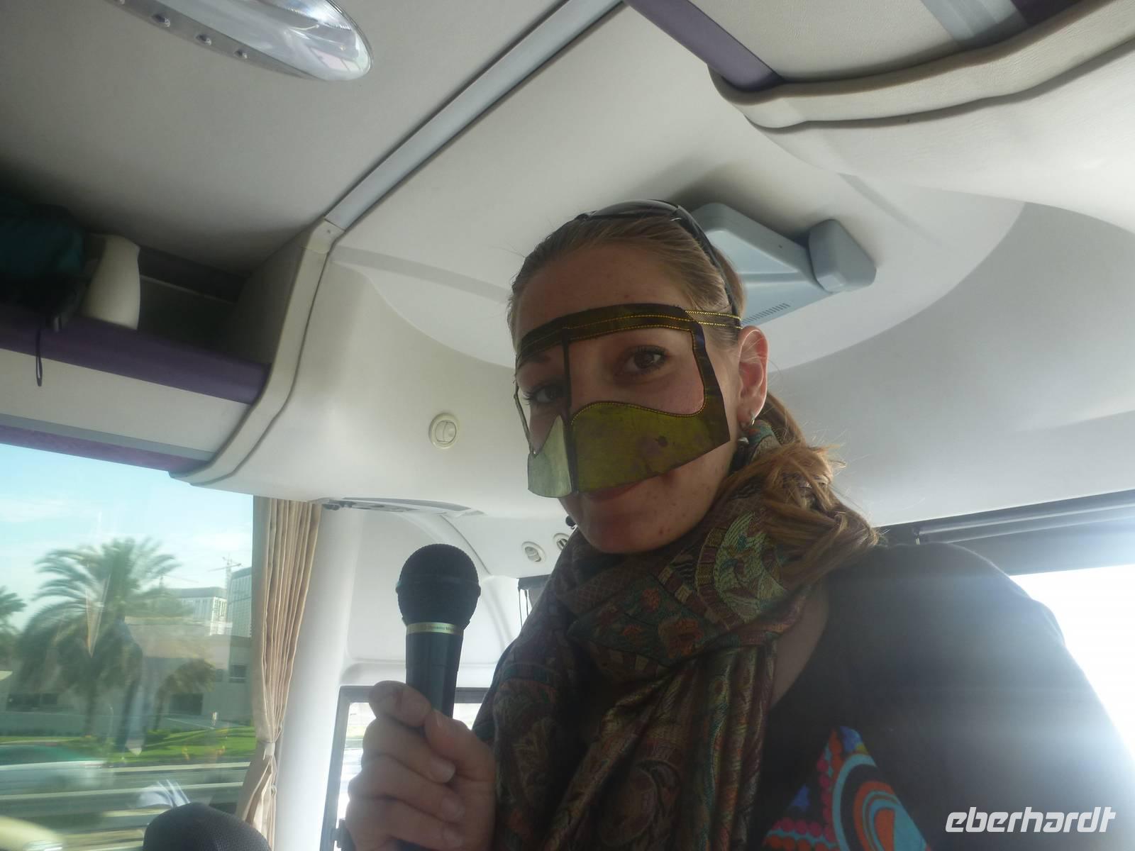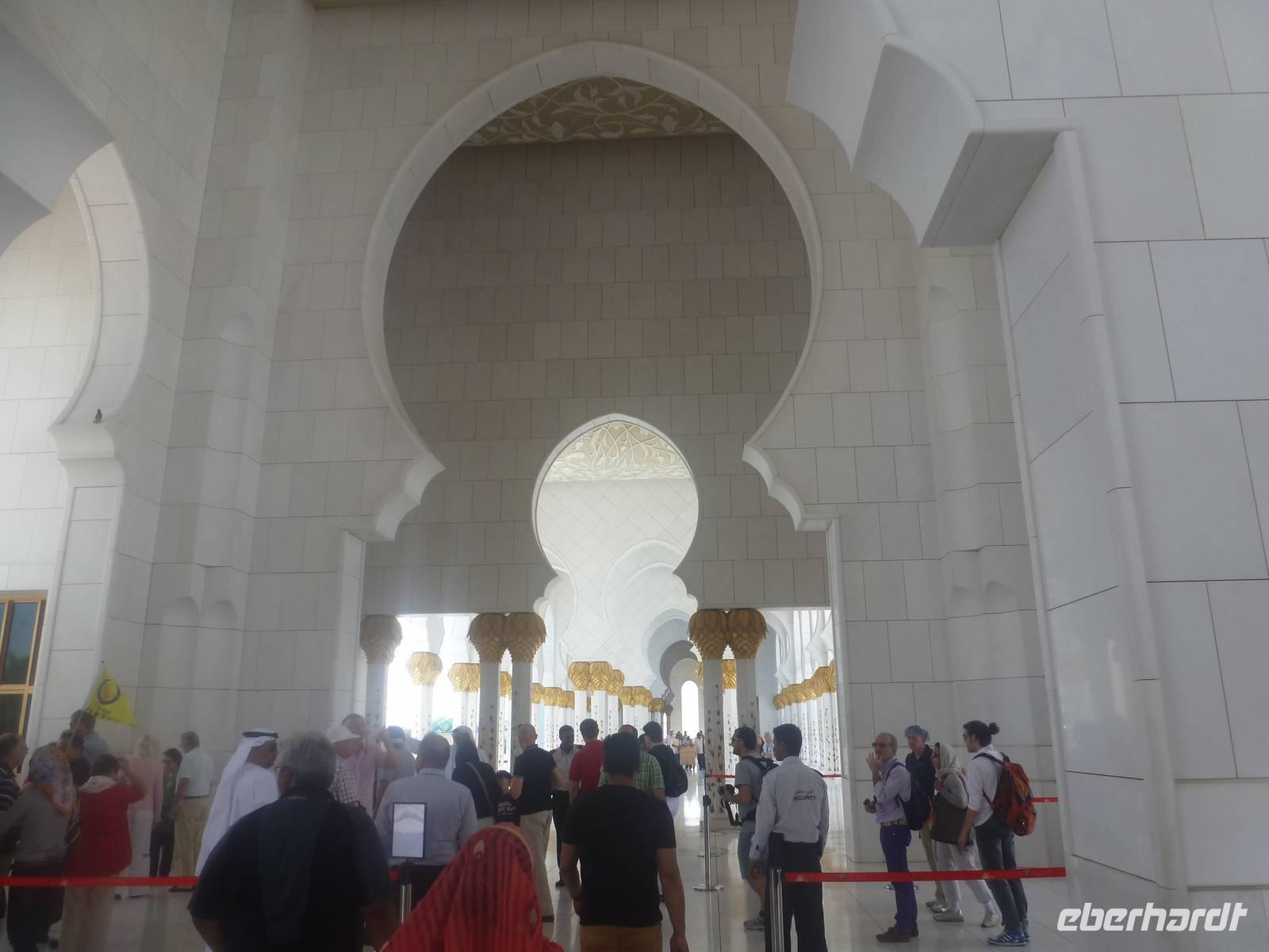 Heute reisen wir nach Abu Dhabi-Stadt, Hauptstadt und Regierungssitz der Vereinigten Arabischen Emirate. Anja und Vicky empfangen Ihre Gäste heute im traditionnellen Gewand der islamischen Welt der Emirate: der "Abaya". Natürlich sind wir so auch ein beliebtes Fotomotiv neben dem luxuriösen Dubai und seinen Sehenswürdigkeiten Es ist gar nicht so leicht in diesem Gewand Wasser im Bus zu verteilen und zu schauen, dass das Kopftuch auch immer an seiner richtigen Stelle sitzt. Aber man gewöhnt sich an alles Auch die Frauen unter uns haben mit diesem Problem zu kämpfen. Aber schick sehen wir alle aus. Abu Dhabi bedeckt eine flache Sandinsel, die mit dem Festland durch zwei Brücken verbunden ist. Uns fällt auf, dass hier vor allem üppige Grünflächen das Stadtbild prägen. Es dauert nicht lang und und vor unseren Augen erhebt sich unübersehbar die mächtige Sheikh-Zayed-Moschee. Wir staunen über die drei riesigen Kuppeln, 79 kleinere Kuppeln, vier hohe Minarette sowie über die zahlreichen Nebengebäude und Arkaden. Die größte Moschee der Vereinigten Arabischen Emirate bietet Platz für 1000 Gläubige. Im Inneren bedeckt ein 5600 Quadratmeter großer und 47 Tonnen schwerer Teppich den Boden. So gehen wir hinein um uns selbst von dem prächtigen Bauwerk zu überzeugen. Natürlich gehört es dazu, dass wir alle unsere Schuhe ausziehen.