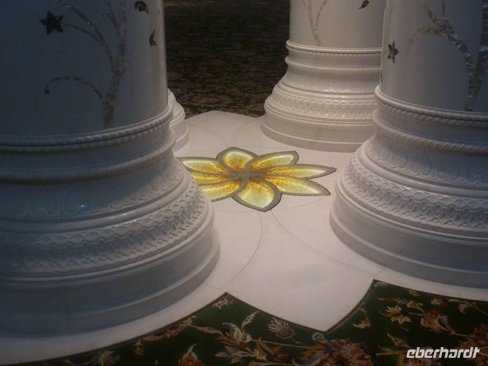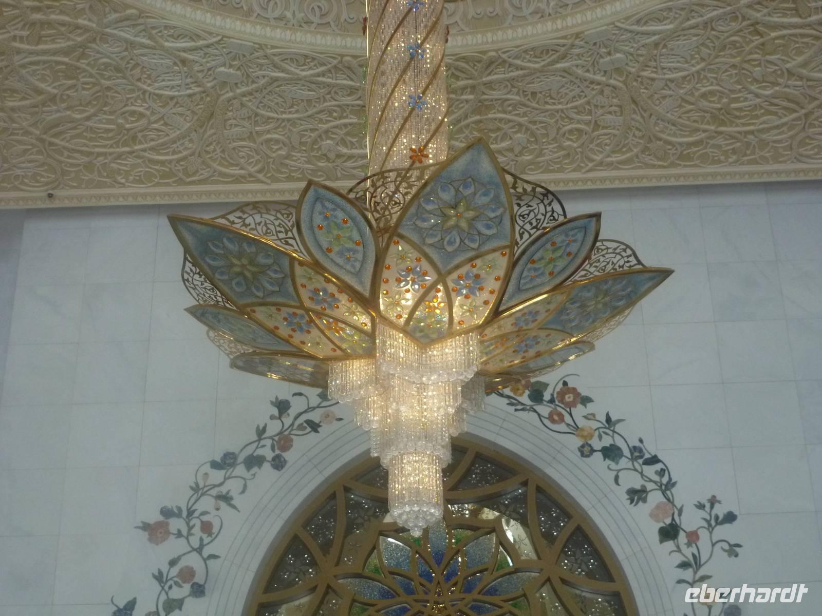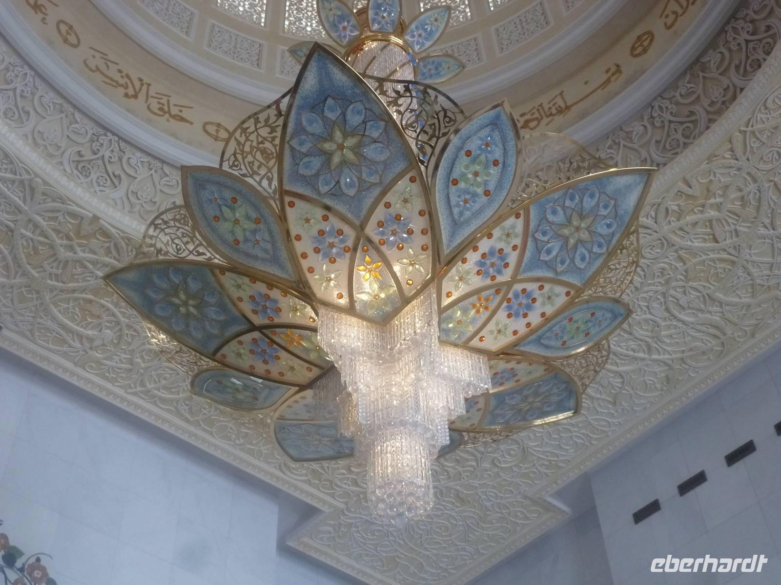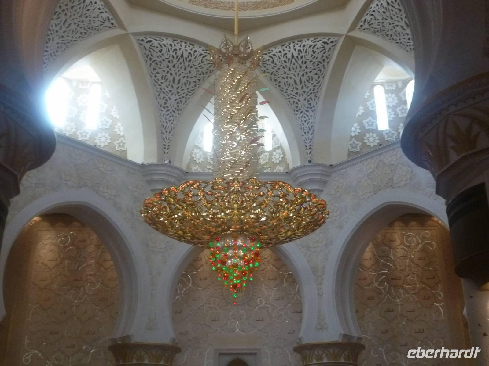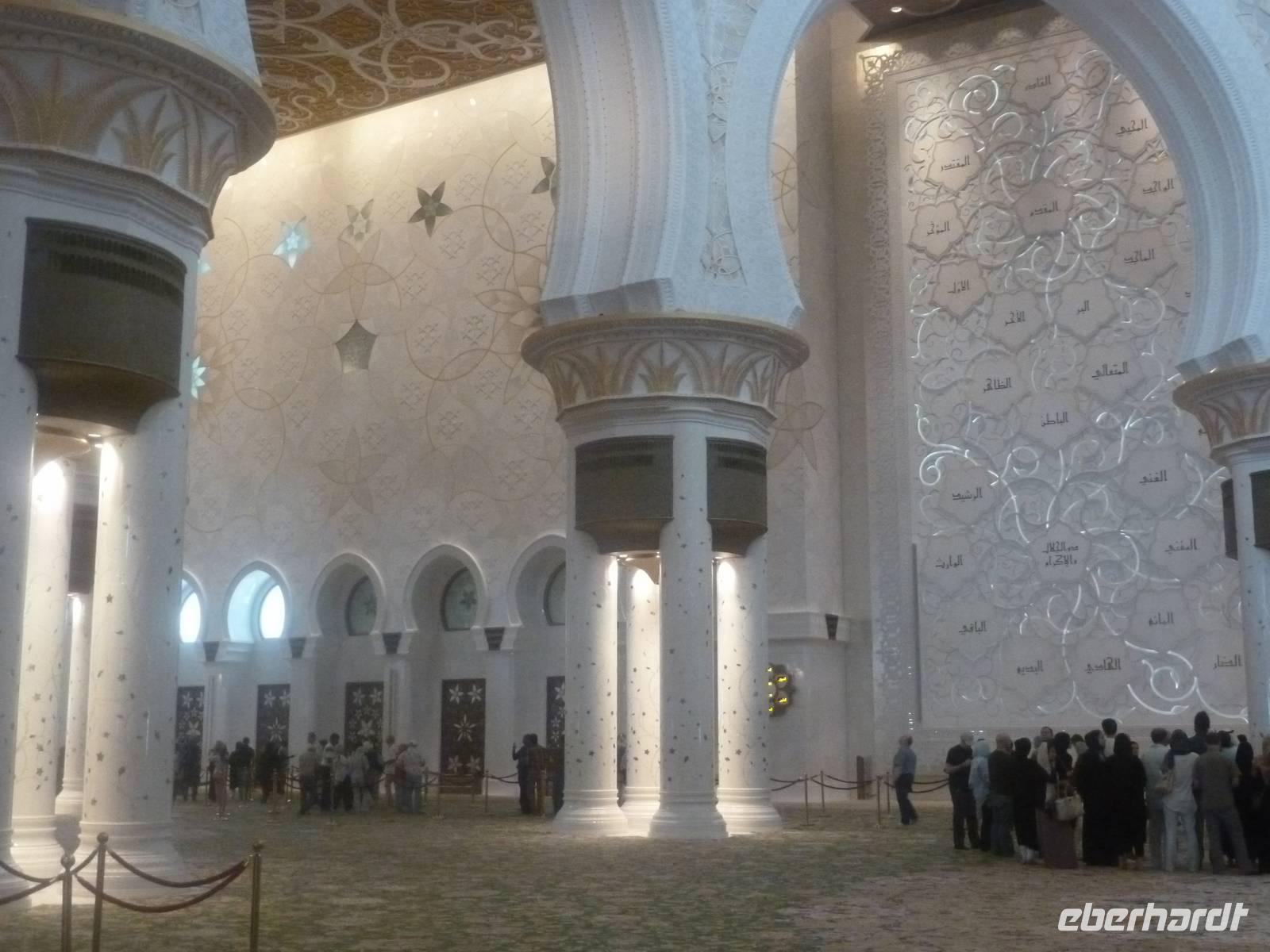 Heute reisen wir nach Abu Dhabi-Stadt, Hauptstadt und Regierungssitz der Vereinigten Arabischen Emirate. Anja und Vicky empfangen Ihre Gäste heute im traditionnellen Gewand der islamischen Welt der Emirate: der "Abaya". Natürlich sind wir so auch ein beliebtes Fotomotiv neben dem luxuriösen Dubai und seinen Sehenswürdigkeiten Es ist gar nicht so leicht in diesem Gewand Wasser im Bus zu verteilen und zu schauen, dass das Kopftuch auch immer an seiner richtigen Stelle sitzt. Aber man gewöhnt sich an alles Auch die Frauen unter uns haben mit diesem Problem zu kämpfen. Aber schick sehen wir alle aus. Abu Dhabi bedeckt eine flache Sandinsel, die mit dem Festland durch zwei Brücken verbunden ist. Uns fällt auf, dass hier vor allem üppige Grünflächen das Stadtbild prägen. Es dauert nicht lang und und vor unseren Augen erhebt sich unübersehbar die mächtige Sheikh-Zayed-Moschee. Wir staunen über die drei riesigen Kuppeln, 79 kleinere Kuppeln, vier hohe Minarette sowie über die zahlreichen Nebengebäude und Arkaden. Die größte Moschee der Vereinigten Arabischen Emirate bietet Platz für 1000 Gläubige. Im Inneren bedeckt ein 5600 Quadratmeter großer und 47 Tonnen schwerer Teppich den Boden. So gehen wir hinein um uns selbst von dem prächtigen Bauwerk zu überzeugen. Natürlich gehört es dazu, dass wir alle unsere Schuhe ausziehen.