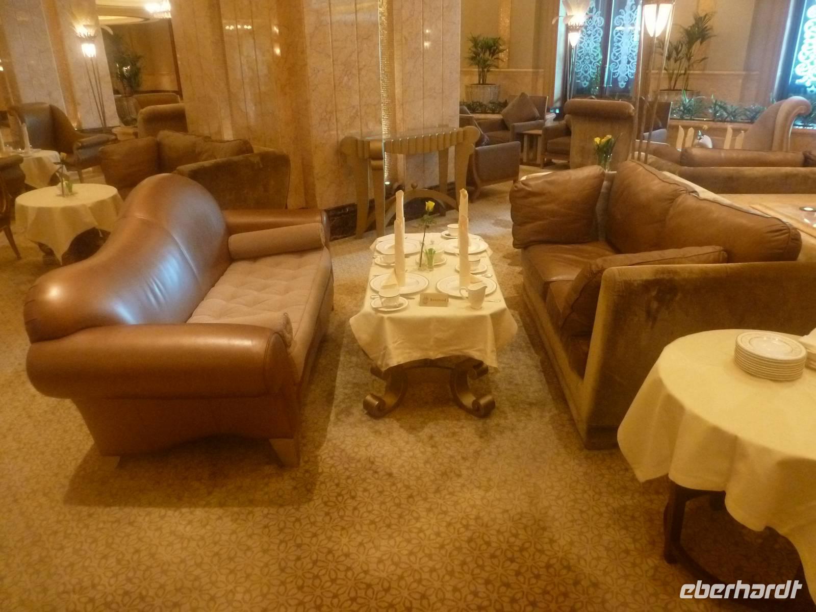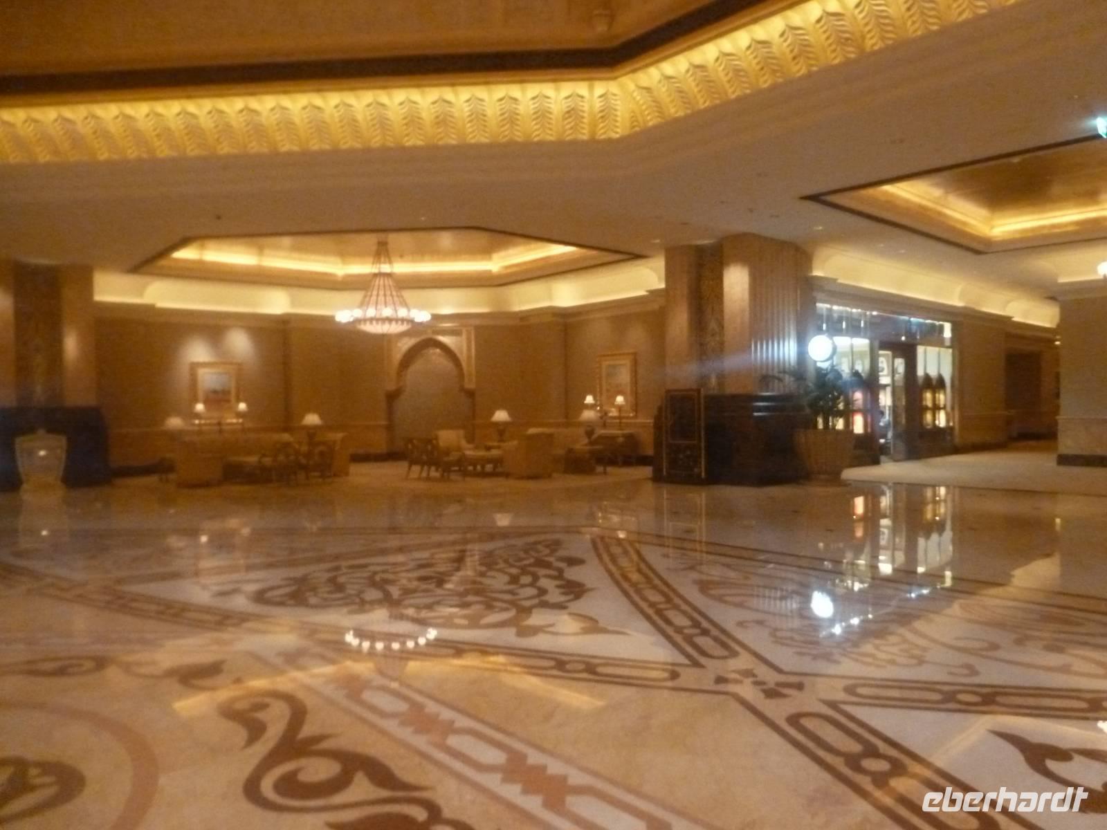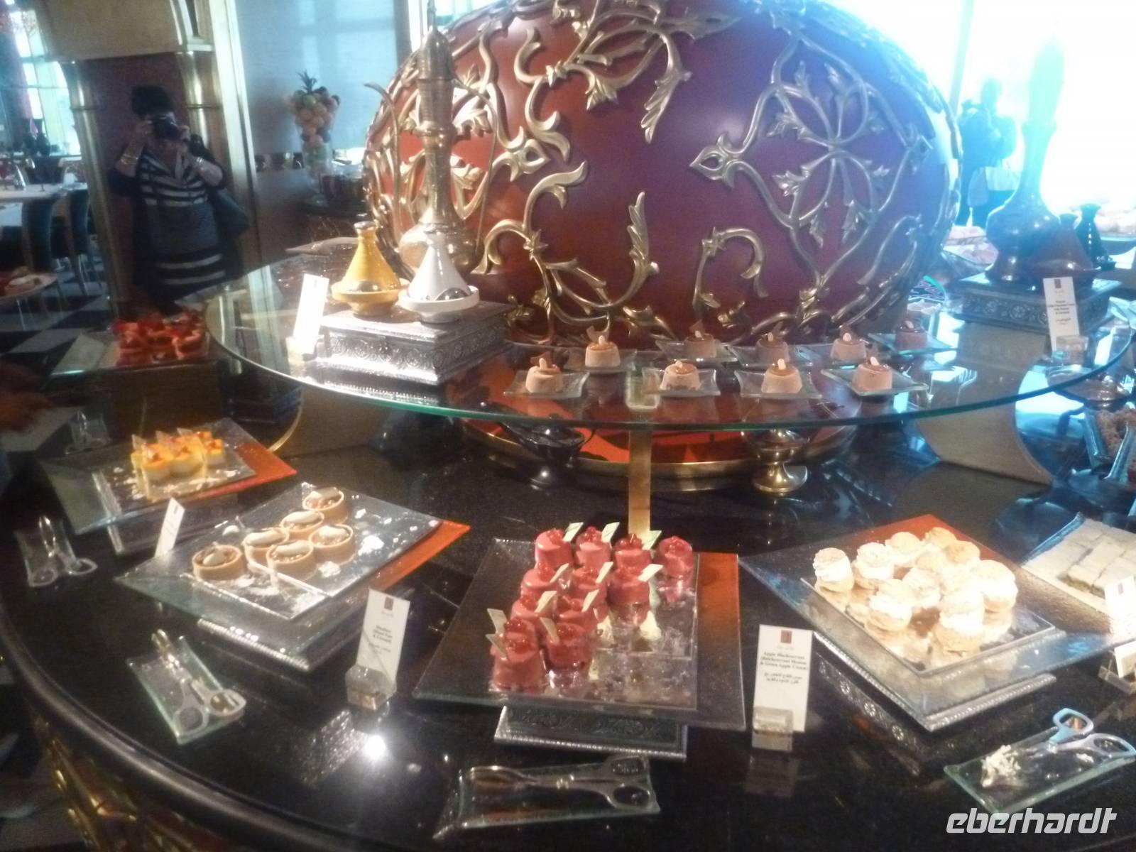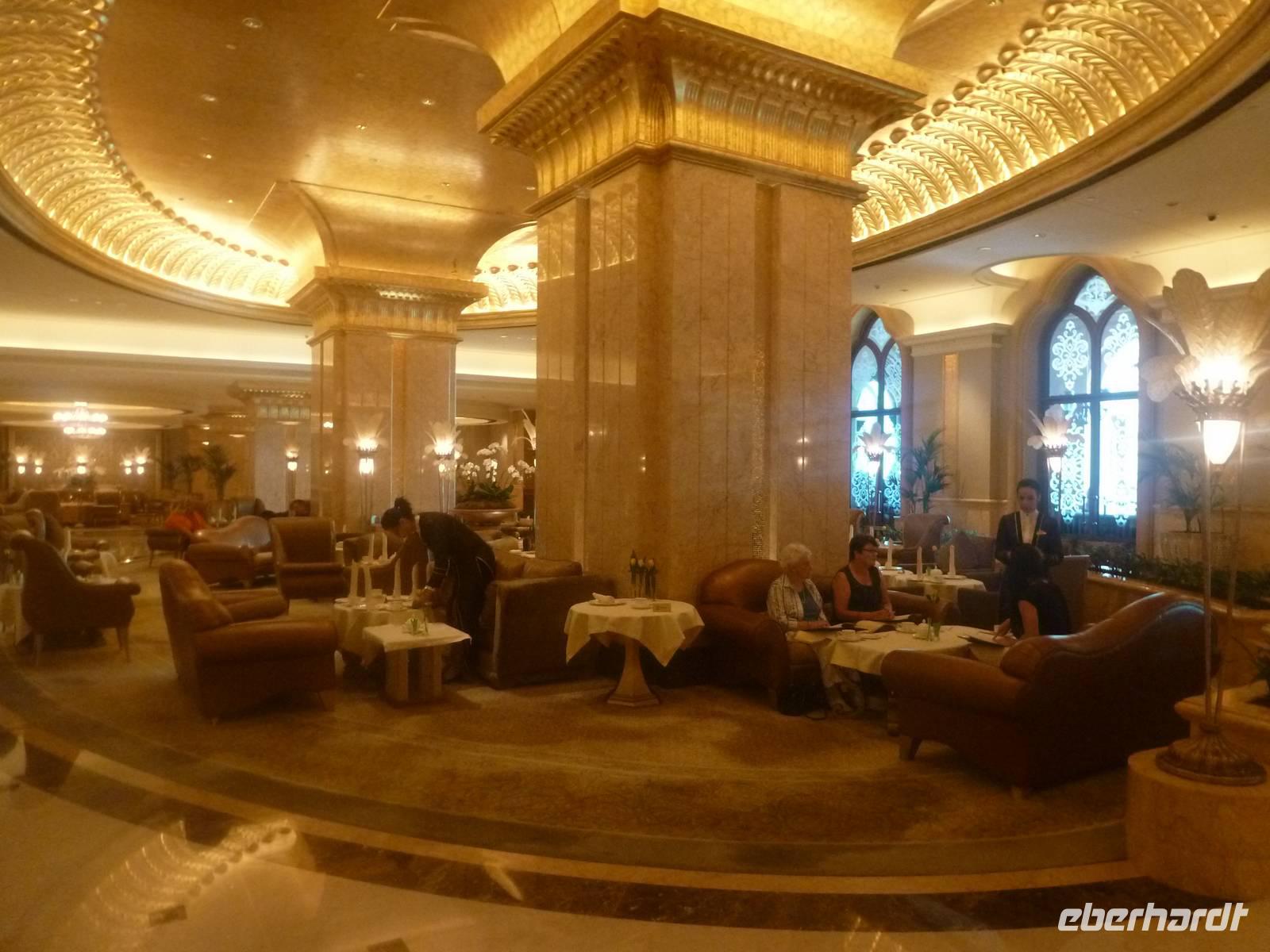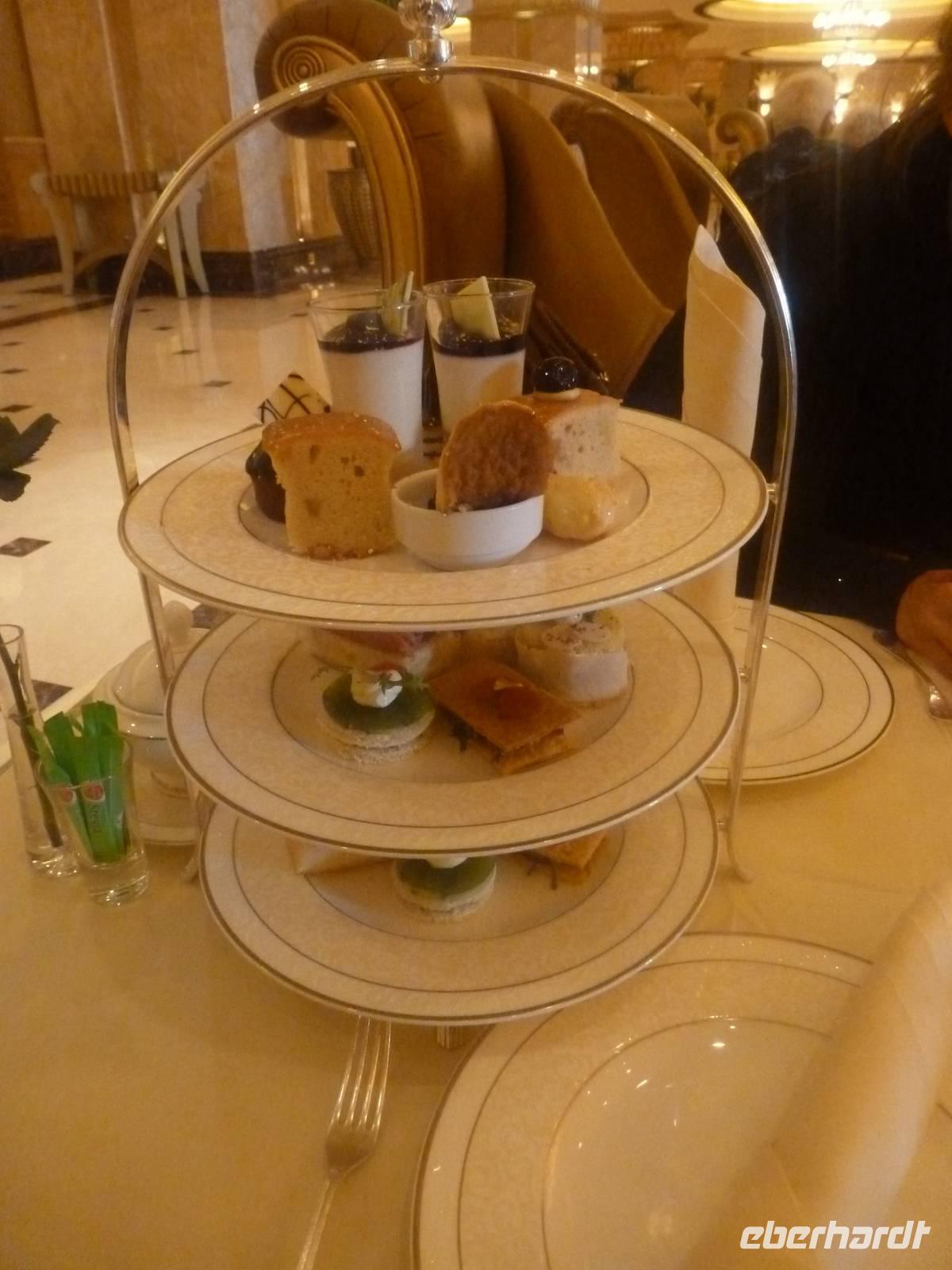 Danach konnten wir es kaum erwarten zum märchenhaften Luxushotel Emirates Palace zu kommen. Schon von Weitem staunen wir über das mächtige Anwesen und fühlen uns auf einmal ganz klein. Ein Eingangstor wie eine altarabische Zugbrücke, Springbrunnen und Freitreppen wie in einem französischen Schloss. Der Hotelpalast wird gekrönt von 114 Kuppeln und blattvergoldeten Fluren. Es wirkt wie eine Mischung aus Hagia Sophia und Tadsch Mahal, gleichermaßen großartig wie entrückt. Elegant und stilvoll. Bevor wir zu unserer Tesstunde mit allerlei Köstlichkeiten eingeladen sind, schauen wir uns noch ein wenig um. Schon etwas hungrig machten wir uns anschließend auf zu unserer Teestunde. Hier bekamen wir viel mehr serviert, als wir essen konnten. Leckere Törtchen mit ausgelesenen Früchten, hausgemachte Butter und Marmelade sowie köstliche Häppchen mit Lachs und anderen Spezialitäten. Dazu wurde uns ständig frisch gebrühter Kaffee oder Tee gereicht. Ein bisschen fühlten wir uns schon wie kleine Stars. So genossen wir unseren "High Tee" und hofften, dass die Zeit nicht all zu schnell vergeht.
