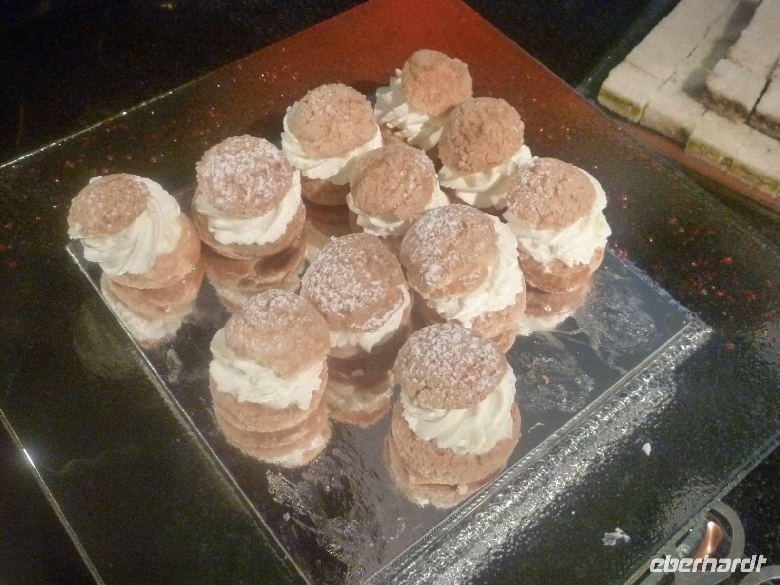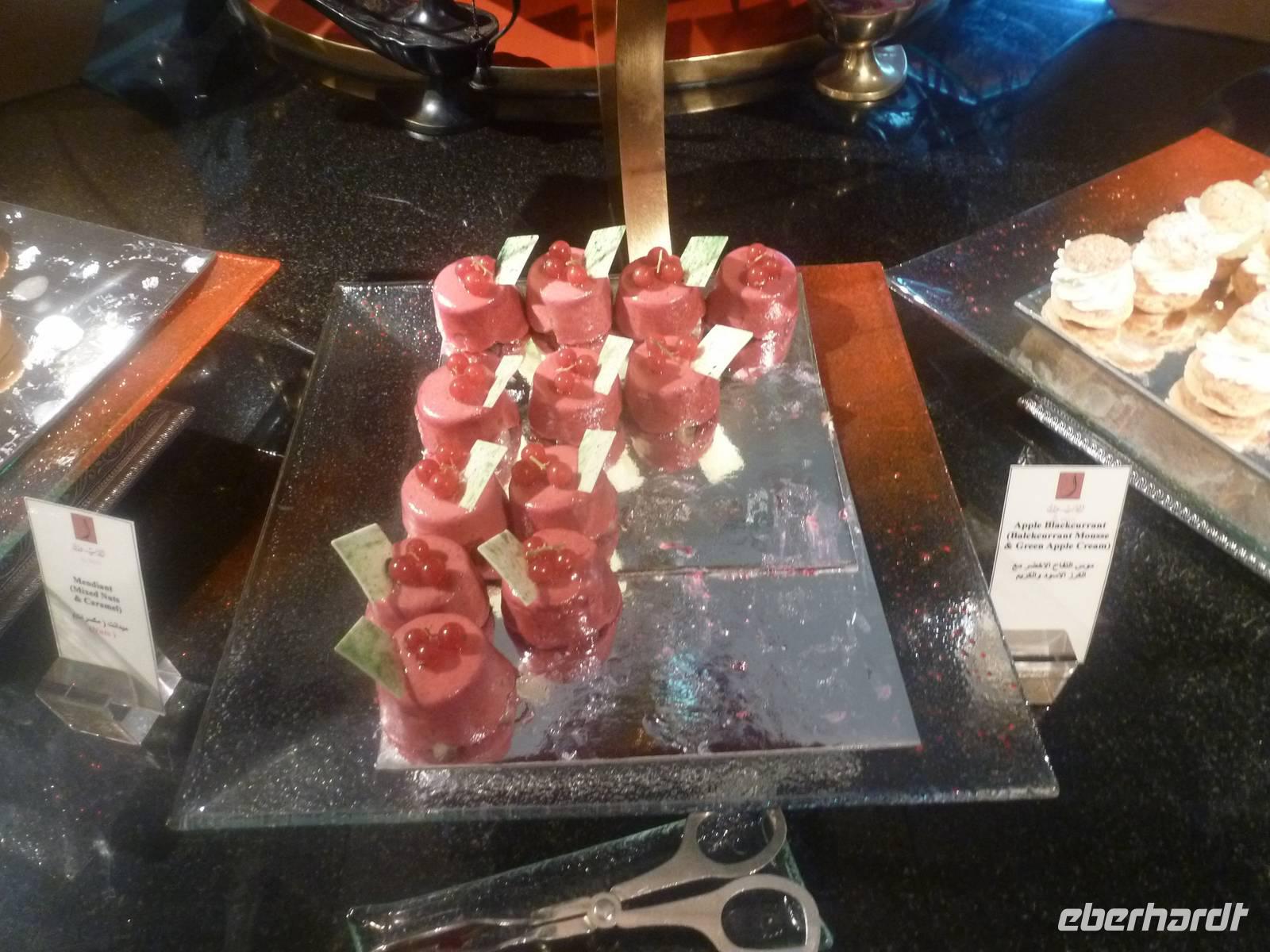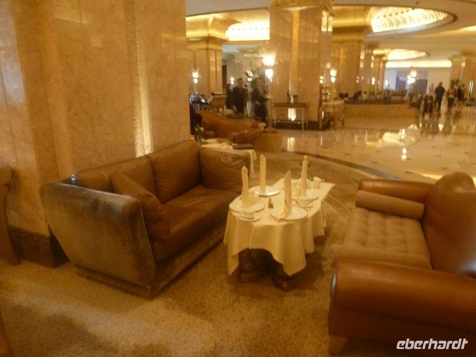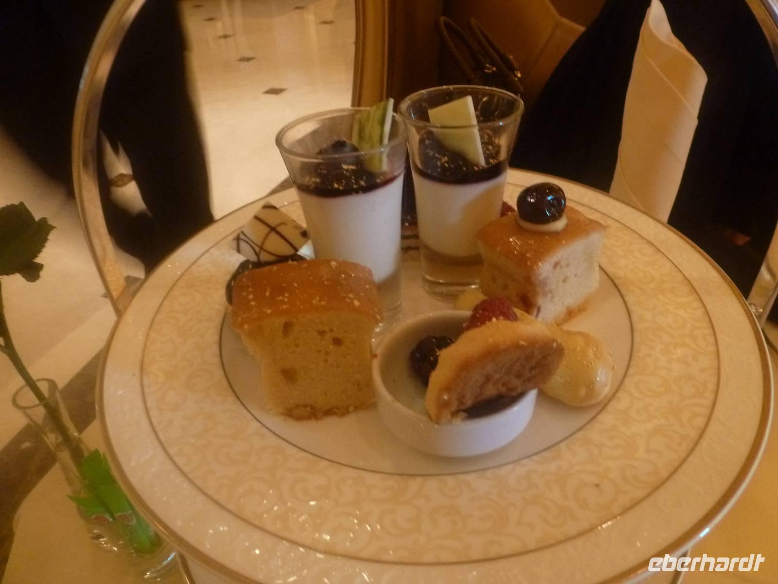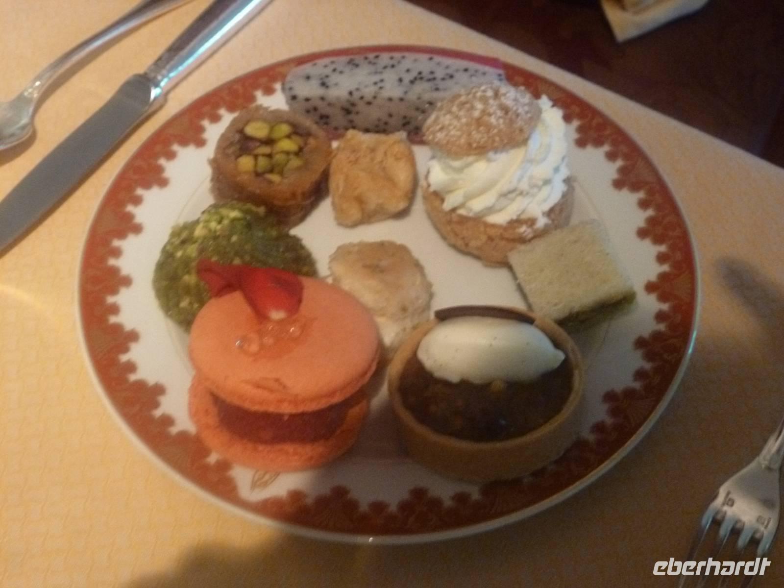 Danach konnten wir es kaum erwarten zum märchenhaften Luxushotel Emirates Palace zu kommen. Schon von Weitem staunen wir über das mächtige Anwesen und fühlen uns auf einmal ganz klein. Ein Eingangstor wie eine altarabische Zugbrücke, Springbrunnen und Freitreppen wie in einem französischen Schloss. Der Hotelpalast wird gekrönt von 114 Kuppeln und blattvergoldeten Fluren. Es wirkt wie eine Mischung aus Hagia Sophia und Tadsch Mahal, gleichermaßen großartig wie entrückt. Elegant und stilvoll. Bevor wir zu unserer Tesstunde mit allerlei Köstlichkeiten eingeladen sind, schauen wir uns noch ein wenig um. Schon etwas hungrig machten wir uns anschließend auf zu unserer Teestunde. Hier bekamen wir viel mehr serviert, als wir essen konnten. Leckere Törtchen mit ausgelesenen Früchten, hausgemachte Butter und Marmelade sowie köstliche Häppchen mit Lachs und anderen Spezialitäten. Dazu wurde uns ständig frisch gebrühter Kaffee oder Tee gereicht. Ein bisschen fühlten wir uns schon wie kleine Stars. So genossen wir unseren "High Tee" und hofften, dass die Zeit nicht all zu schnell vergeht.