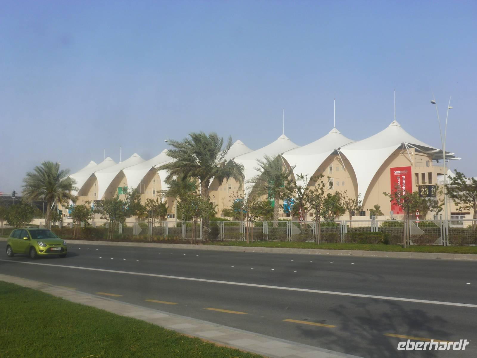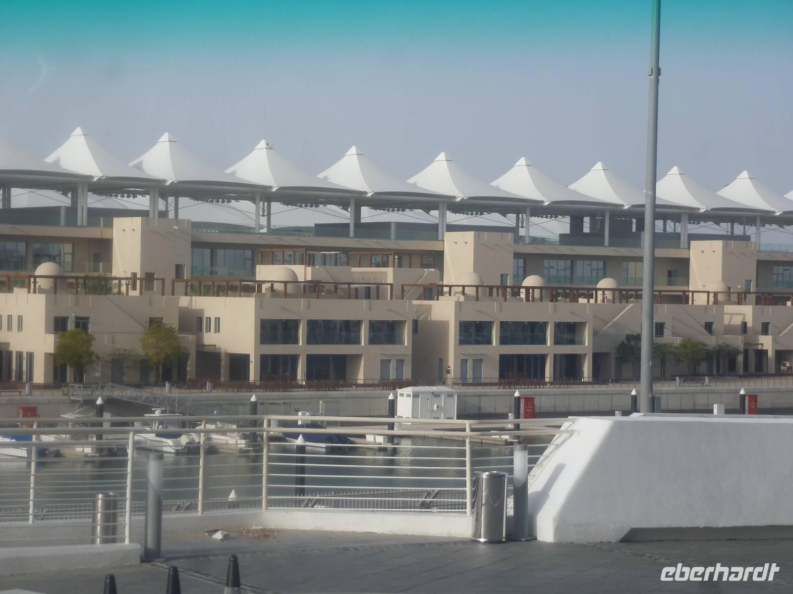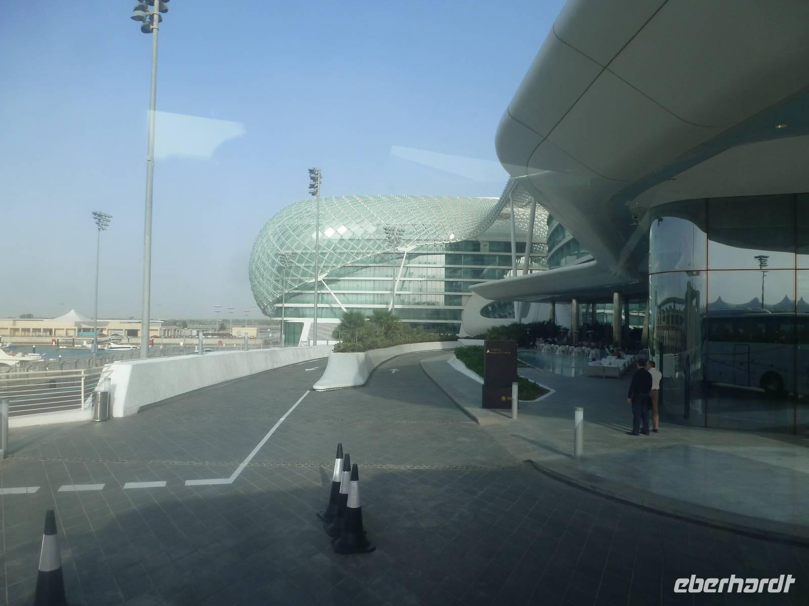Auf einen Höhepunkt folgte heute gleich der Nächste. Auf unserer Strecke nach Yas Island besuchen wir einen typischen Dattelmarkt und dürfen natürlich auch probieren. Danach reisen wir weiter nach Yas Island. Ein 40 Milliarden teures Projekt entsteht hier auf der 25 Quadratkilometer großen Insel Yas mit einer Küstenlänge von 32 Kilometern bei Abu Dhabi Stadt. Hier sehen wir Abu Dhabis berühmte und spektakuläre Formel-1-Rennstrecke, die unter einer Brücke zwischen zwei Flügeln des Viceroy-Hotels verläuft. Daneben sehen wir zahlreiche Hotels, den Jachthafen, den Ferrari-Themenpark, den Warner Bros.-Themenpark sowie einen Wasserpark. Wieder fragen wir uns, wer diese Freizeitmöglichkeiten nutzen soll, denn auf Yas Island sahen wir so gut wie keine Menschenseele.