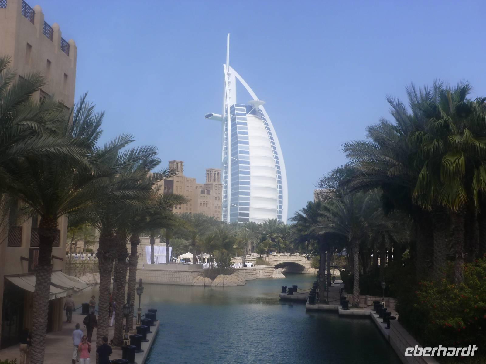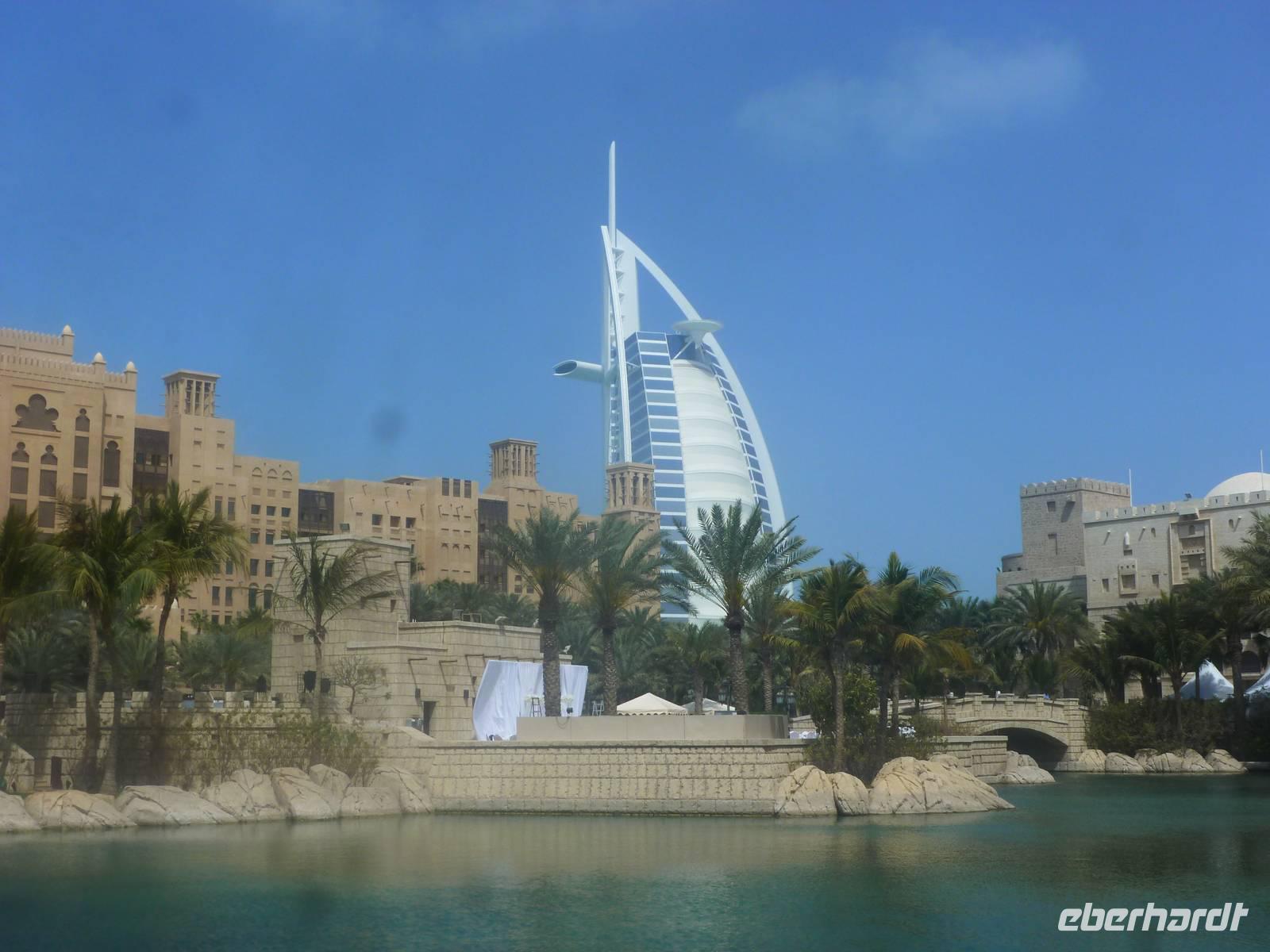 Geschniegelt und gestriegelt, wie frisch aus dem Ei gepellt, machen wir uns auf zum Symbol des modern-futuristischen Dubai. 321 Meter ragt der Arabische Turm in den Himmel - die spektakulärste und bereits kurz nach der Eröffnung im Jahr 2000 wohl berühmteste Luxushotel der Welt. Das neue Wahrzeichen Dubais ließ sich das kleine Scheichtum sagenhafte 1,5 Milliarden Euro kosten. An Superlativen herrscht kein Mangel: Das höchste Hotel der Welt, ein Denkmal des Luxus, der Garten Allahs auf Erden. Auf einer eigens geschaffenen künstlichen Insel 300 Meter vor dem Jumeirah-Strand von Dubai erbaut, reckt sich das Burj al Arab in die Höhe wie das geblähte Segel einer altarabischen Dhau. Bevor wir heute in diesem Hotel zum Mittagessen eingeladen sind, besuchen wir den wunderschönen Madinat Souk. Für uns gehörte der Souk zu den schönsten, die wir gesehen haben. Der exquisite Souk besticht vor allem durch seinen arabischen Stil , beste Restaurants, niedliche Cafés und Bars. Von hier aus hat man außerdem einen wunderschönen Blick auf das Burj al Arab. Man kommt sich ein bisschen vor wie in Venedig. Auch ein Gruppenbild darf hier natürlich nicht fehlen.