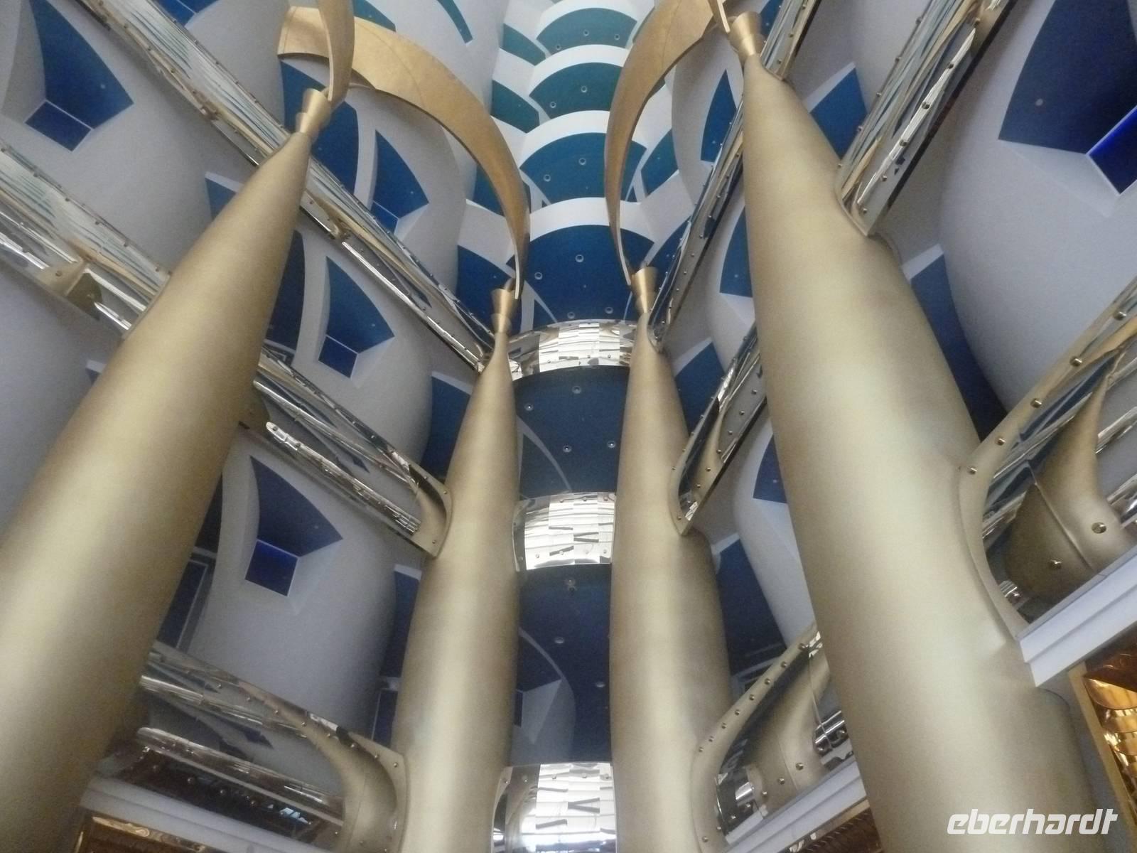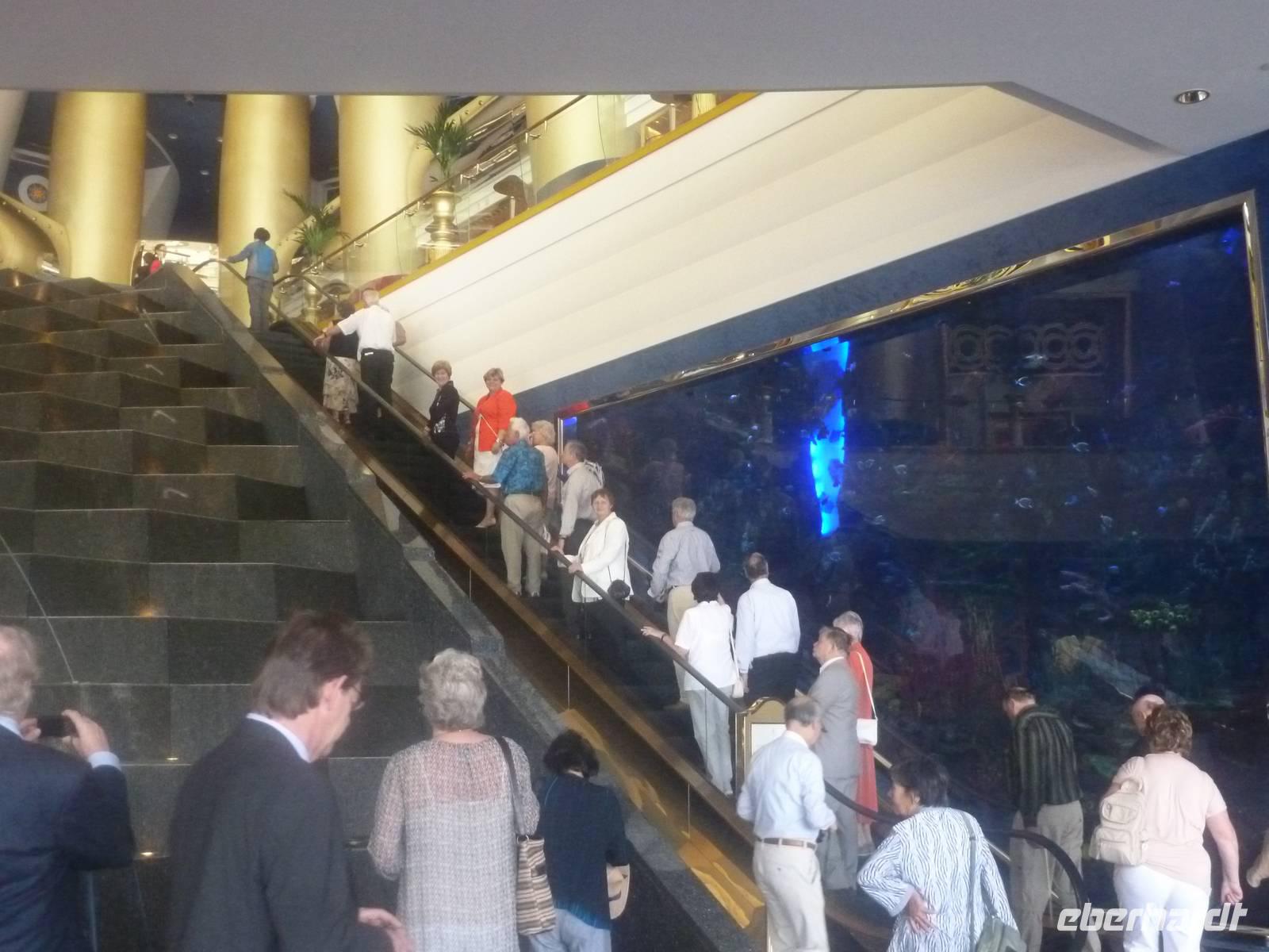 Nach unserer freien Zeit im Souk fahren wir gemeinsam zum Burj al Arab. Im Inneren trauen wir unseren Augen kaum. Die Lobby ist ein Dom aus Licht und Gold. Aus vollständig mit 0,001 Milimeter dünnem Blattgold überzogenen Säulen ranken sich goldenen Baldachine hervor. Die Wasserfontäne des Brunnens schießt 50 Meter in die Höhe. Wir erfahren, dass eine Nacht in der 780 Quadratmeter großen Royal Suite 8500 Euro kostet - ohne Frühstück aber zumindest mit Butler. Ein bisschen fühlen wir uns schon wie im Traum. Nachdem wir uns ein wenig umgesehen haben, öffnet sich für uns das arbaische Restaurant auf der ersten Etage des Hotels. Wir plazieren uns ganz sorgfältig und bestellen uns einige Getränke. Unserem Geldbeutel tut das nicht sonderlich gut, aber wir essen ja auch nur einmal im Burj al Arab! Kurze Zeit später probieren wir allerlei Köstlichkeiten wie Austern, Hummer, Sushi oder Garnelen. Nach diesem Festmahl schlenderten wir noch ein wenig im Hotel herum und schossen unsere letzten Fotos.