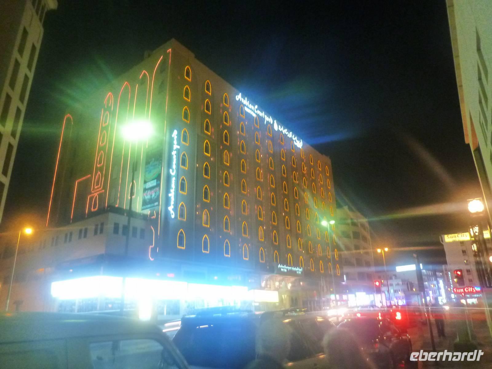 Etwas müde und geschafft gingen wir gemeinsam zu unserem Reisebus und begrüßten auch herzlich unseren Fahrer, der uns sicher allen in guter Erinnerung bleiben wird. Vom Flughafen aus fuhren wir etwa 20 Minuten zu unserem 4-Sterne-Hotel "Arabian Courtyard", direkt gegenüber des Dubai Museums im alten Stadtteil Bastakiya gelegen. Auf der Fahrt erfuhren wir bereits einige interessante Dinge über das Emirat und den Ablauf des morgigen Tages, denn viel Zeit zum schlafen blieb uns nicht. Am Hotel angekommen gaben wir unsere Reisepaesse ab und bezogen unsere Zimmer. Nach einem langen Tag fielen wir heute nur noch in unsere Betten. Aber es dauerte nicht lange, bis die Nachtruhe des Ein oder Anderen durch den Ruf des Muezins gestört wurde. Aber wir gewöhnten uns an alles