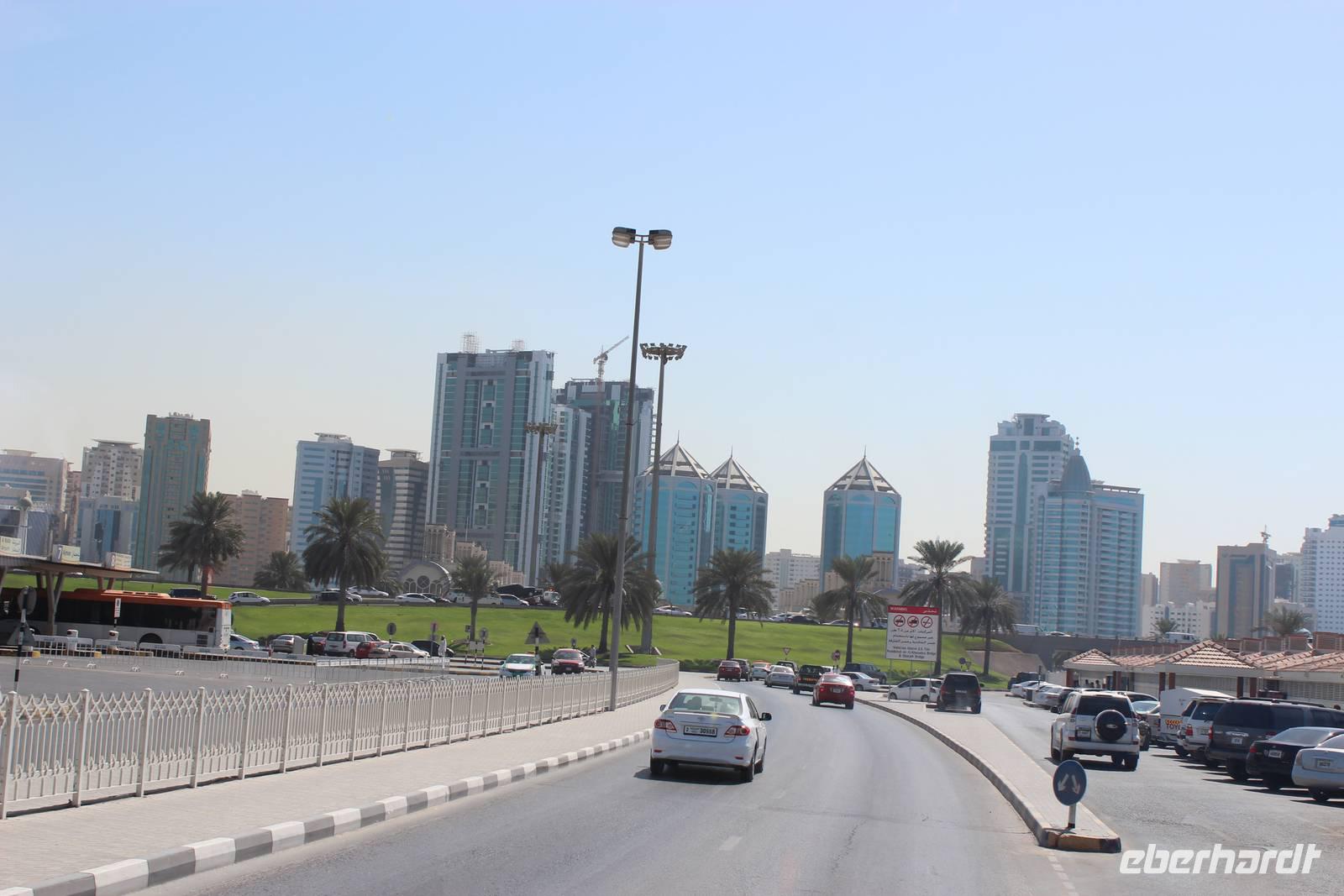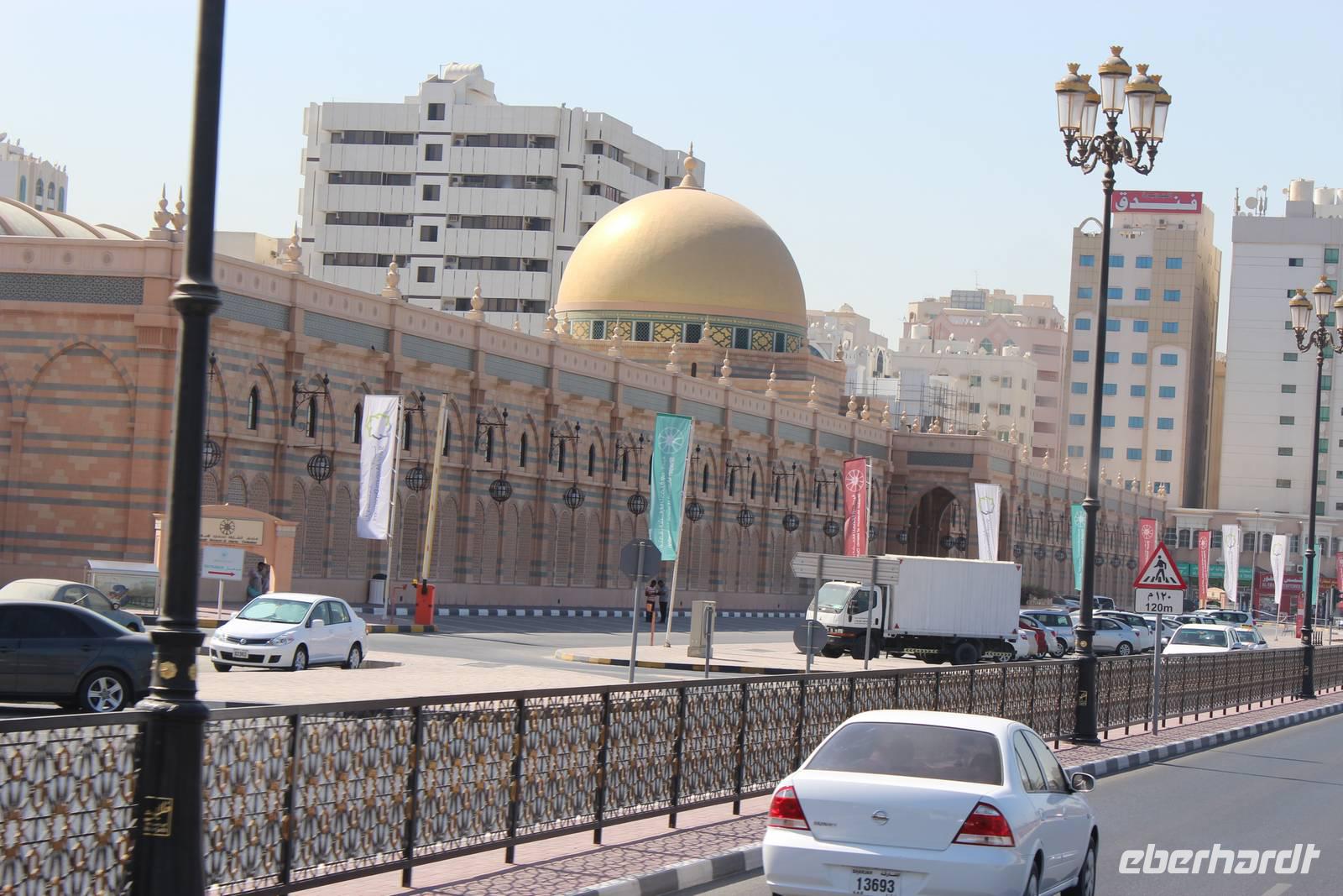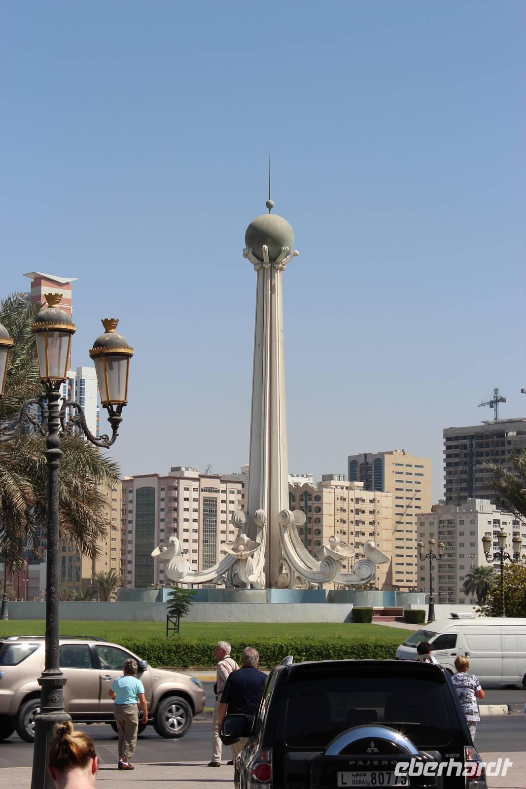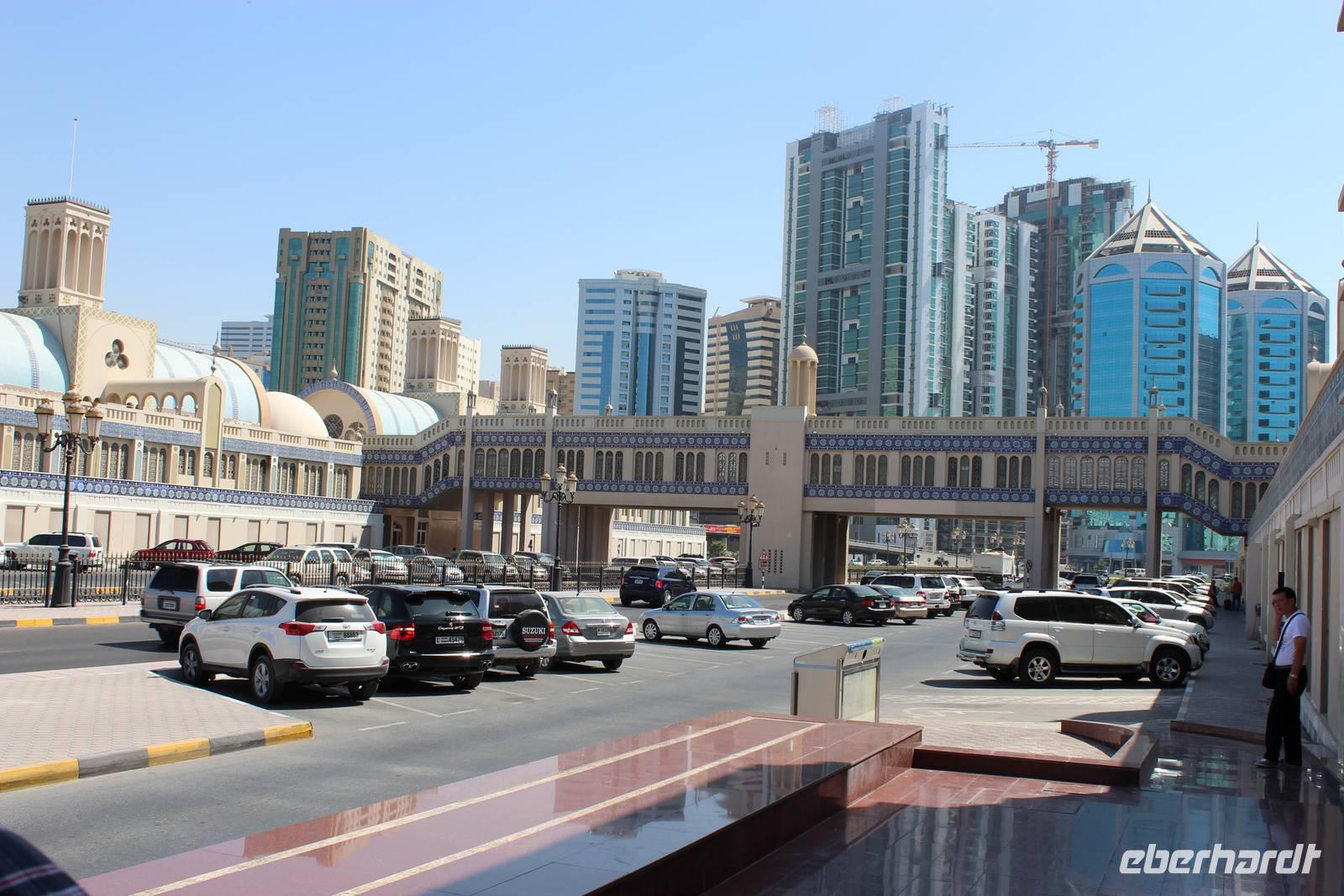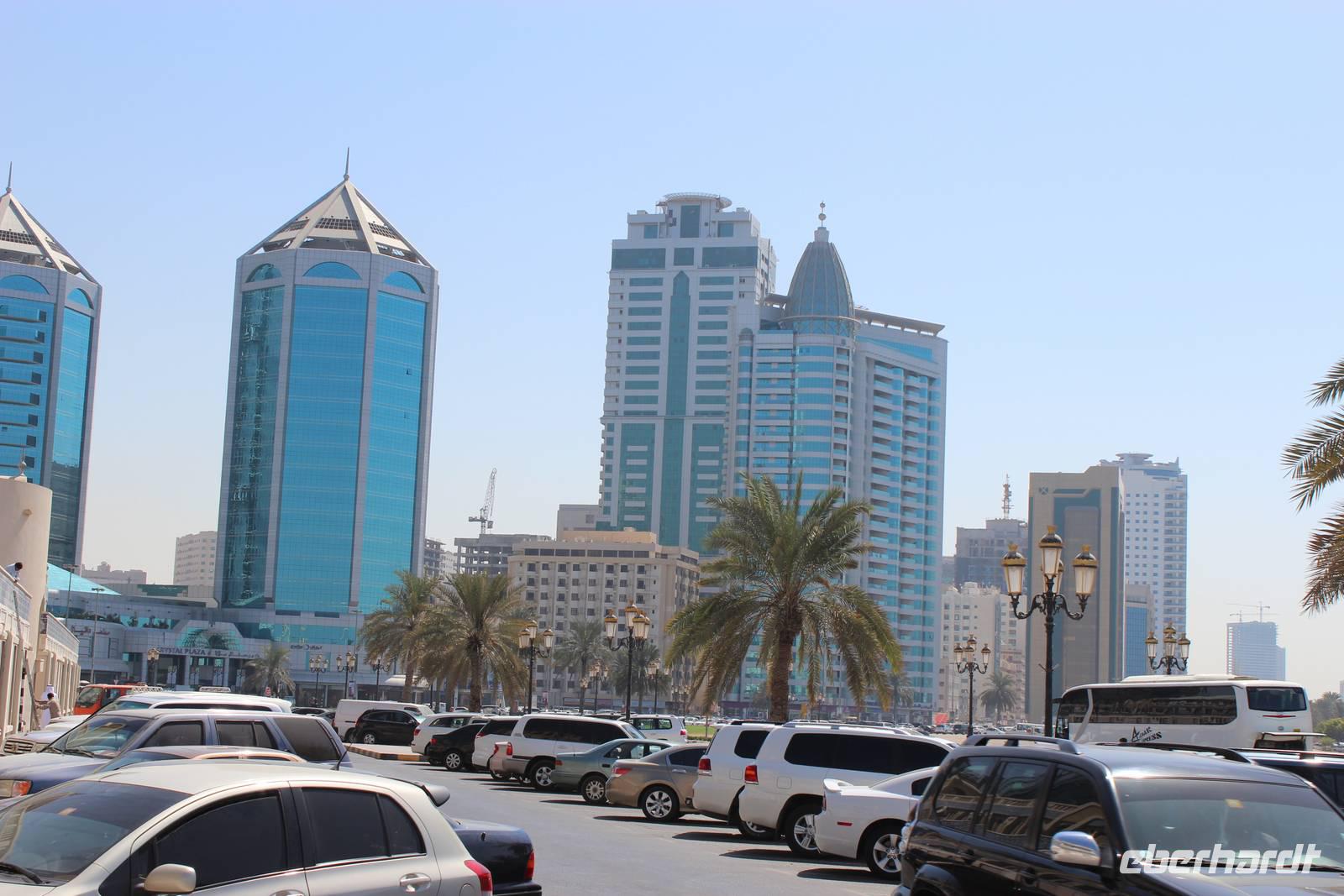 Mit dem Bus fuhren wir heute nach Sharjah. Sharjah ist eines der strengsten Emirate, erklärte uns unsere örtliche Reiseleiterin. Und das merkten wir auch, denn die Strände waren kaum besucht und wenn man jemanden sah, war diese Person nicht in Badekleidung zu sehen. Die Frauen, die man sah, waren größtenteils verhüllt. In Sharjah bestaunten wir den offenen Koran. Dieser ist auf einem Kreisverkehr zu sehen. Danach fuhren wir in das benachbarte Emirat um kurz zu schauen, wie die Strände dort besucht sind, um danach wieder nach Sharjah hinein zu fahren. Wir fuhren auf einen Souk, auf welchem einige von uns handelten. Unser Reisebegleiter half uns dabei ein wenig. Mit einigen Tüchern und Postkarten ging es zurück zum Bus. Weiter ging es zum Fischmarkt. Was war dies für eine große Auswahl an frischem Fisch. Hätten wir hier einen Fisch gekauft, dann hätten wir diesen auch gleich, wie viele andere, entschuppen und entgräten lassen können. Vom Fischmarkt liefen wir über die Straße zum Gemüse- und Obstmarkt, wo es eine ebenso große Auswahl gab. Hier holte uns unser Busfahrer ab und wir fuhren zum Blauen Souk von Sharjah. Hier sahen wir ein Denkmal mit sieben Kugeln, welches die sieben Vereinigten Arabischen Emirate darstellt und deren Vereinigung. Auf der anderen Soukseite waren sieben Arabische Flaggen zu sehen. Im Souk selbst hatten wir wieder die Möglichkeit zu handeln und etwas zu erwerben. Draußen trafen wir uns dann und hatten einen wunderschönen Blick auf die Skyline von Sharjah.