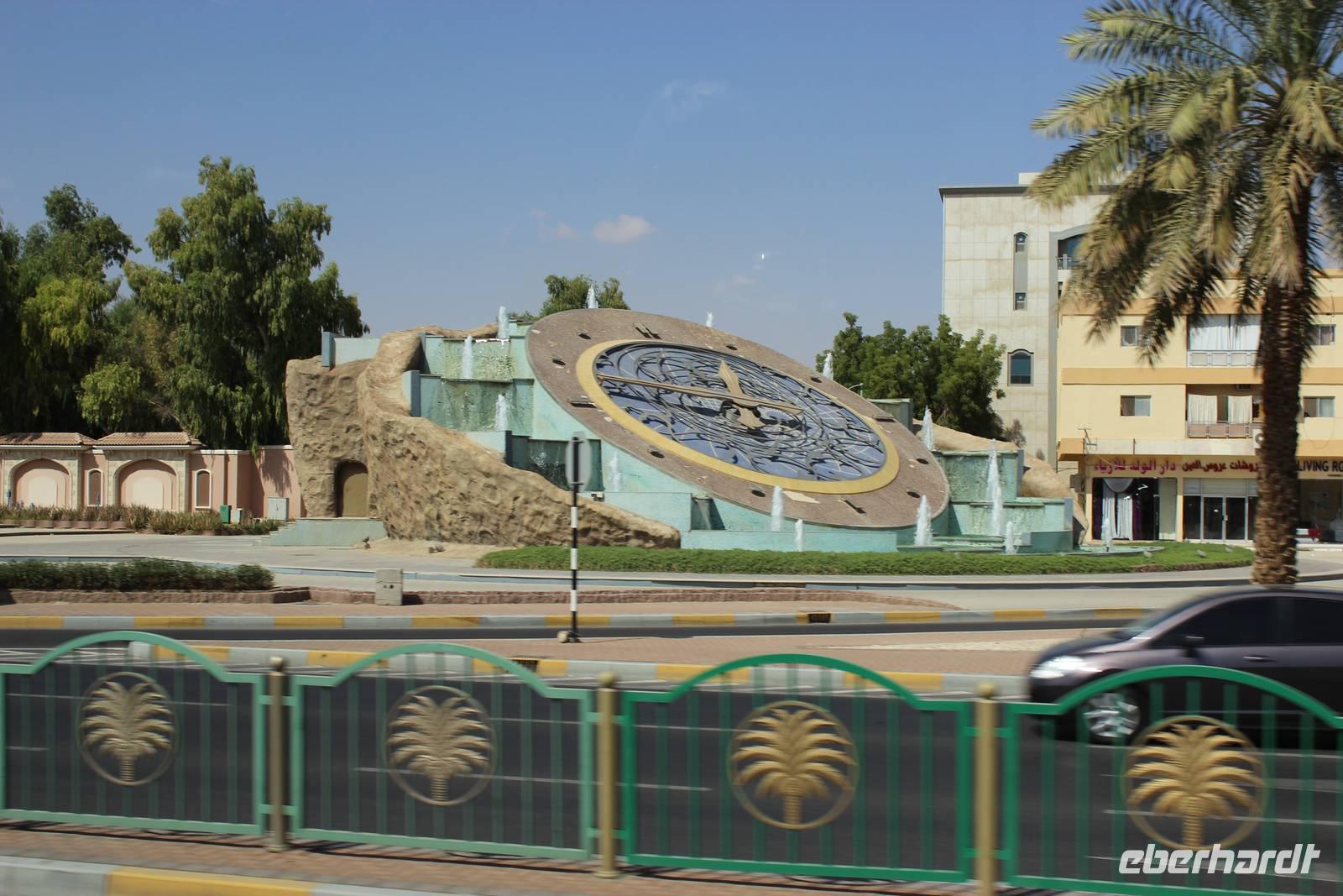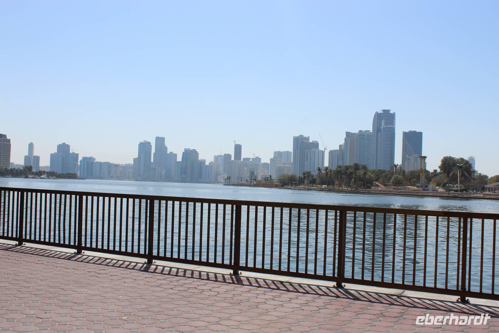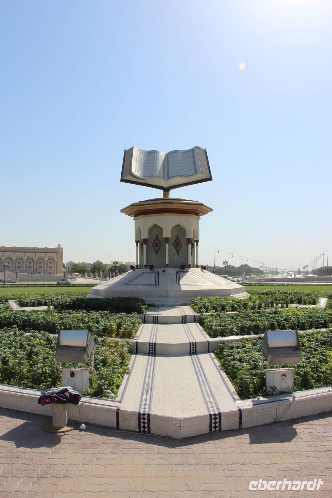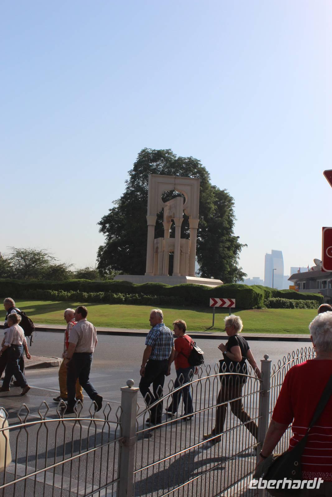 Mit dem Bus fuhren wir heute nach Sharjah. Sharjah ist eines der strengsten Emirate, erklärte uns unsere örtliche Reiseleiterin. Und das merkten wir auch, denn die Strände waren kaum besucht und wenn man jemanden sah, war diese Person nicht in Badekleidung zu sehen. Die Frauen, die man sah, waren größtenteils verhüllt. In Sharjah bestaunten wir den offenen Koran. Dieser ist auf einem Kreisverkehr zu sehen. Danach fuhren wir in das benachbarte Emirat um kurz zu schauen, wie die Strände dort besucht sind, um danach wieder nach Sharjah hinein zu fahren. Wir fuhren auf einen Souk, auf welchem einige von uns handelten. Unser Reisebegleiter half uns dabei ein wenig. Mit einigen Tüchern und Postkarten ging es zurück zum Bus. Weiter ging es zum Fischmarkt. Was war dies für eine große Auswahl an frischem Fisch. Hätten wir hier einen Fisch gekauft, dann hätten wir diesen auch gleich, wie viele andere, entschuppen und entgräten lassen können. Vom Fischmarkt liefen wir über die Straße zum Gemüse- und Obstmarkt, wo es eine ebenso große Auswahl gab. Hier holte uns unser Busfahrer ab und wir fuhren zum Blauen Souk von Sharjah. Hier sahen wir ein Denkmal mit sieben Kugeln, welches die sieben Vereinigten Arabischen Emirate darstellt und deren Vereinigung. Auf der anderen Soukseite waren sieben Arabische Flaggen zu sehen. Im Souk selbst hatten wir wieder die Möglichkeit zu handeln und etwas zu erwerben. Draußen trafen wir uns dann und hatten einen wunderschönen Blick auf die Skyline von Sharjah.