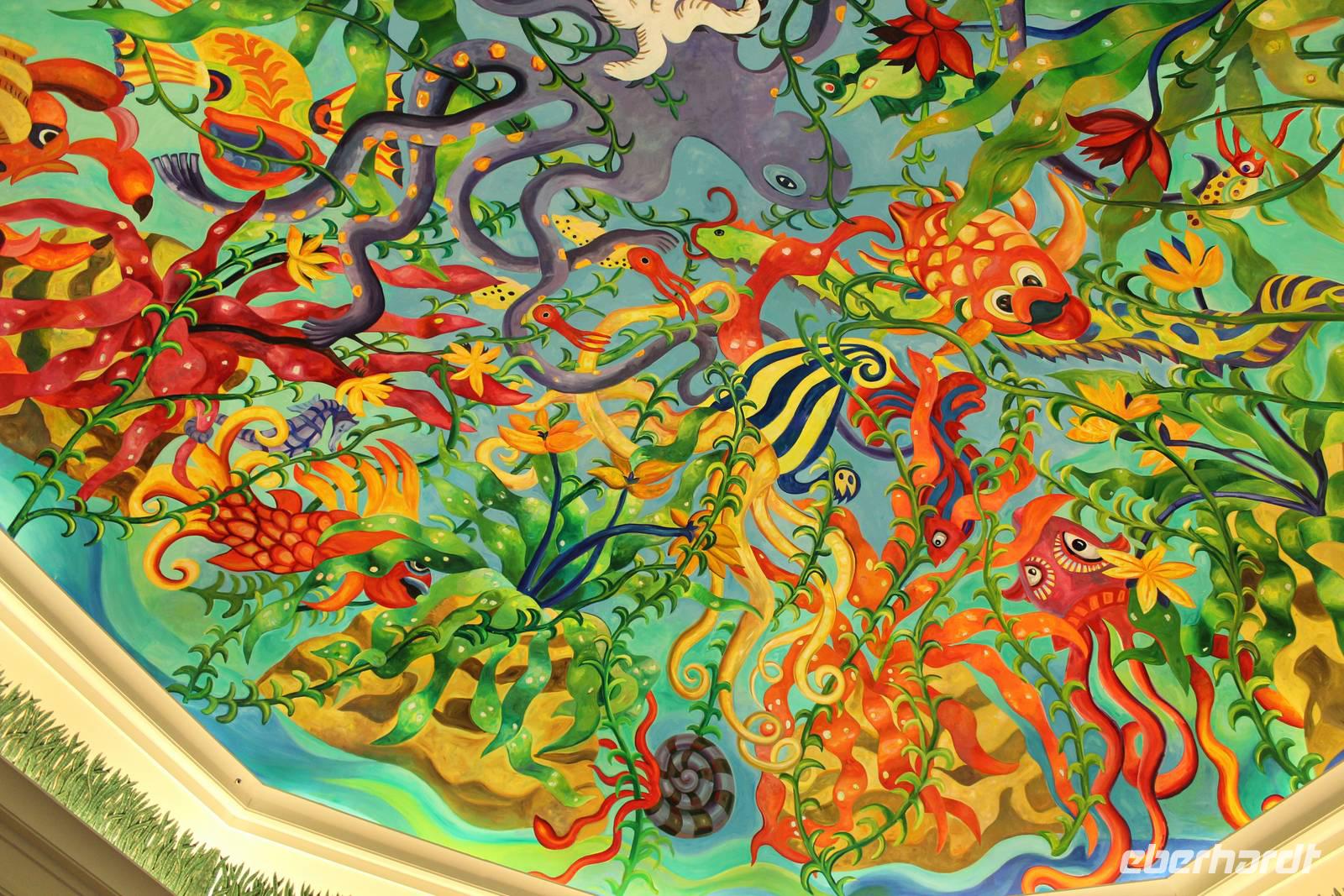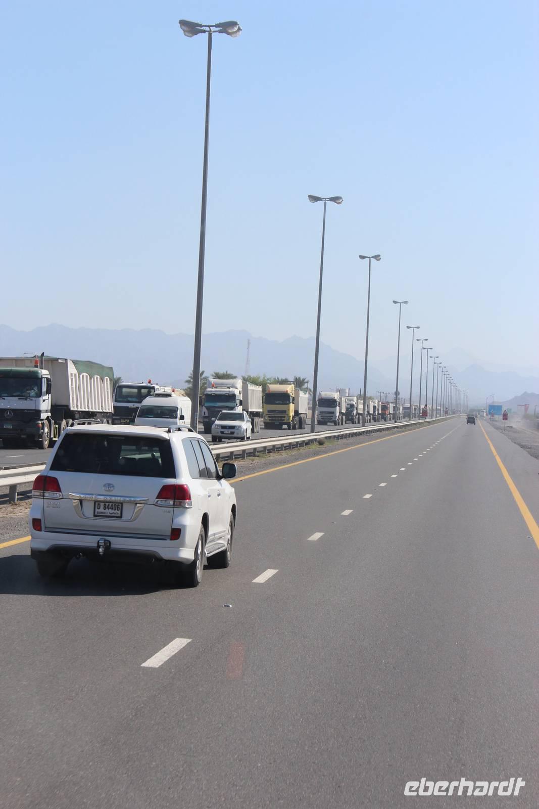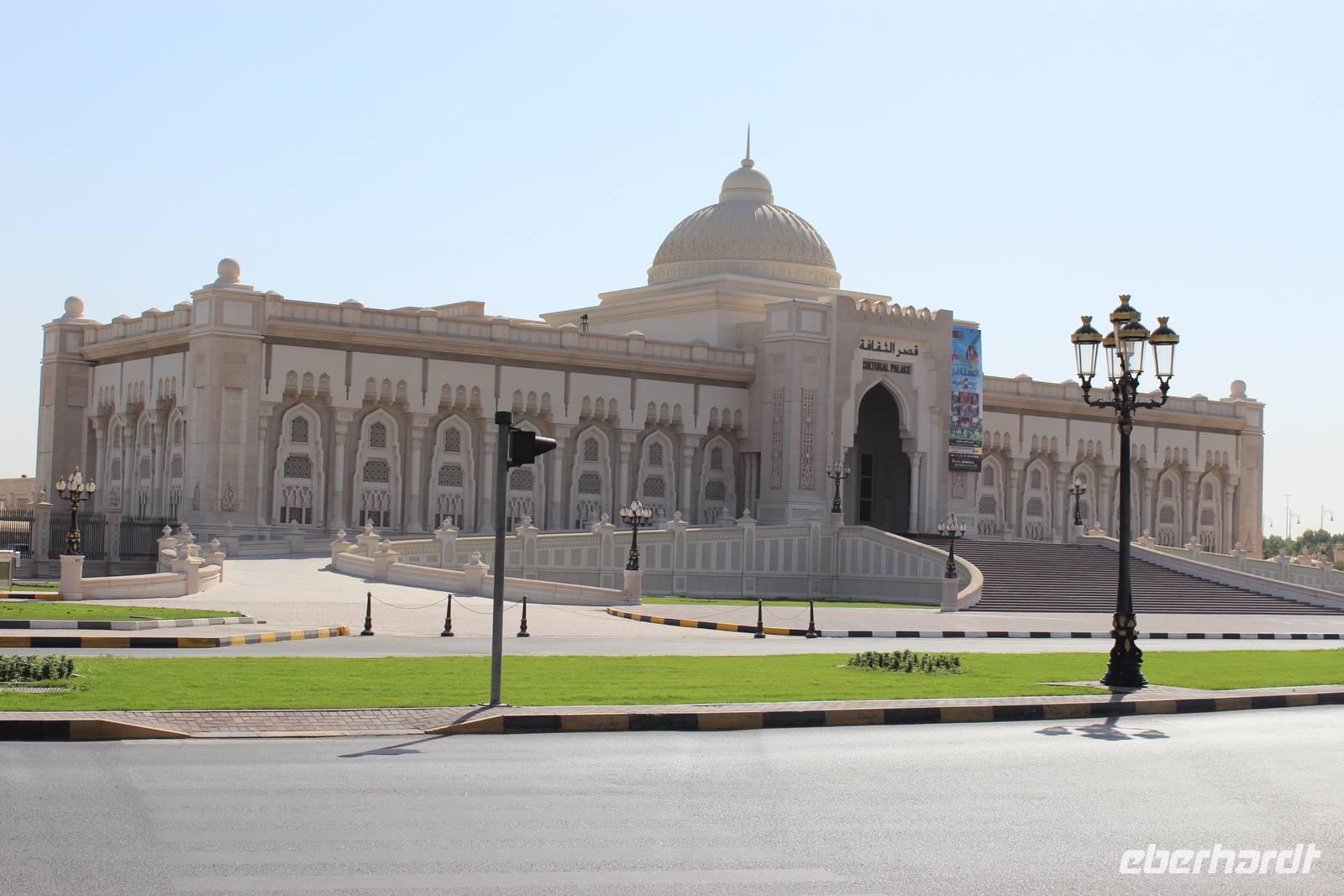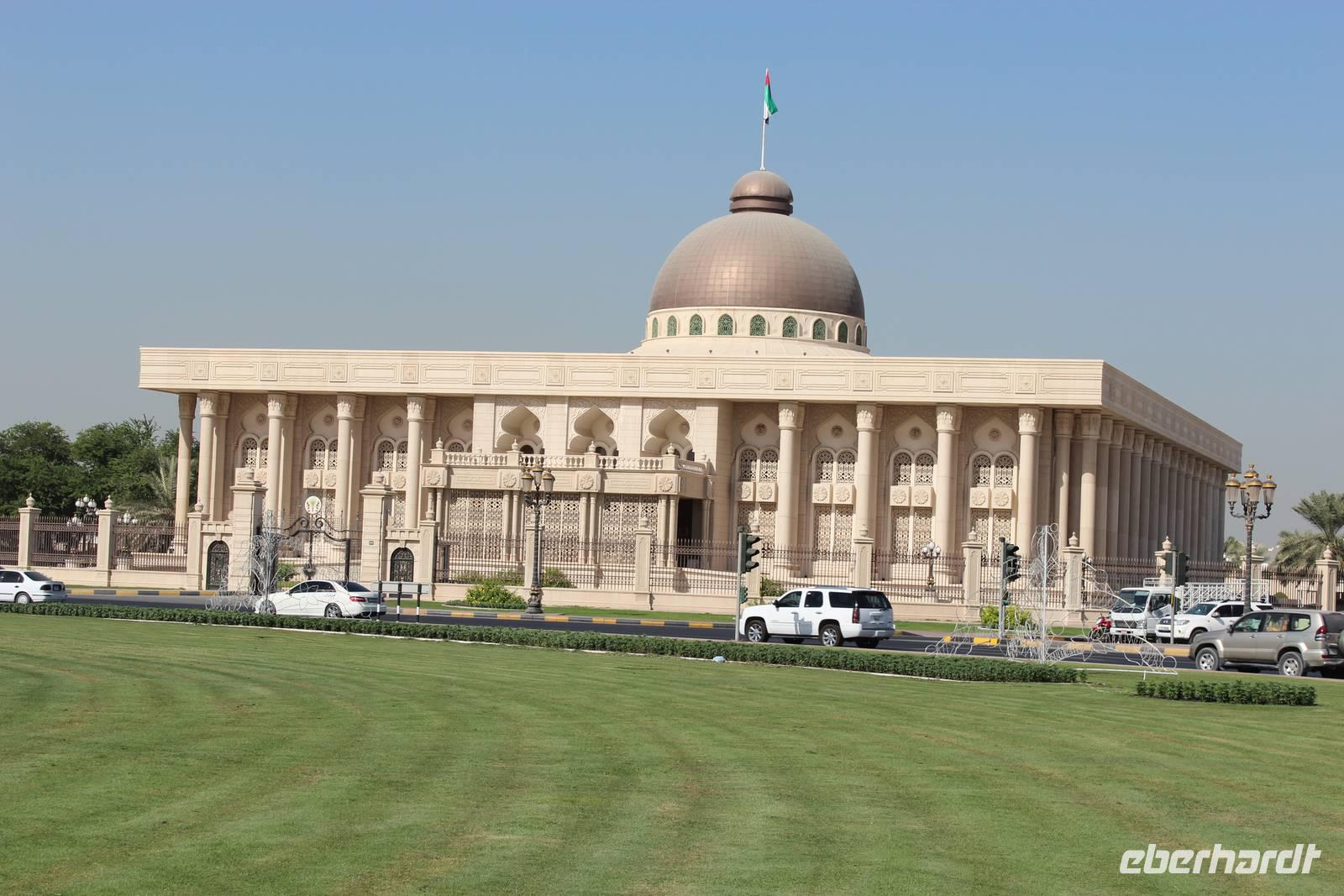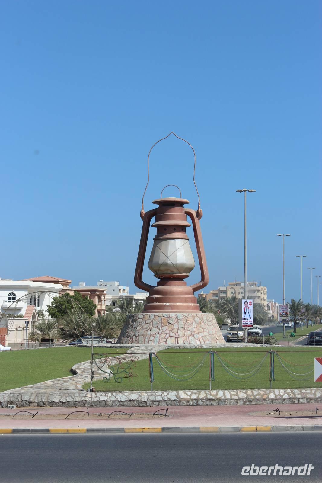 Mit dem Bus fuhren wir heute nach Sharjah. Sharjah ist eines der strengsten Emirate, erklärte uns unsere örtliche Reiseleiterin. Und das merkten wir auch, denn die Strände waren kaum besucht und wenn man jemanden sah, war diese Person nicht in Badekleidung zu sehen. Die Frauen, die man sah, waren größtenteils verhüllt. In Sharjah bestaunten wir den offenen Koran. Dieser ist auf einem Kreisverkehr zu sehen. Danach fuhren wir in das benachbarte Emirat um kurz zu schauen, wie die Strände dort besucht sind, um danach wieder nach Sharjah hinein zu fahren. Wir fuhren auf einen Souk, auf welchem einige von uns handelten. Unser Reisebegleiter half uns dabei ein wenig. Mit einigen Tüchern und Postkarten ging es zurück zum Bus. Weiter ging es zum Fischmarkt. Was war dies für eine große Auswahl an frischem Fisch. Hätten wir hier einen Fisch gekauft, dann hätten wir diesen auch gleich, wie viele andere, entschuppen und entgräten lassen können. Vom Fischmarkt liefen wir über die Straße zum Gemüse- und Obstmarkt, wo es eine ebenso große Auswahl gab. Hier holte uns unser Busfahrer ab und wir fuhren zum Blauen Souk von Sharjah. Hier sahen wir ein Denkmal mit sieben Kugeln, welches die sieben Vereinigten Arabischen Emirate darstellt und deren Vereinigung. Auf der anderen Soukseite waren sieben Arabische Flaggen zu sehen. Im Souk selbst hatten wir wieder die Möglichkeit zu handeln und etwas zu erwerben. Draußen trafen wir uns dann und hatten einen wunderschönen Blick auf die Skyline von Sharjah.