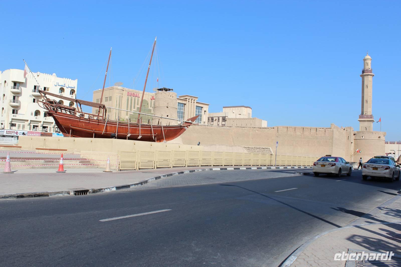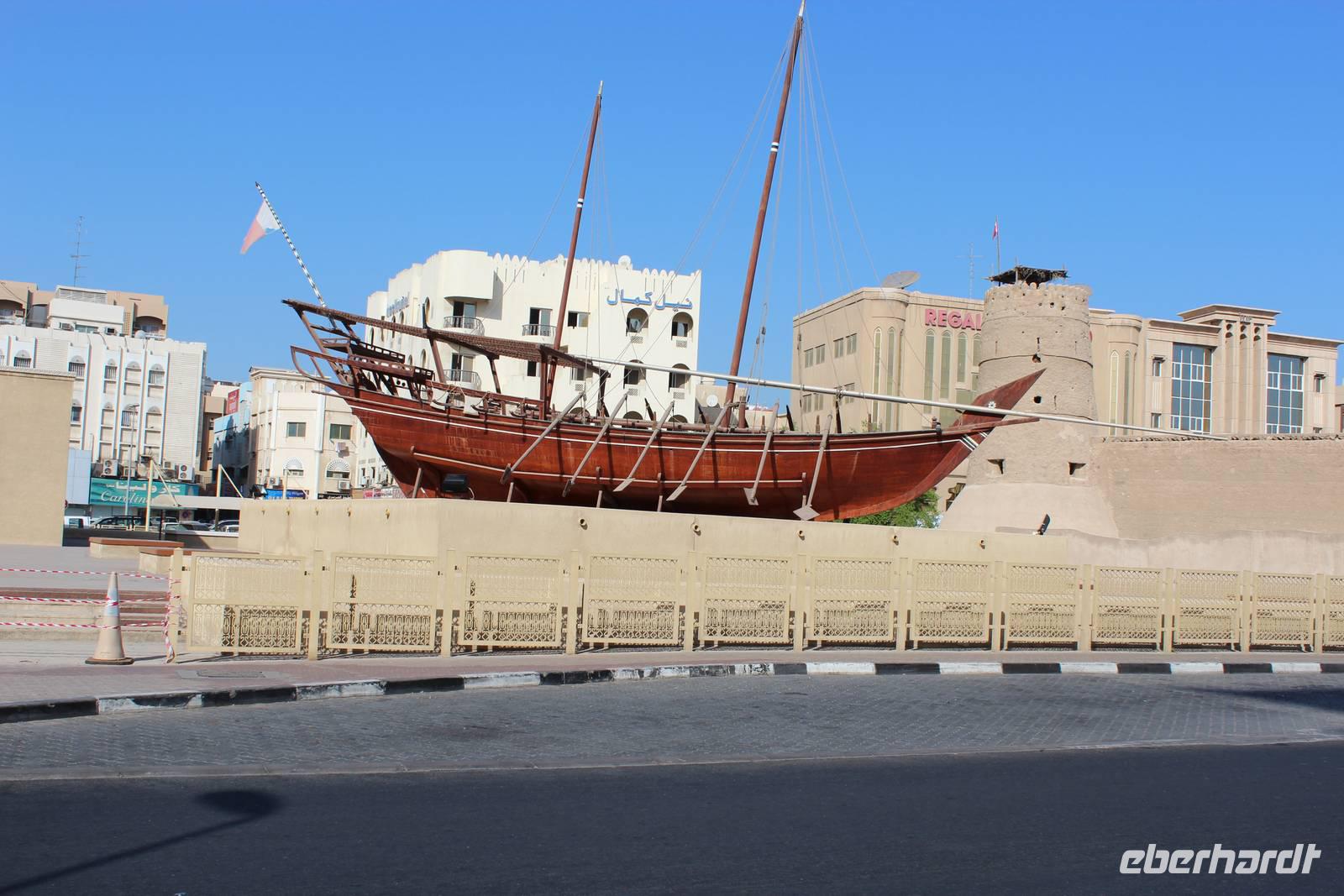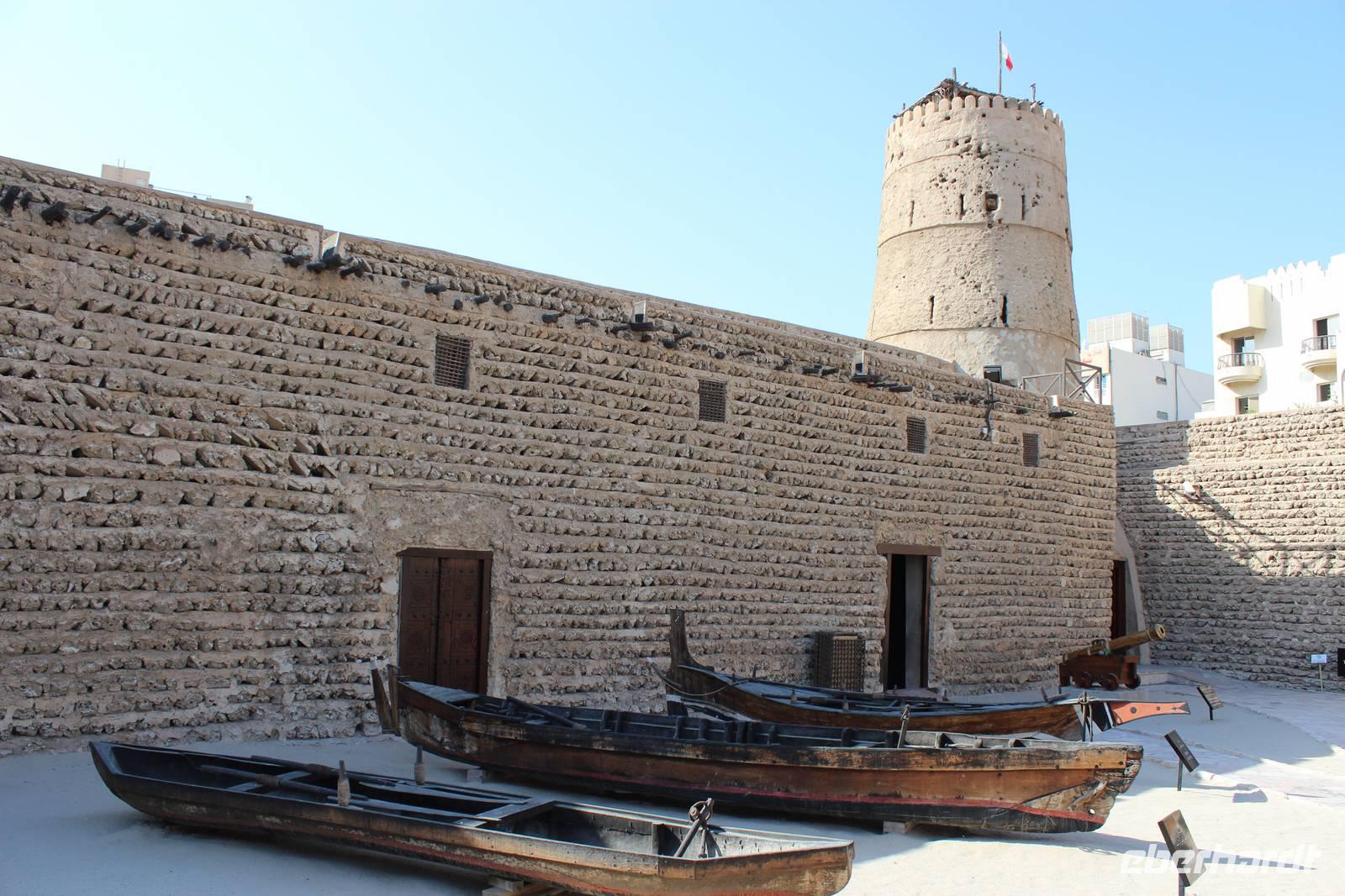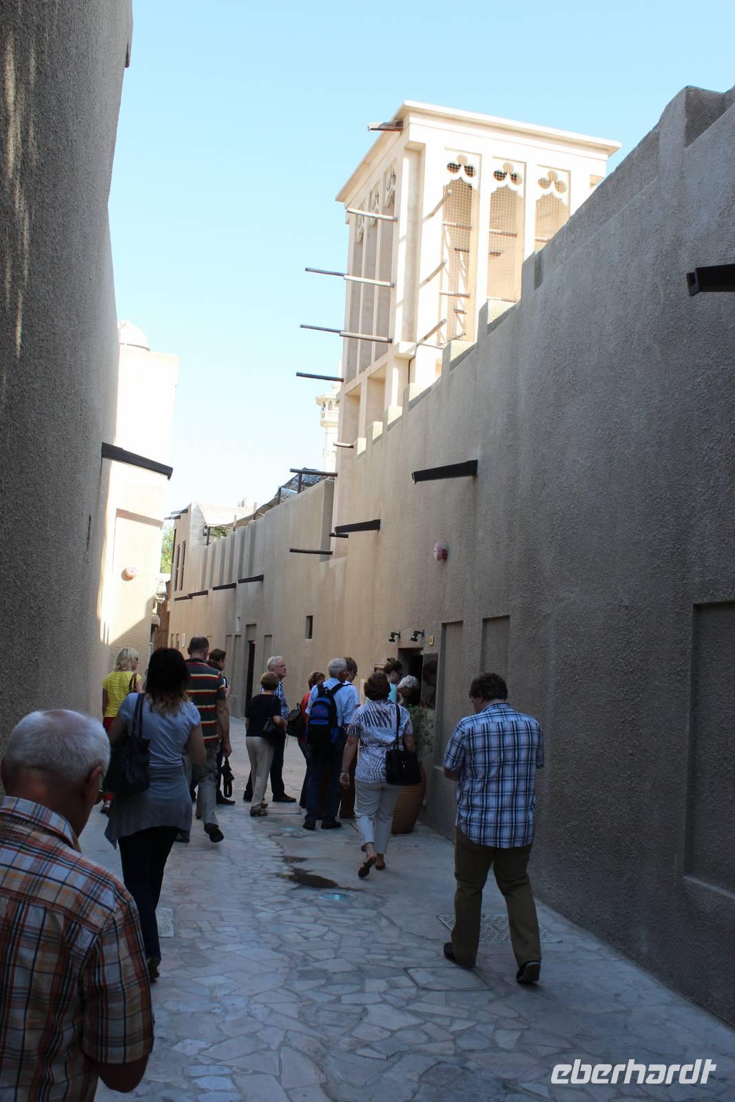 Danach machten wir die Stadtführung durch das Alte Dubai. Wir gingen durch Bastakiya und schauten in die Hinterhöfe hinein, sahen die Reste der alten Stadtmauer und liefen an den Häusern mit den Winddächern vorbei, welche eine Klimaanlage für den Innenraum darstellten. Als nächstes liefen wir zum Dubai Museum, welches direkt vor unserem Hotel lag. Im Innenhof sind die alten Boote, mit denen gefischt wurde, zu sehen und drinnen kann man die Geschichte von Dubai im Zeitraffer sehen. Aber auch alte Musikinstrumente sind ausgestellt.
