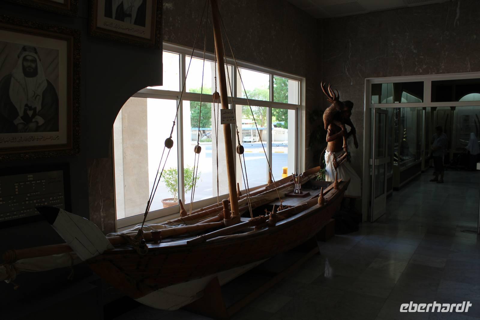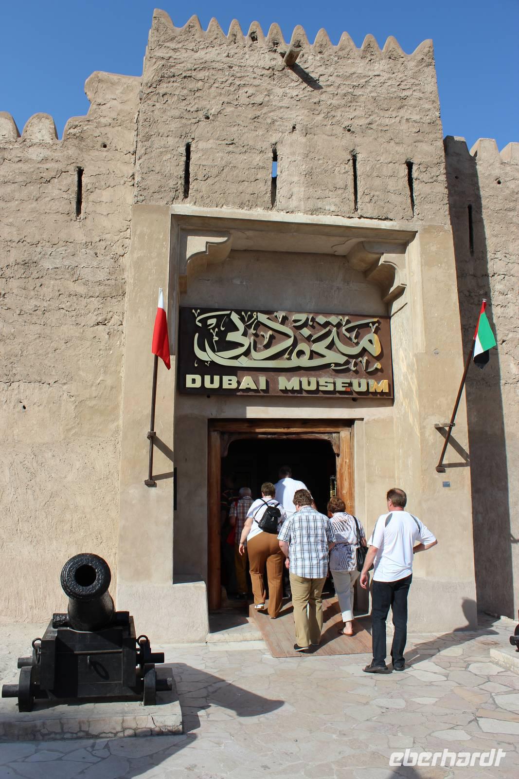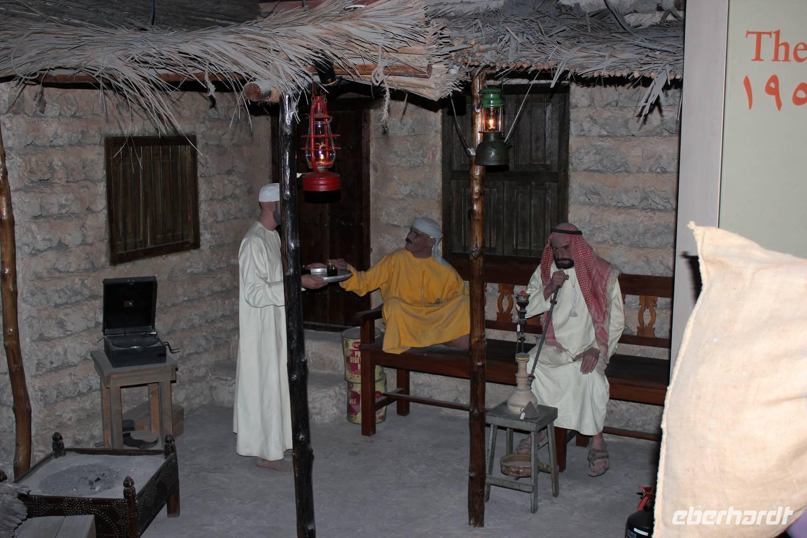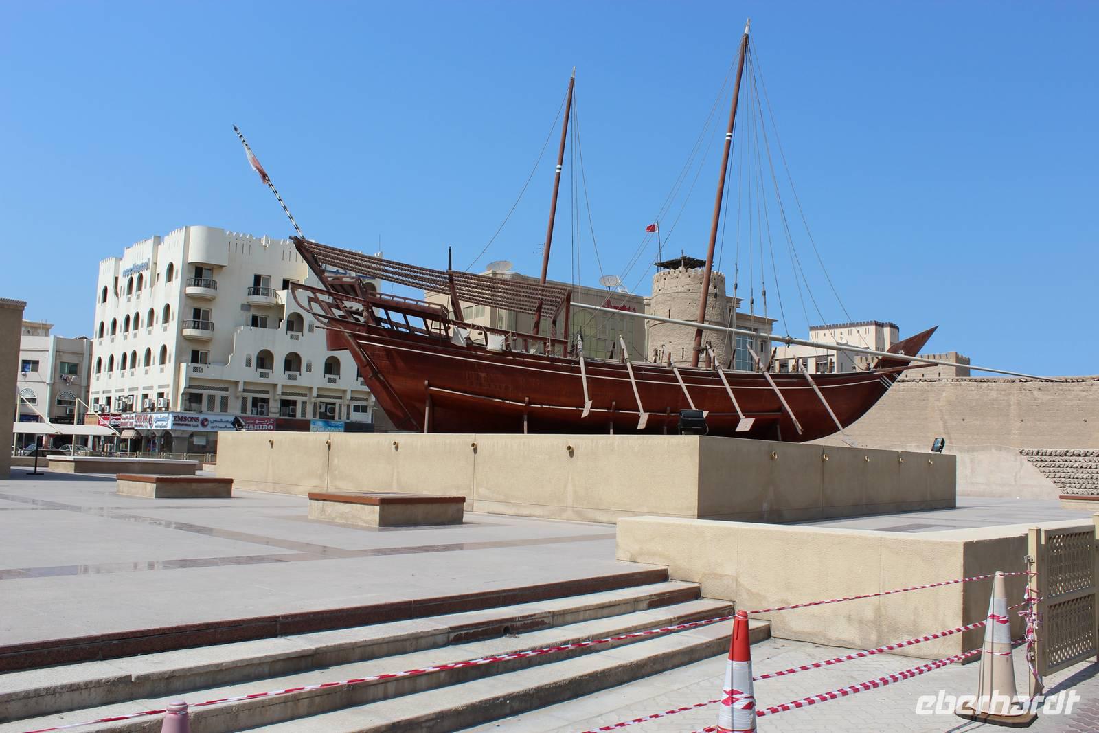 Danach machten wir die Stadtführung durch das Alte Dubai. Wir gingen durch Bastakiya und schauten in die Hinterhöfe hinein, sahen die Reste der alten Stadtmauer und liefen an den Häusern mit den Winddächern vorbei, welche eine Klimaanlage für den Innenraum darstellten. Als nächstes liefen wir zum Dubai Museum, welches direkt vor unserem Hotel lag. Im Innenhof sind die alten Boote, mit denen gefischt wurde, zu sehen und drinnen kann man die Geschichte von Dubai im Zeitraffer sehen. Aber auch alte Musikinstrumente sind ausgestellt.