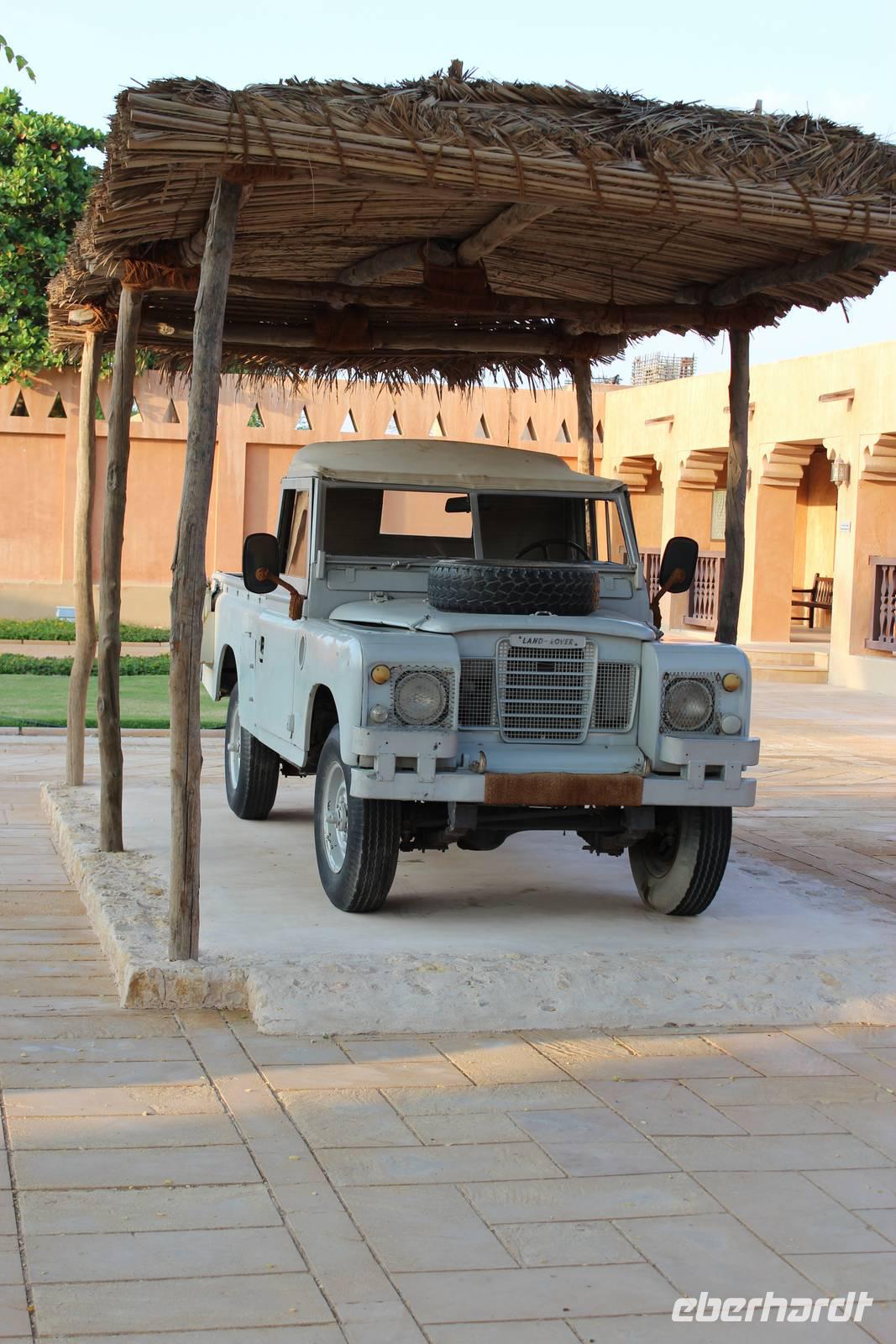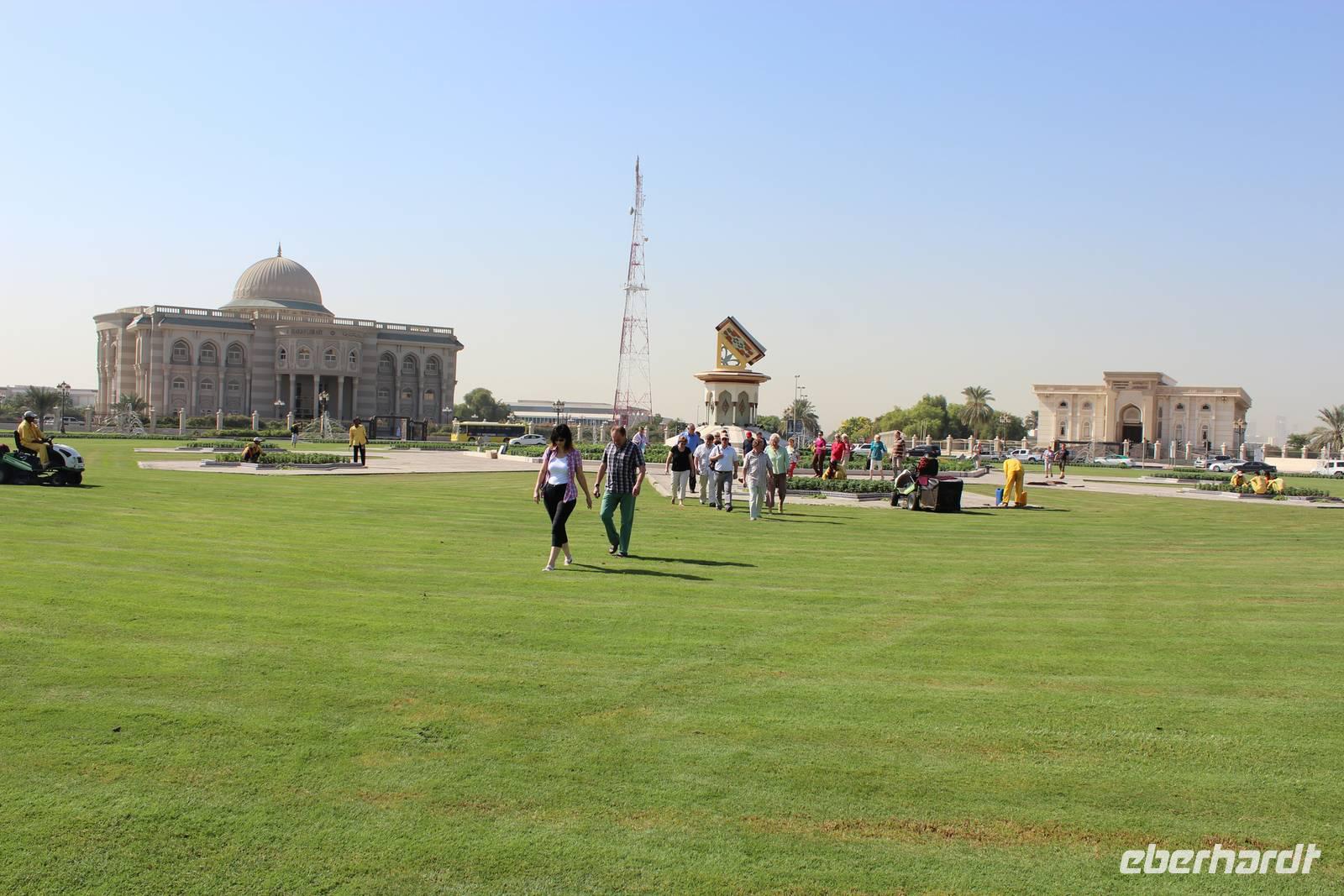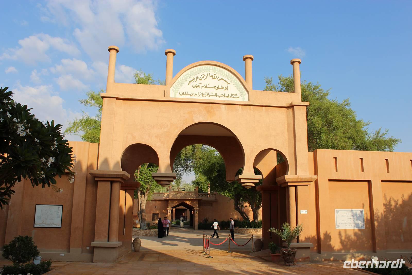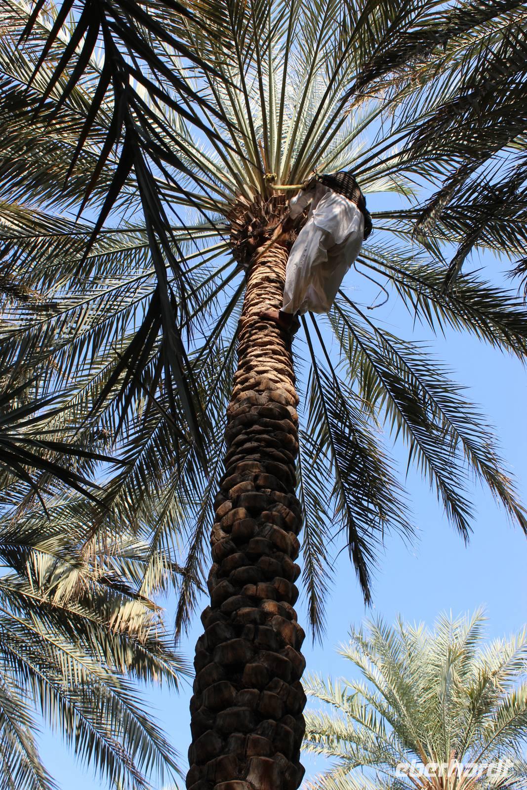 Danach fuhren wir in einen Park, wo wir ein wenig spazieren konnten, bevor es weiter zum Kamelmarkt ging. Auf dem Kamelmarkt konnten wir die verschiedenen Arten von Kamelen sehen mit jüngeren und älteren Tieren. Mit dem Bus fuhren wir einige Meter zur Mall, wo wir etwas zum Mittag aßen. Als nächstes fuhren wir zur Oase, in der wir einen kurzen Spaziergang machten, dann sahen wir einem Palmenkletterer zu, wie er in Sekundenschnelle ganz oben war. Unser Reisebegleiter versuchte, es ihm nach zu machen und schaffte es fast bis ganz hoch. Doch leider nur fast, denn nach gut einem Meter war Schluss für ihn. Dann zeigte uns unsere örtliche Reiseleiterin ihr Können und hing ohne größere Schwierigkeiten an der Palme. Nach einem kurzen Spaziergang gingen wir zum Al Ain Museum, welches gleich neben der Oase liegt und besichtigten dieses. Die letzte Busfahrt für heute führte uns zum ehemaligen Mohammed Zayed Palast. Hier hatten wir die Möglichkeit einmal zu sehen und zu erfahren wie der damalige Sheikh Mohammed gelebt hatte. Im Palast waren auch seine gesamten Söhne auf Bildern dargestellt und sein erster Jeep ausgestellt.