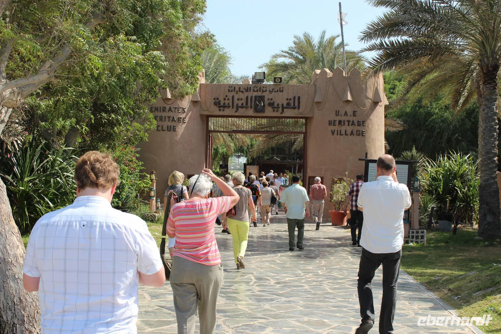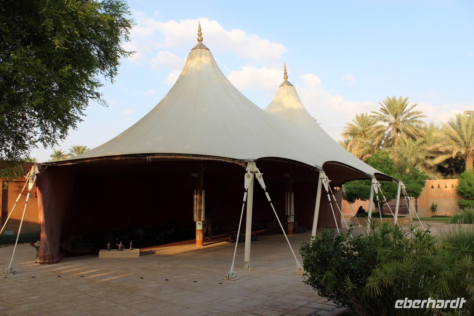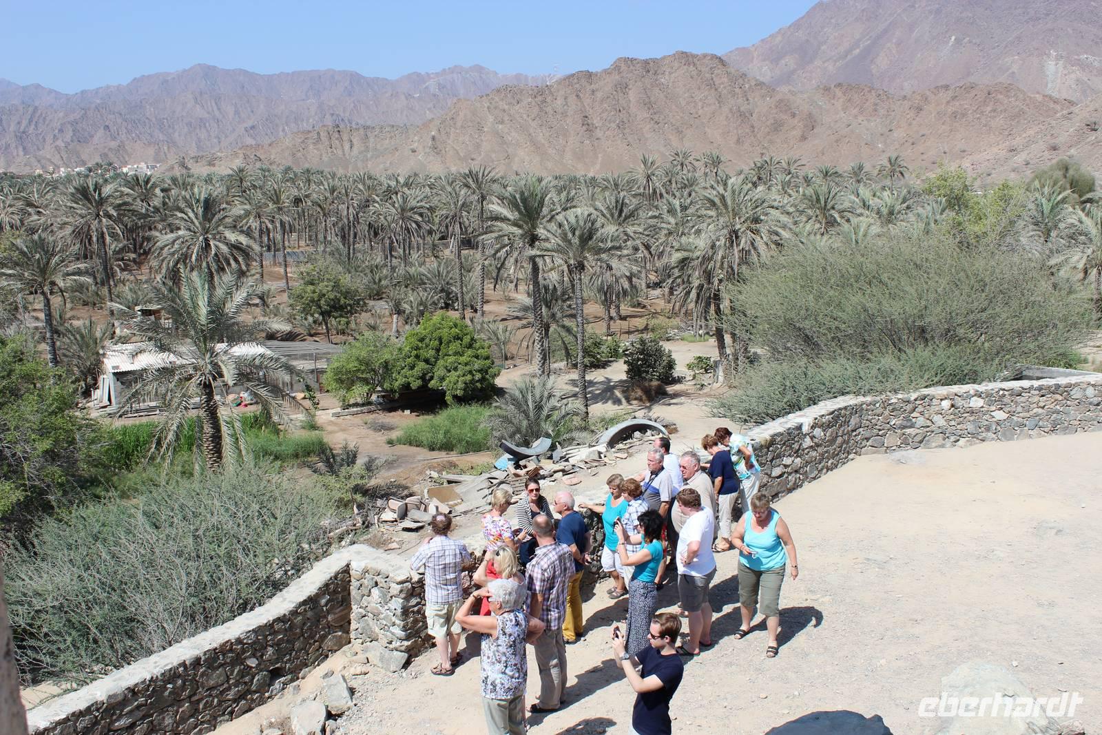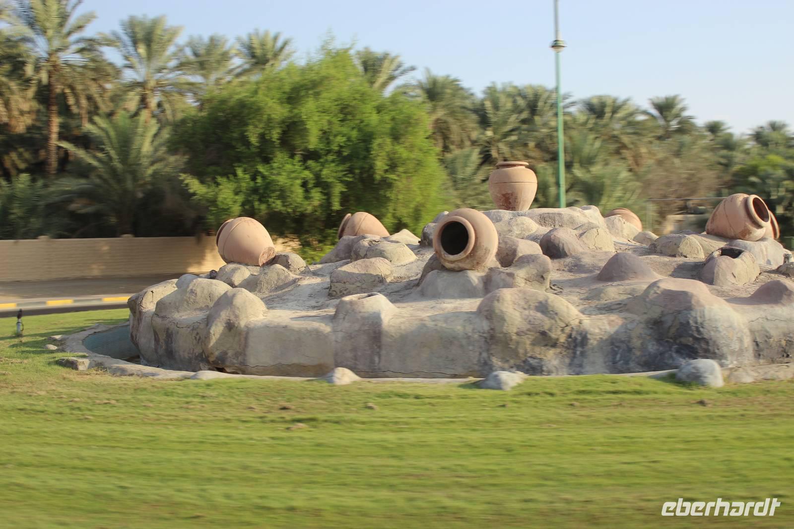 Danach fuhren wir in einen Park, wo wir ein wenig spazieren konnten, bevor es weiter zum Kamelmarkt ging. Auf dem Kamelmarkt konnten wir die verschiedenen Arten von Kamelen sehen mit jüngeren und älteren Tieren. Mit dem Bus fuhren wir einige Meter zur Mall, wo wir etwas zum Mittag aßen. Als nächstes fuhren wir zur Oase, in der wir einen kurzen Spaziergang machten, dann sahen wir einem Palmenkletterer zu, wie er in Sekundenschnelle ganz oben war. Unser Reisebegleiter versuchte, es ihm nach zu machen und schaffte es fast bis ganz hoch. Doch leider nur fast, denn nach gut einem Meter war Schluss für ihn. Dann zeigte uns unsere örtliche Reiseleiterin ihr Können und hing ohne größere Schwierigkeiten an der Palme. Nach einem kurzen Spaziergang gingen wir zum Al Ain Museum, welches gleich neben der Oase liegt und besichtigten dieses. Die letzte Busfahrt für heute führte uns zum ehemaligen Mohammed Zayed Palast. Hier hatten wir die Möglichkeit einmal zu sehen und zu erfahren wie der damalige Sheikh Mohammed gelebt hatte. Im Palast waren auch seine gesamten Söhne auf Bildern dargestellt und sein erster Jeep ausgestellt.