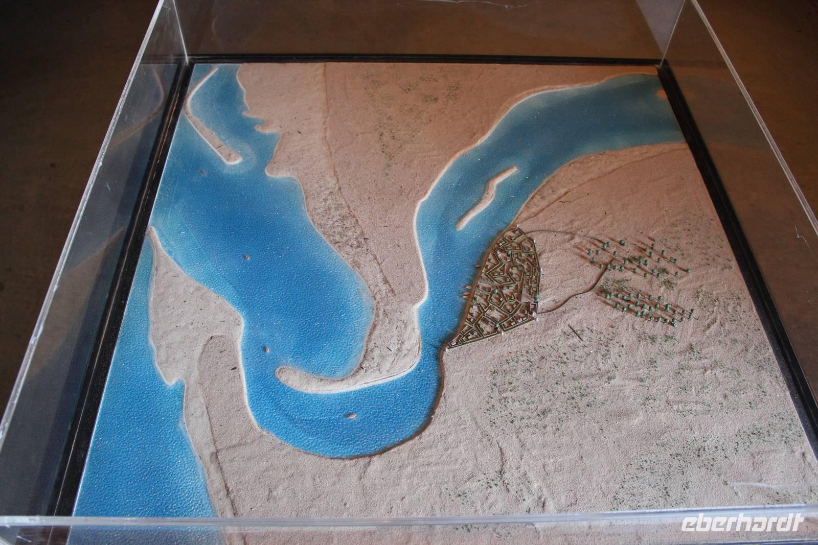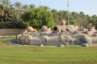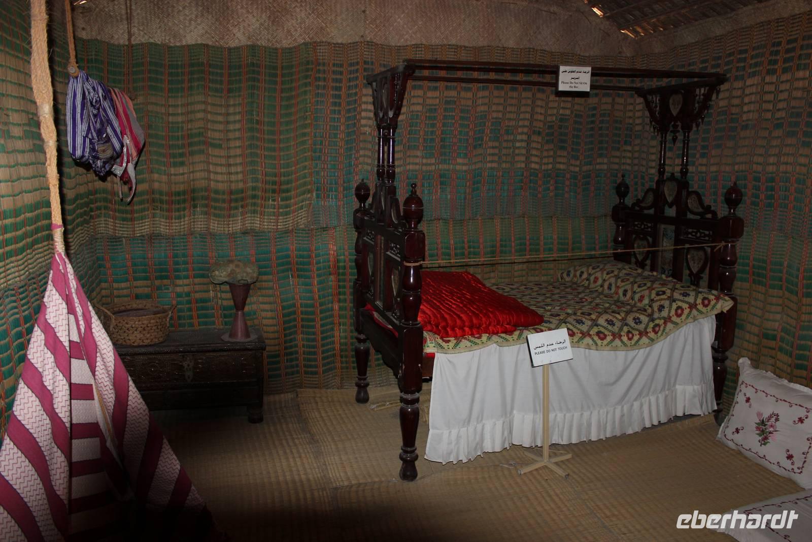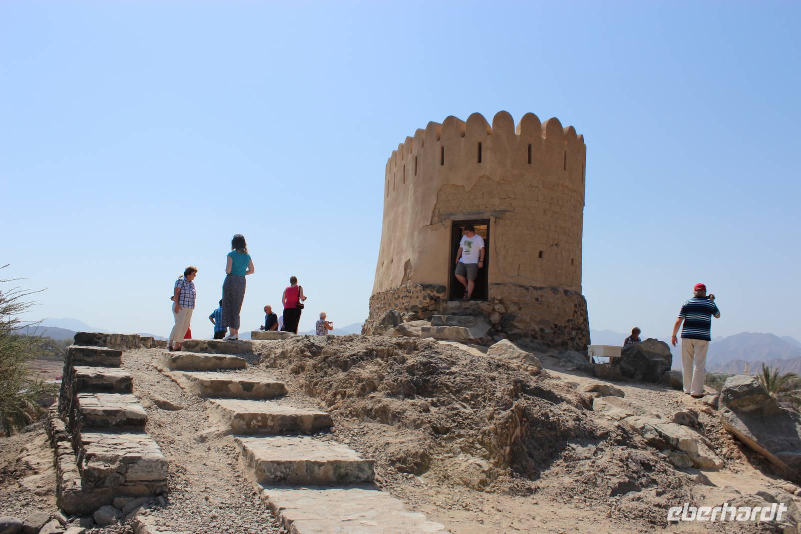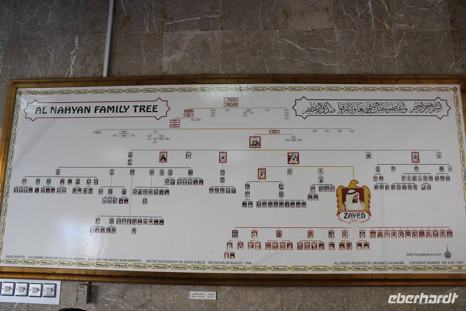 Danach fuhren wir in einen Park, wo wir ein wenig spazieren konnten, bevor es weiter zum Kamelmarkt ging. Auf dem Kamelmarkt konnten wir die verschiedenen Arten von Kamelen sehen mit jüngeren und älteren Tieren. Mit dem Bus fuhren wir einige Meter zur Mall, wo wir etwas zum Mittag aßen. Als nächstes fuhren wir zur Oase, in der wir einen kurzen Spaziergang machten, dann sahen wir einem Palmenkletterer zu, wie er in Sekundenschnelle ganz oben war. Unser Reisebegleiter versuchte, es ihm nach zu machen und schaffte es fast bis ganz hoch. Doch leider nur fast, denn nach gut einem Meter war Schluss für ihn. Dann zeigte uns unsere örtliche Reiseleiterin ihr Können und hing ohne größere Schwierigkeiten an der Palme. Nach einem kurzen Spaziergang gingen wir zum Al Ain Museum, welches gleich neben der Oase liegt und besichtigten dieses. Die letzte Busfahrt für heute führte uns zum ehemaligen Mohammed Zayed Palast. Hier hatten wir die Möglichkeit einmal zu sehen und zu erfahren wie der damalige Sheikh Mohammed gelebt hatte. Im Palast waren auch seine gesamten Söhne auf Bildern dargestellt und sein erster Jeep ausgestellt.