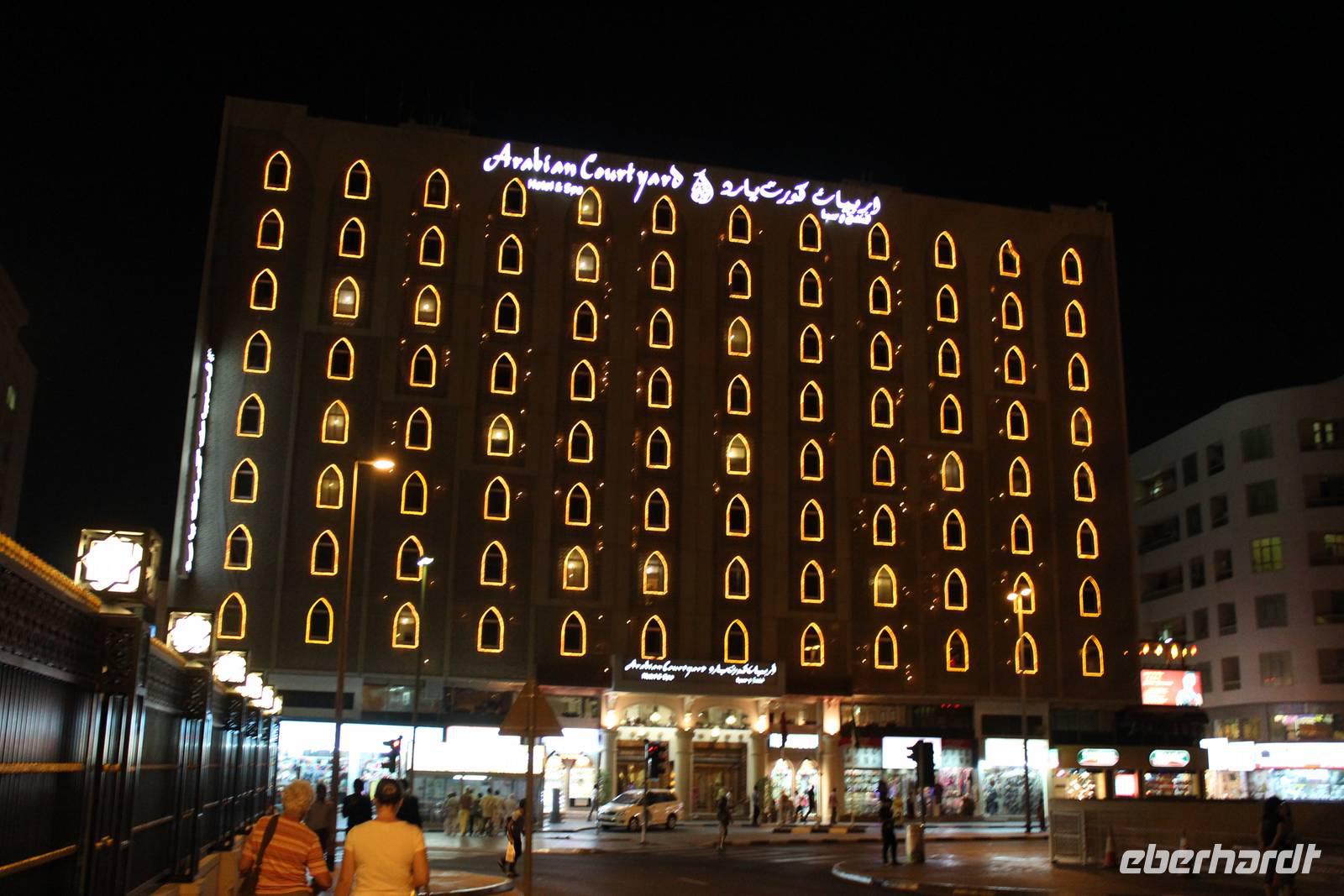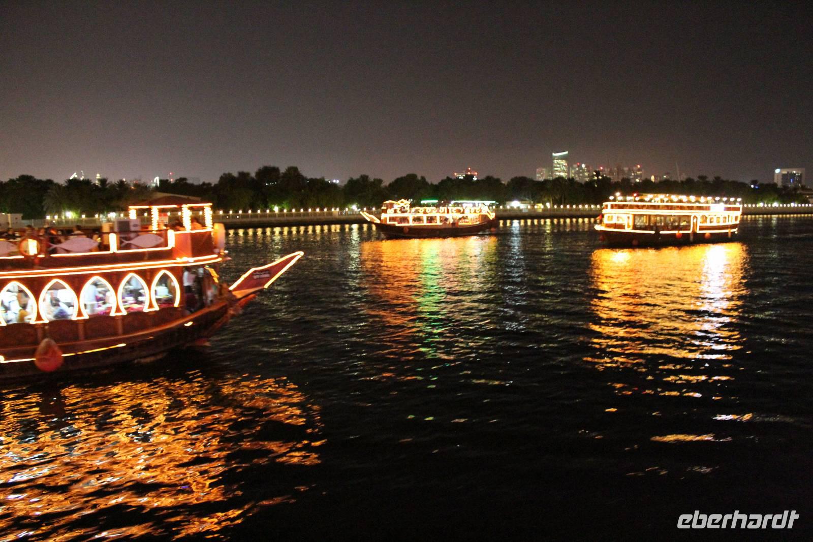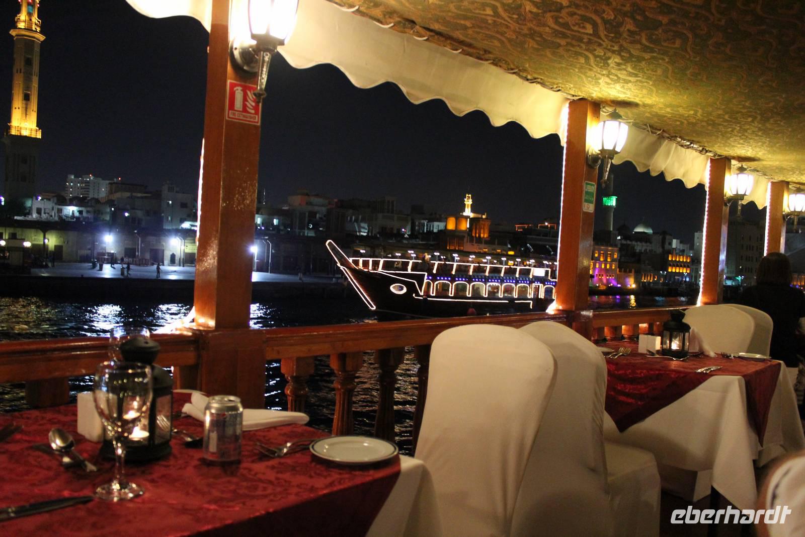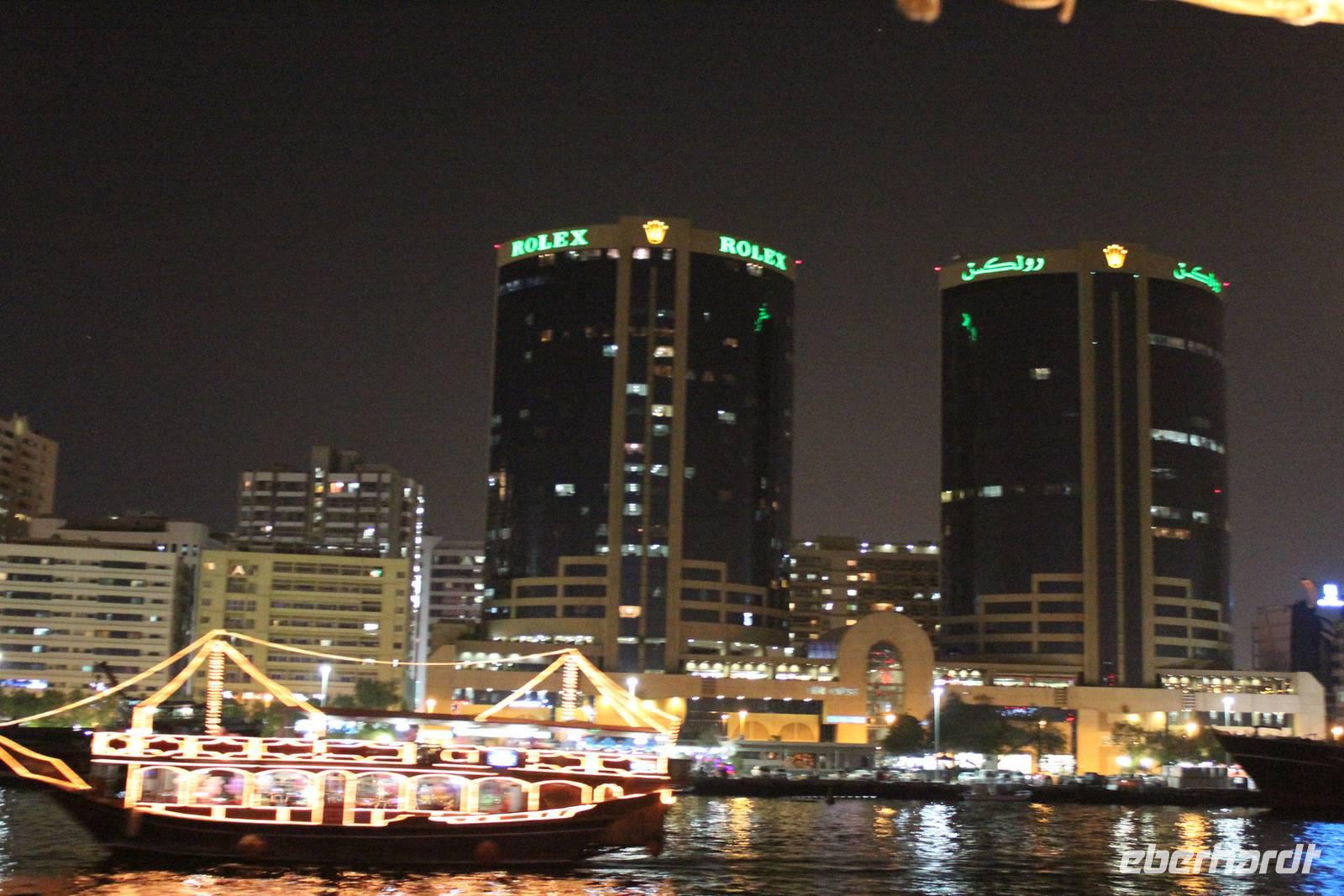 Gegen späten Nachmittag fuhren wir zurück zum Hotel. Unterwegs malte unsere örtliche Reiseleiterin einigen unserer weiblichen Gäste ein Henna Tattoo auf die Hand. Diejenigen, die sie nicht im Bus schaffte, bemalte sie im Hotel. Am Abend ging unser örtlicher Reiseleiter dann mit einigen Gästen noch auf die Dhau Cruise Fahrt. Auf dieser Fahrt konnte man die Uferseiten von Dubai am Abend, beim gemütlichen Abendessen einmal sehen und die schön beleuchteten Schiffe fuhren an unserem vorbei. Nach gut zwei Stunden ging es dann zurück zum Hotel.