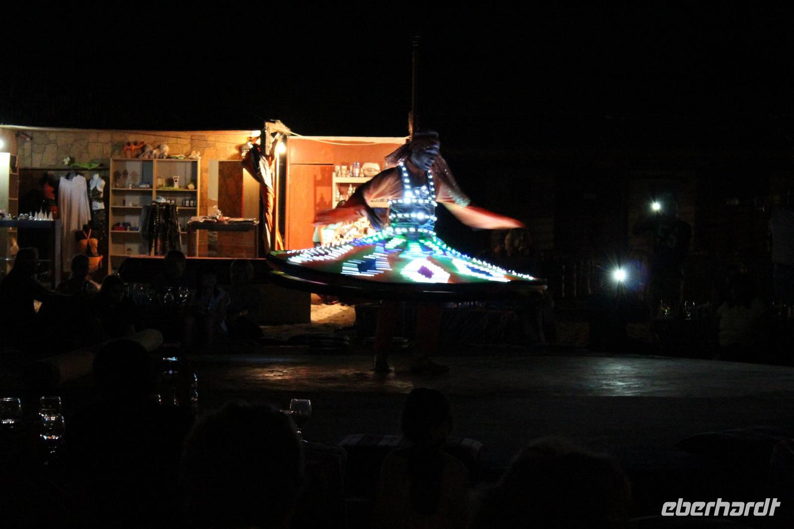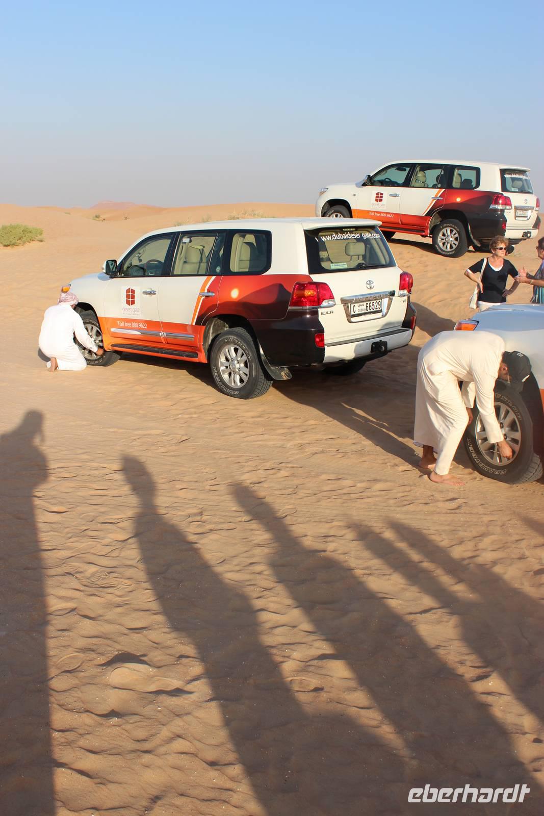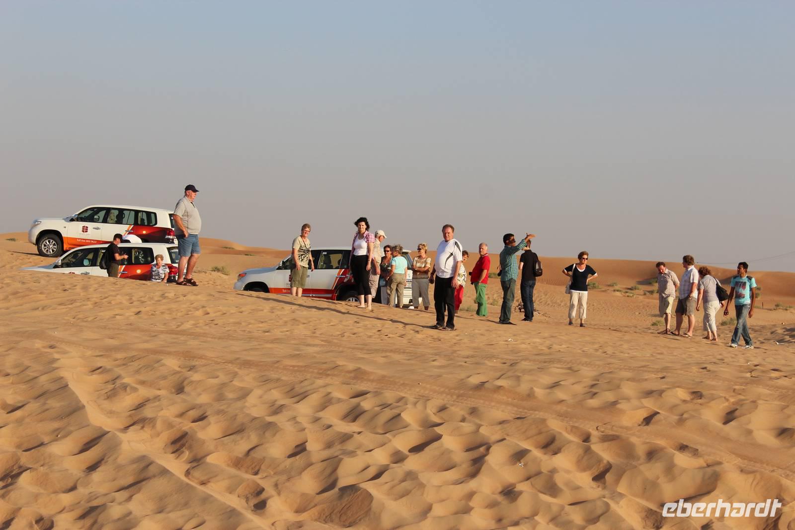 Zurück im Bus fuhren wir in unser Hotel zum Mittagessen, bevor es los ging zur Wüstensafari. Am Nachmittag trafen wir uns vor dem Hotel, wo unser Reisebegleiter eine Überraschung für uns parat hielt. Auf den ersten Blick war er nicht zu erkennen, da er eine traditionelle Kleidung anhatte. Mit dieser fuhr er mit in die Wüste und behielt es den ganzen restlichen Tag an. Wir fuhren mit den Jeeps in die Wüste und machten einen kurzen Stopp. Die Jeepfahrer ließen ein wenig Luft von den Rädern ab, um mehr Grip zu haben. Danach ging die lustige Jeepfahrt los. Wir fuhren über die Dünen, drifteten dabei, der Sand schoss an den Scheiben vorbei und wir dachten ab und zu, dass das Fahrzeug gleich umkippen würde. Im Wüstencamp angekommen, hatten wir die Möglichkeit auf einem Kamel zu reiten, uns beim Sandboarding zu versuchen oder die Frauen konnten sich ein Hennatattoo machen lassen. Bei einem Essen wurden wir mit einer traditionellen Show unterhalten und einige Zeit später mit einem Bauchtanz. Am späten Abend ging es dann mit den Jeeps zurück zum Hotel.