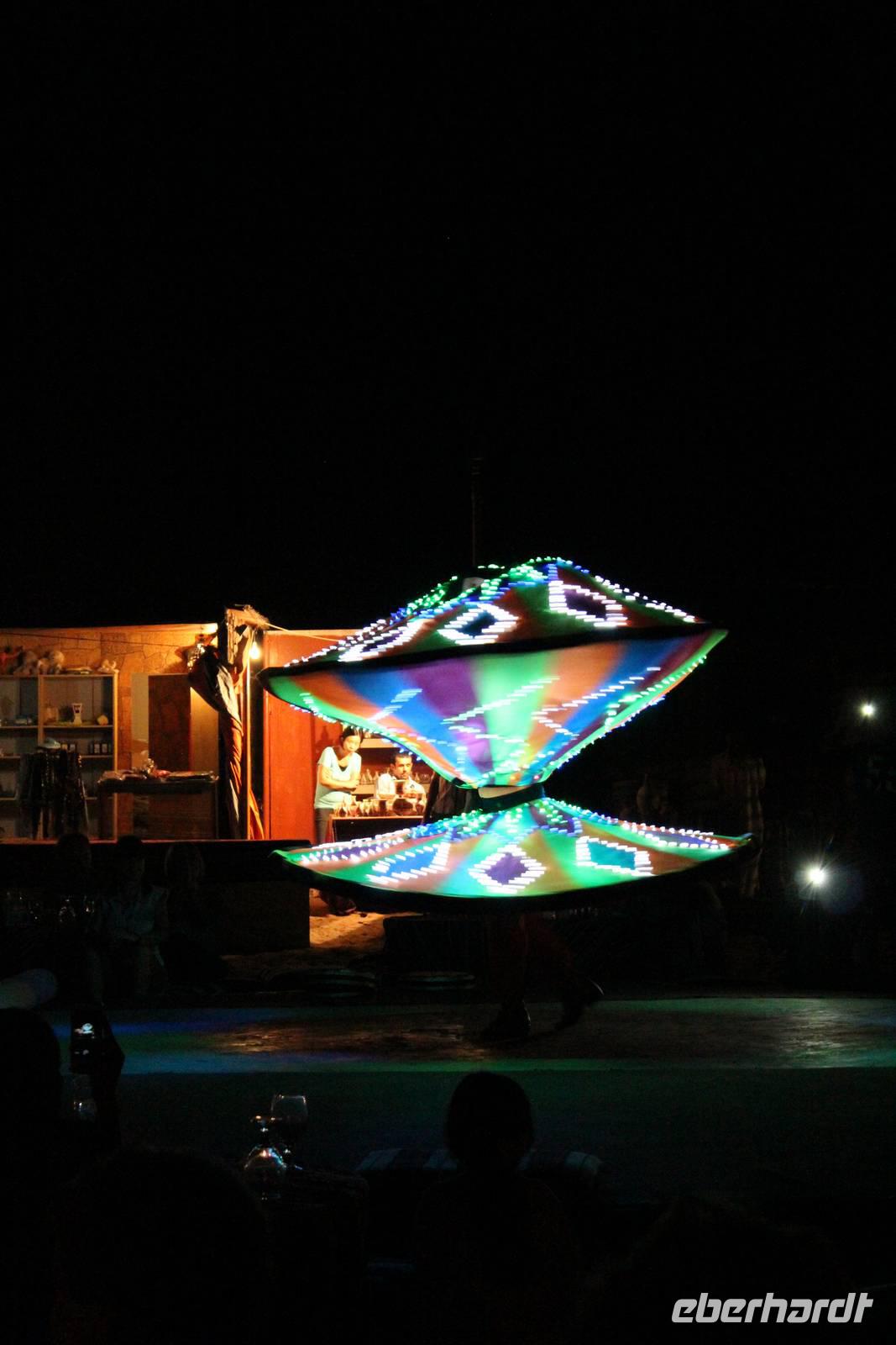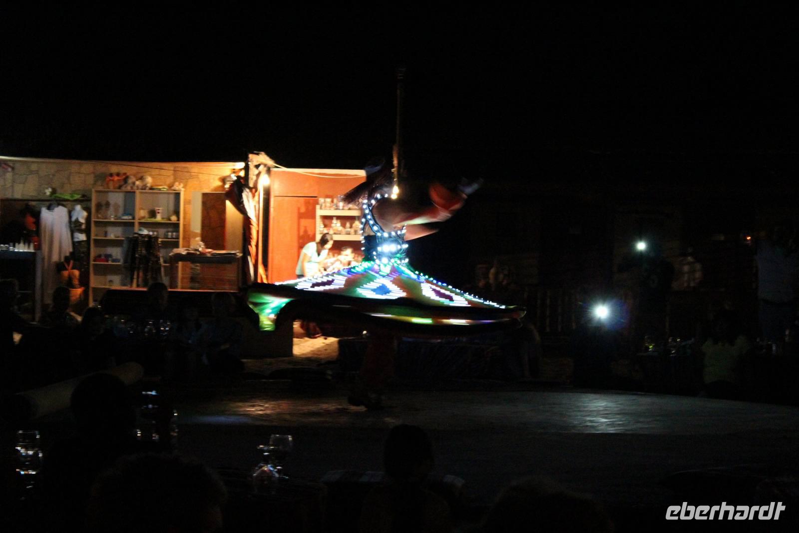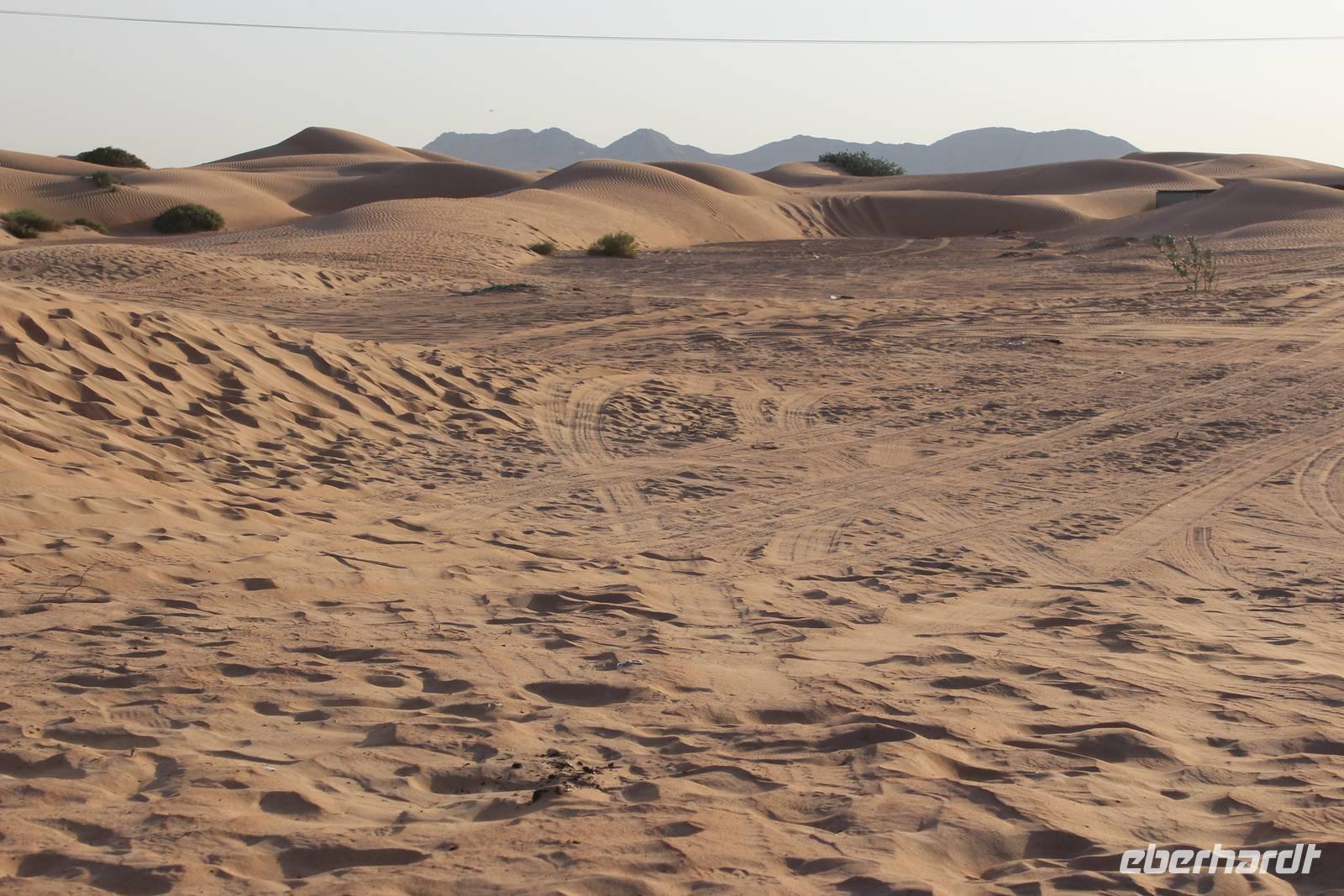 Zurück im Bus fuhren wir in unser Hotel zum Mittagessen, bevor es los ging zur Wüstensafari. Am Nachmittag trafen wir uns vor dem Hotel, wo unser Reisebegleiter eine Überraschung für uns parat hielt. Auf den ersten Blick war er nicht zu erkennen, da er eine traditionelle Kleidung anhatte. Mit dieser fuhr er mit in die Wüste und behielt es den ganzen restlichen Tag an. Wir fuhren mit den Jeeps in die Wüste und machten einen kurzen Stopp. Die Jeepfahrer ließen ein wenig Luft von den Rädern ab, um mehr Grip zu haben. Danach ging die lustige Jeepfahrt los. Wir fuhren über die Dünen, drifteten dabei, der Sand schoss an den Scheiben vorbei und wir dachten ab und zu, dass das Fahrzeug gleich umkippen würde. Im Wüstencamp angekommen, hatten wir die Möglichkeit auf einem Kamel zu reiten, uns beim Sandboarding zu versuchen oder die Frauen konnten sich ein Hennatattoo machen lassen. Bei einem Essen wurden wir mit einer traditionellen Show unterhalten und einige Zeit später mit einem Bauchtanz. Am späten Abend ging es dann mit den Jeeps zurück zum Hotel.