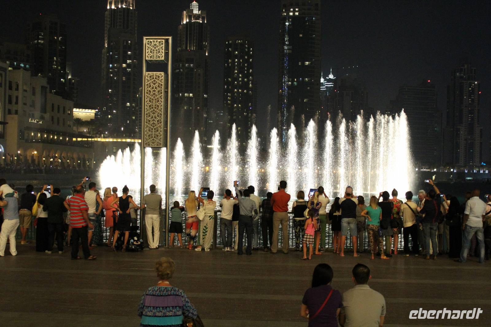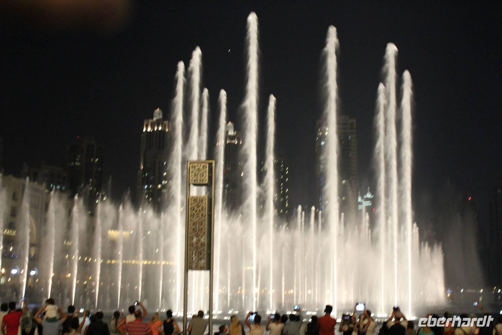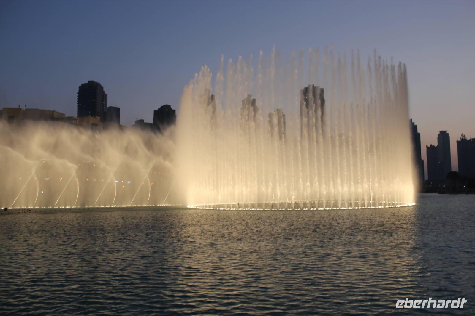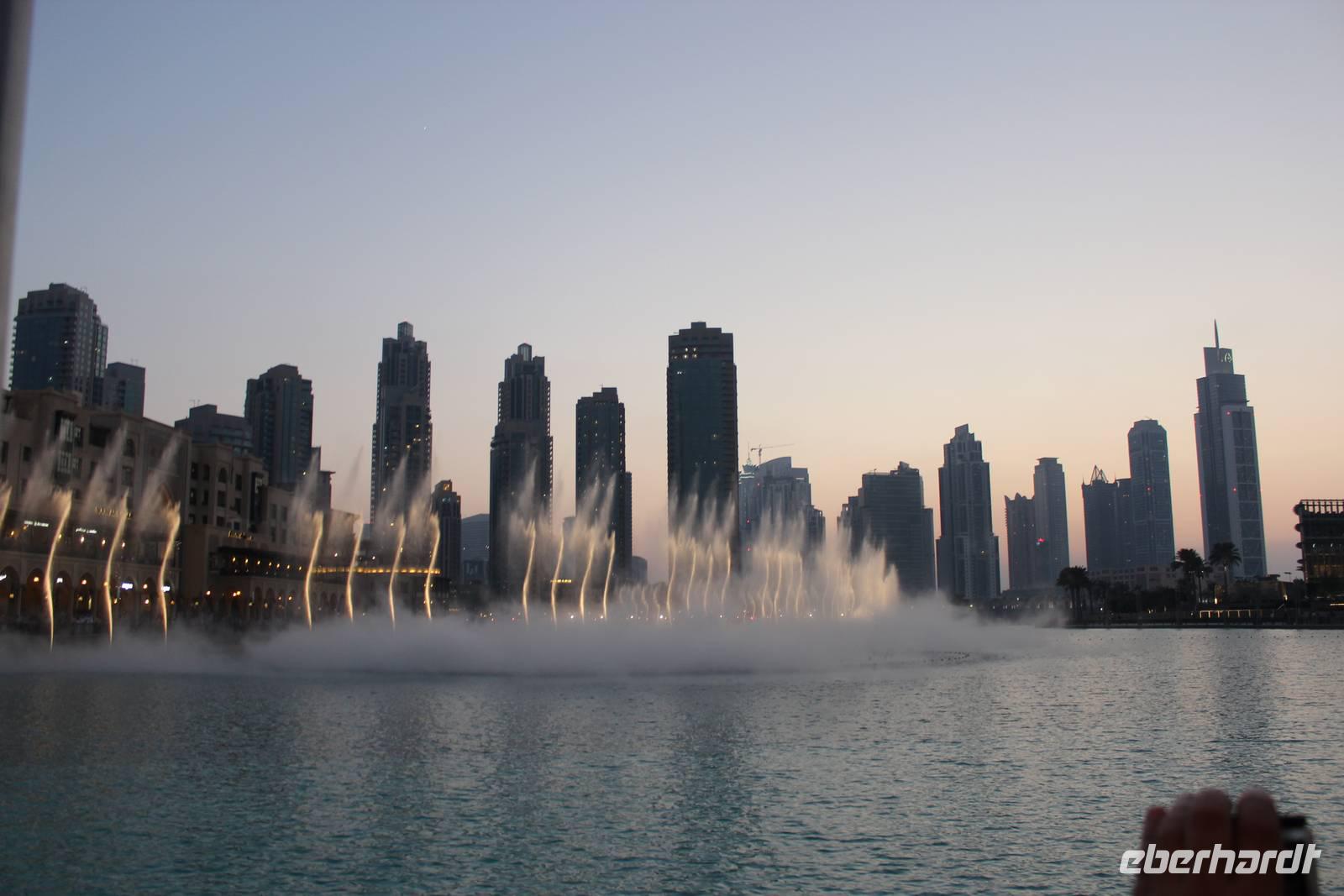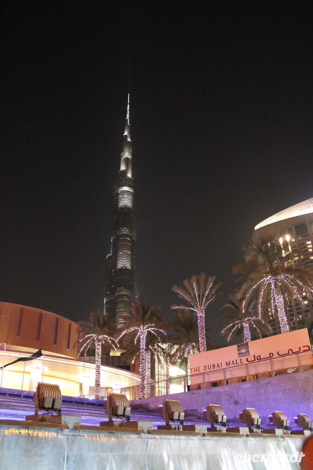 Vom Dubai Marina ging es zur größten Mall der Welt. Über 1200 Geschäfte, eine Eishalle, zwei große Aquarien, und vieles mehr konnte man hier sehen und bestaunen. Nach einem längeren Rundgang durch das Aquarium, durch den Zoo und überhaupt durch die Mall, war es dann auch soweit. Wir stellten uns für die Aussichtplattform auf dem größten Hochhaus der Erde an. Mit 10m die Sekunde fuhren wir die Etagen hinauf auf die 124te Etage. Leider war die Sicht nicht die allerbeste, dennoch hatten wir einen weiten Blick über Dubai. Um 18 Uhr waren wir dann alle draußen vor dem Burj Khalifa und bestaunten die Wasserspiele, das erste lief 18 Uhr, das andere 18:30 Uhr und beide gingen mind. 3 min. Danach fuhren wir von der Dubai Mall zu den Twin Towers wo wir unser Abendmahl auf der Terrasse genossen, mit einem wunderschönen Blick auf den Creek.